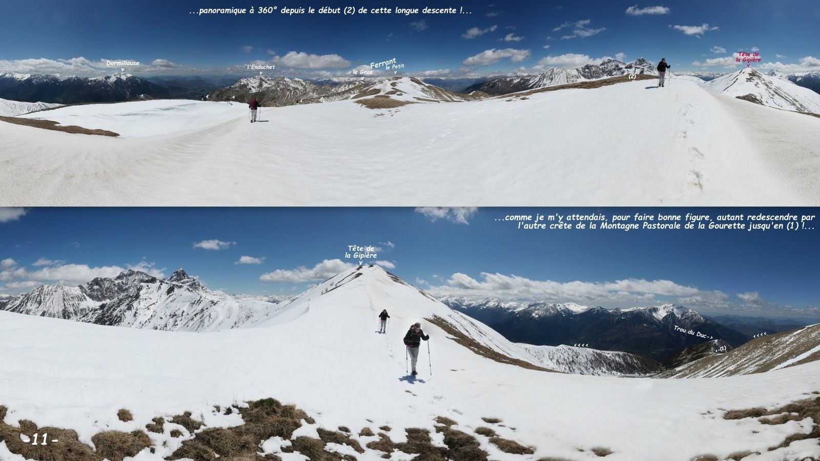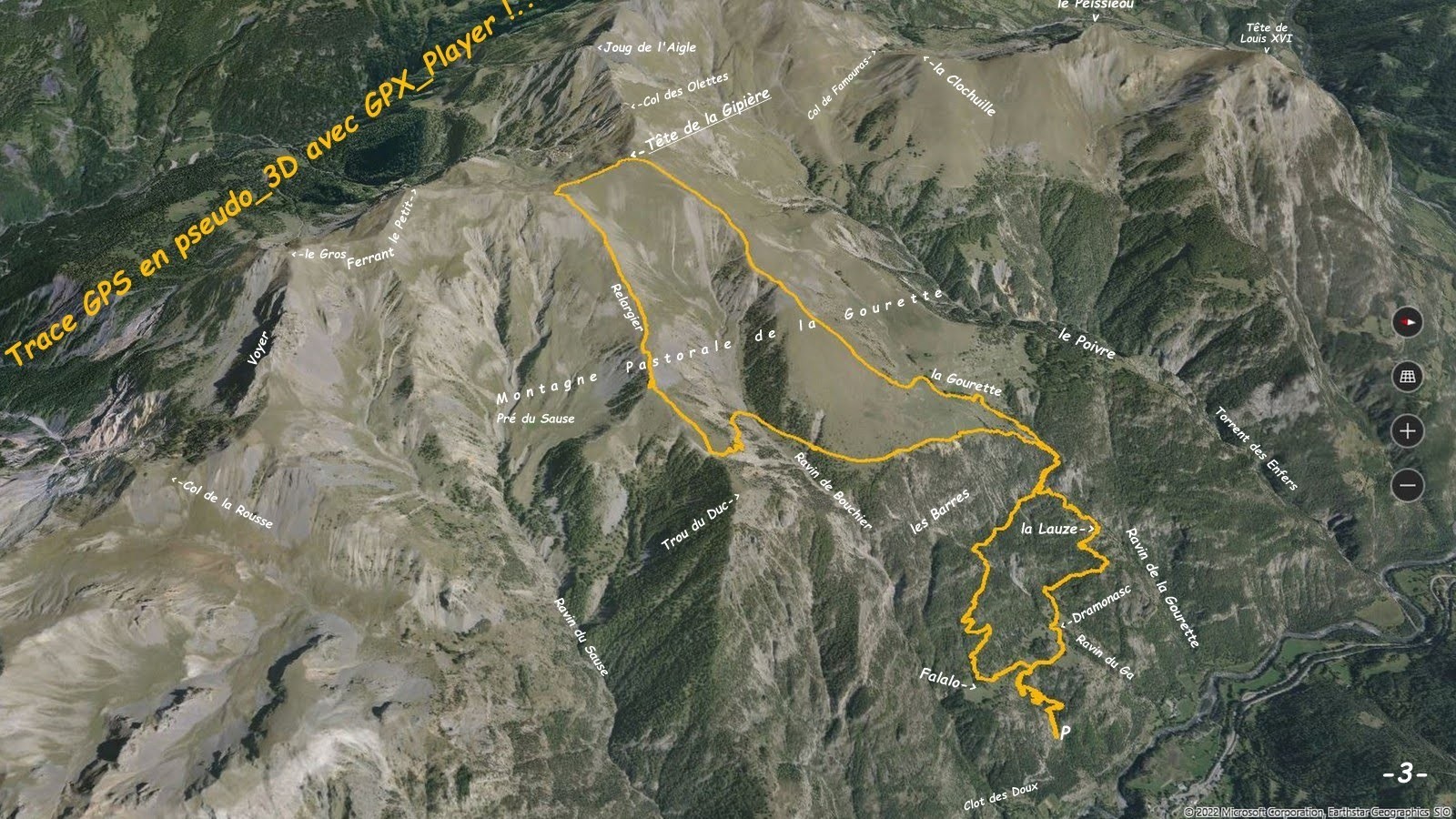 depuis le terminus de la route en terre du Clot des Doux, minuscule parking, à environ 1040m, en prenant bien soin de laisser libre l'aire de retournement > sentier balisé de la Gourette par Dramonasc, la Lauze > en amont de la Gourette poursuivre à vue de manière à rejoindre la crête Sud-Ouest de la Tête de la Gipière et par elle rejoindre tranquillement son sommet > poursuivre la crête sommitale vers le Petit Ferrant jusqu'à la bosse suivante cotée 2413 m > retour par la crête Relargier de la Montagne Pastorale de la Gourette > revenir vers la Gourette par le sentier de Pré du Sause jusqu'à la cote d'environ 1910m d'où il est intéressant de poursuivre par la crête boisée, bonne sente, jusqu'à sa jonction avec le sentier balisé de montée > le suivre en sens inverse jusqu'à sa bifurcation avec le sentier de Champ Contier > le suivre jusqu'à Falalo (attention ce sentier est certes praticable mais très dégradé, relativement escarpé avec beaucoup de murs de soutènement écroulés !) > retour vers Dramonasc avant de couper par un bref raccourci > retour parking par le sentier de montée.