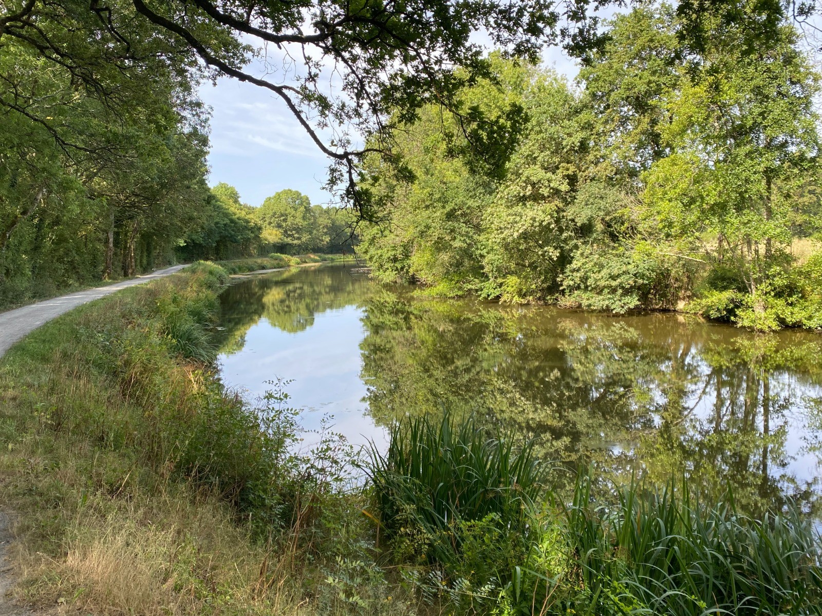 Chemin de halage très ombragé et emprunté par les cyclistes qui se lancent dans le challenge de faire le canal de Nantes à Brest.