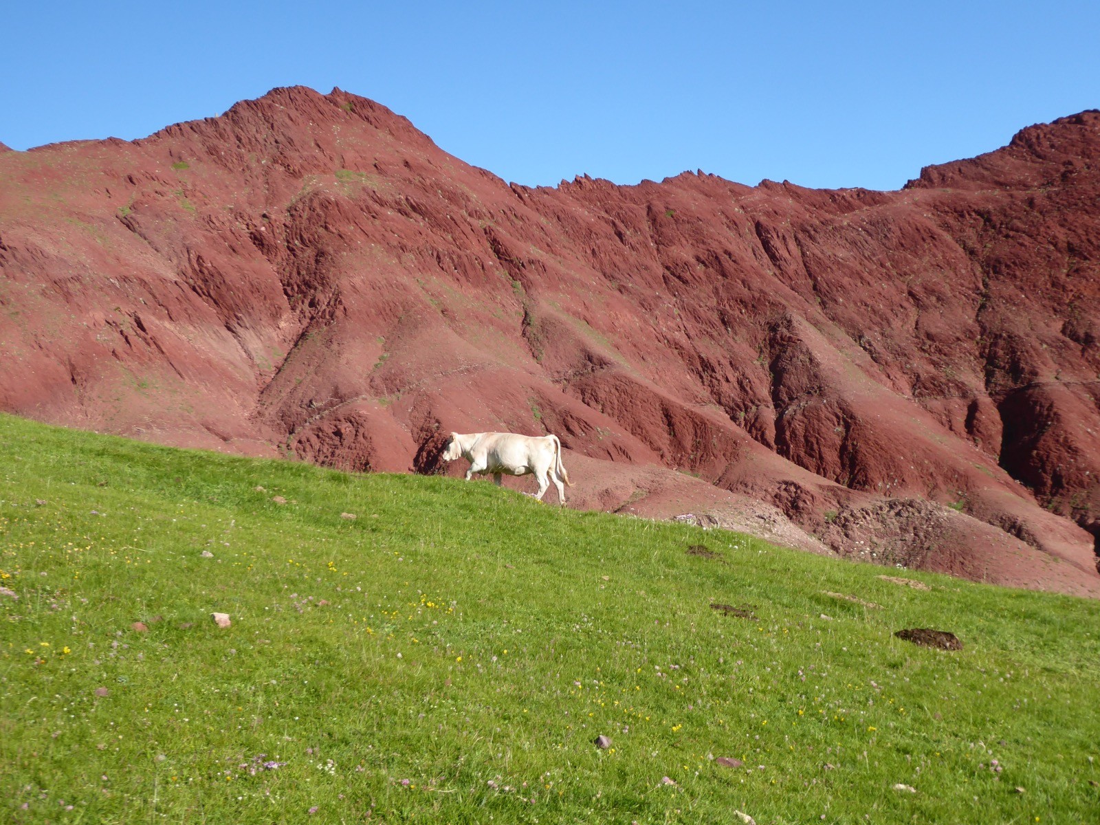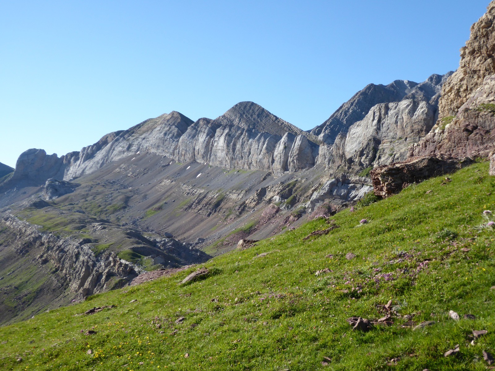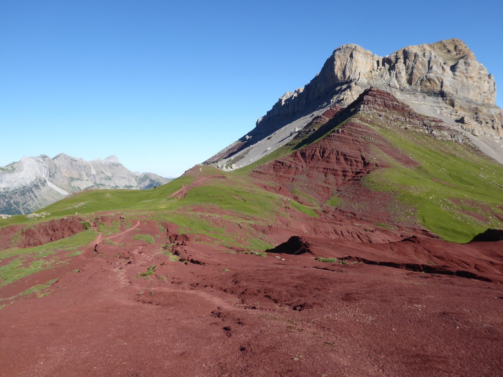 Temps excellent pour cette course dans un environnement extraordinaire.Des teintes rouges et vertes à foison ....et un paysage à couper le souffle.Ce sont des marnes rouges .Ces sédiments contiennent des oxydes de fer(d'où la couleur) et datent du Crétacé(fin secondaire) ou tertiaire (-65 millions d'années)... C'est dans ce type de marnes que l'on trouve des fossiles. Ces terres rouges à tendance gréseuse ne permettent pas l'implantation d'une végétation abondante et s'érodent rapidement.Le tour d'horizon est magnifique: Gabizos,Ossau, Palas,Pic de Soques, Pic d'Anie, Ansabère, Les Trois Rois ,Caperan de Sesques, Billare, Pic d'Enfer etc etc ...Côté Espagnol: Netera, Secus , Crête de Costizada, Peno de Aguërri etc etc . Nous avons vu un percnoptère, des vautours, et surtout les isards : en grand nombre, avec des champs d'iris .Une très belle course avec un peu d'adrénaline pour le passage de la cheminée.Pour montagnards cependant .