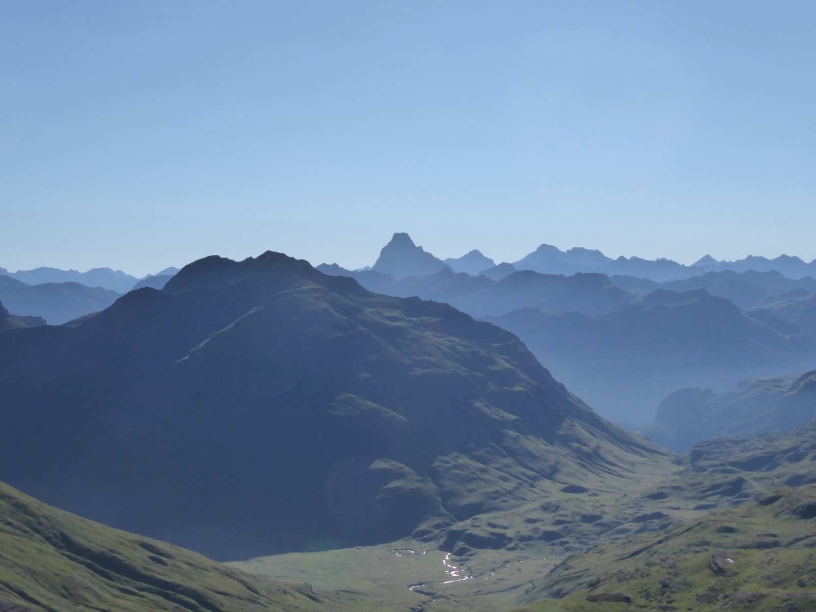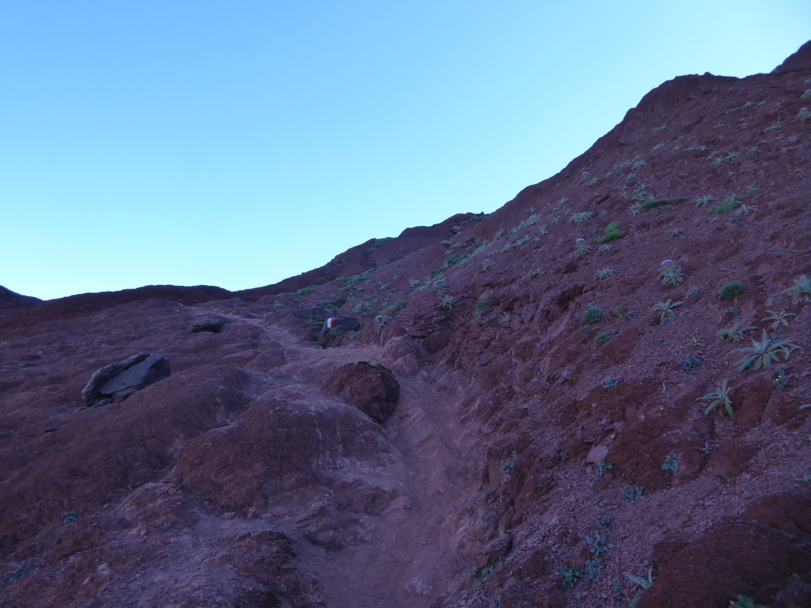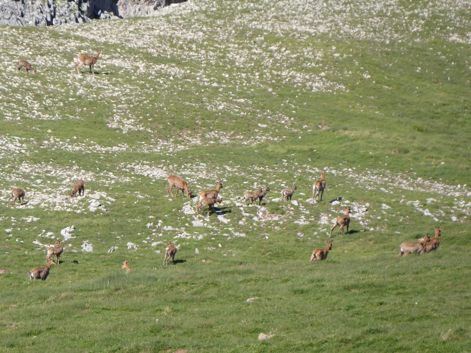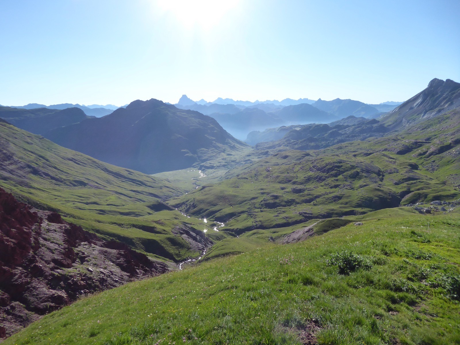 Temps excellent pour cette course dans un environnement extraordinaire.Des teintes rouges et vertes à foison ....et un paysage à couper le souffle.Ce sont des marnes rouges .Ces sédiments contiennent des oxydes de fer(d'où la couleur) et datent du Crétacé(fin secondaire) ou tertiaire (-65 millions d'années)... C'est dans ce type de marnes que l'on trouve des fossiles. Ces terres rouges à tendance gréseuse ne permettent pas l'implantation d'une végétation abondante et s'érodent rapidement.Le tour d'horizon est magnifique: Gabizos,Ossau, Palas,Pic de Soques, Pic d'Anie, Ansabère, Les Trois Rois ,Caperan de Sesques, Billare, Pic d'Enfer etc etc ...Côté Espagnol: Netera, Secus , Crête de Costizada, Peno de Aguërri etc etc . Nous avons vu un percnoptère, des vautours, et surtout les isards : en grand nombre, avec des champs d'iris .Une très belle course avec un peu d'adrénaline pour le passage de la cheminée.Pour montagnards cependant .