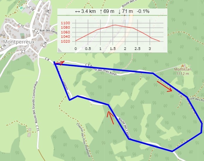 Puis on redescend à travers les champs, sur une route en dur, avec une jolie vue sur Montperreux pour finaliser la boucle.