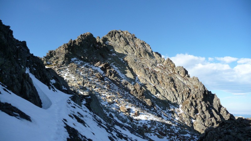 Les derniers mètres se font sur les arrêtes , côté nord d'abord puis côté sud. C'est le passage le plus difficile (coté R3 sur bivouak), mais délicat s'il reste une peu de glace.