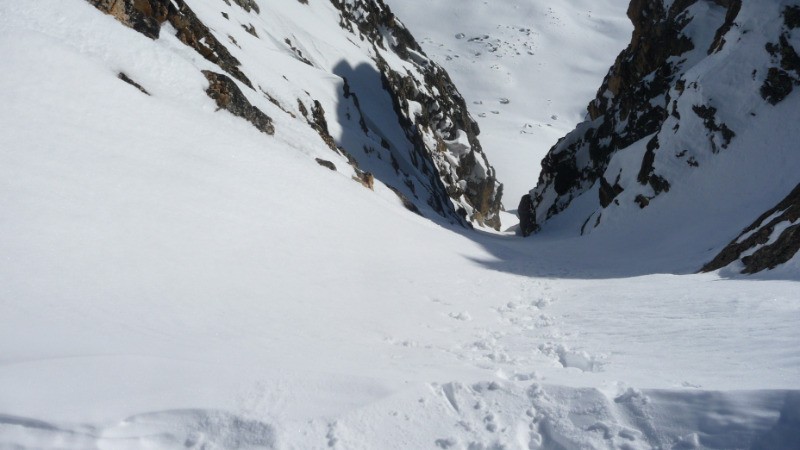 lacs de la Casse Blanche (2681) au pied d'un superbe cirque. S'engager alors dans la grande pente SE, le Couloir étroit Sud Est est le couloir central, il est obstrué à son milieu par un gros rocher. Pour le franchir , passer soit à droite avec un peu d'escalade, soit à gauche en passant sous le bloc coincé.