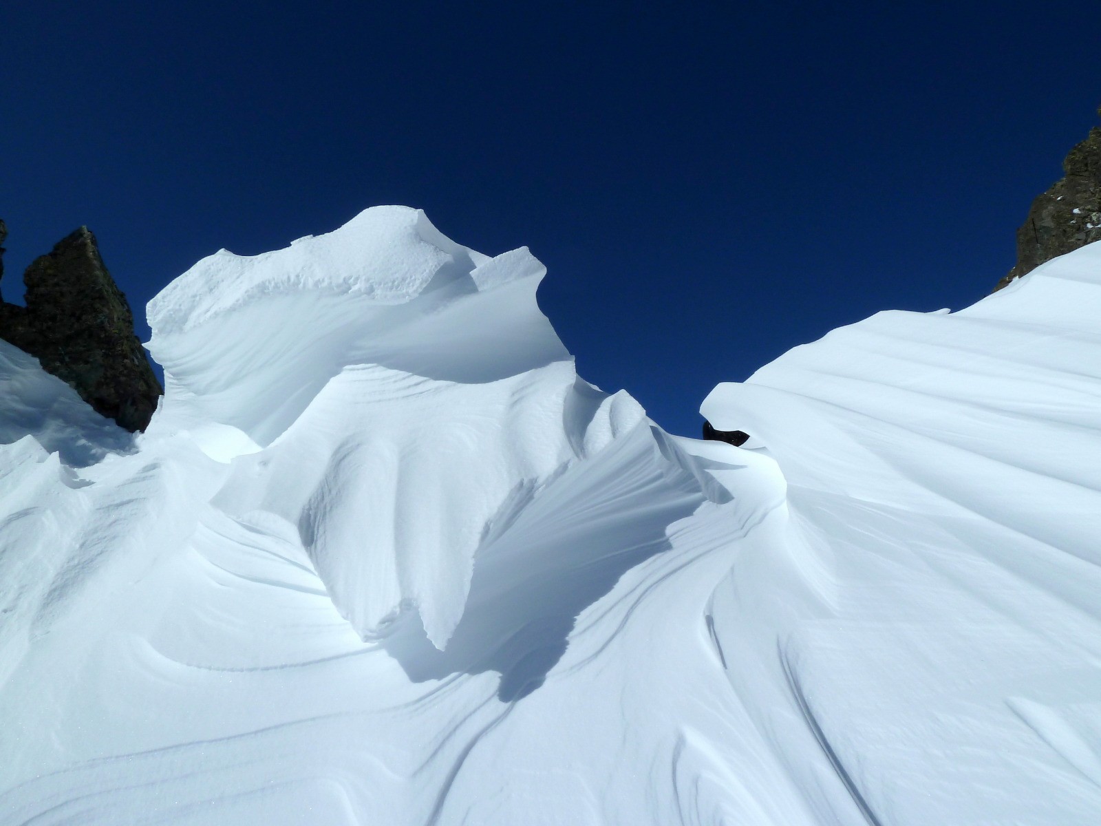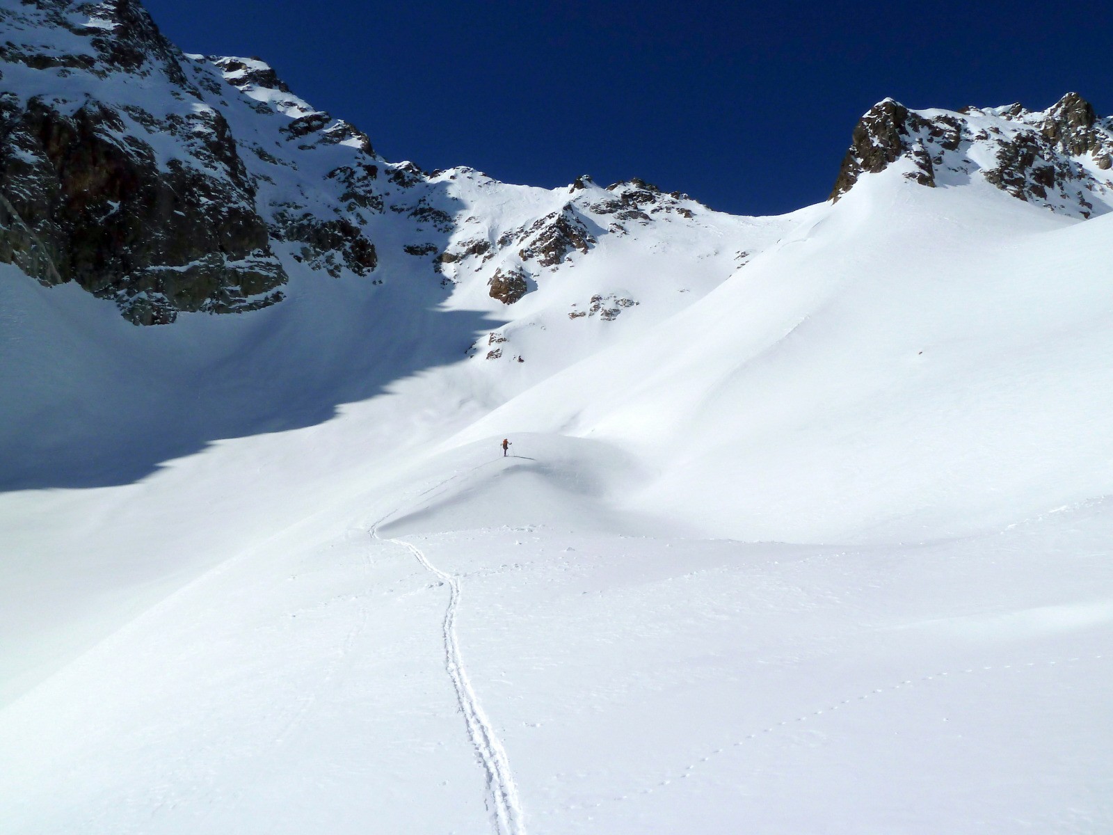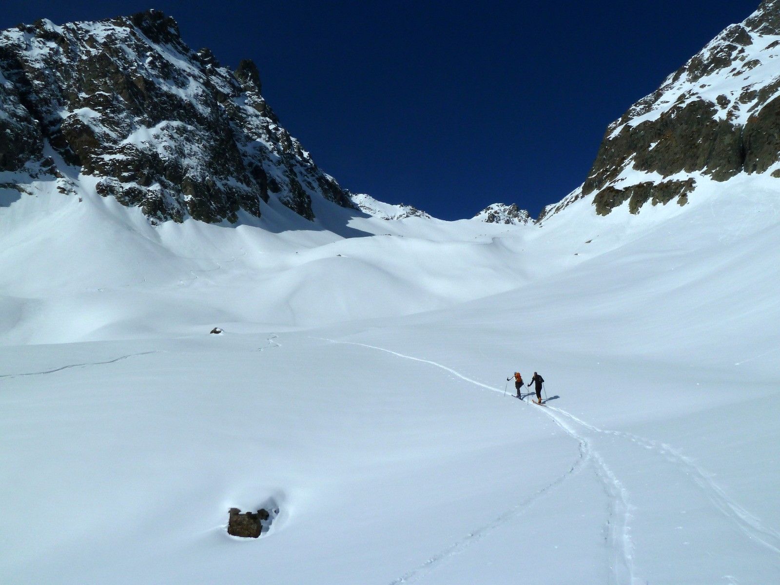 glacier de Clarant, prendre le vallon à droite (au NW), sinon le vallon de gauche mène au passage de Clarant. Le col Sud est légèrement plus raide que le col Nord.