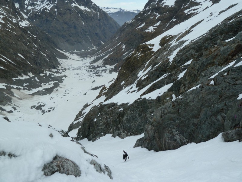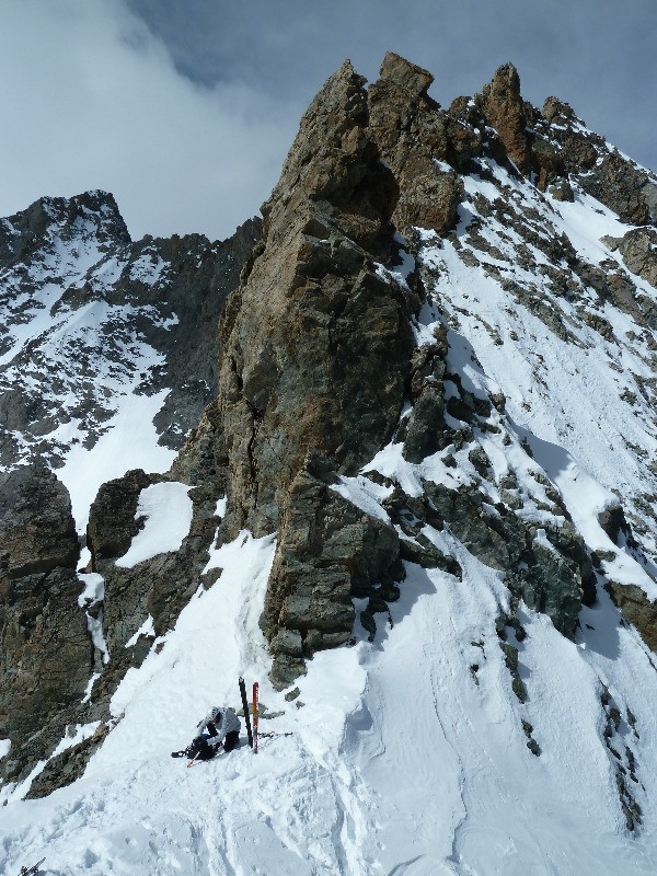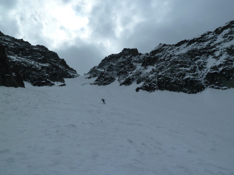 vallon de Valfourche et au pont homonyme, prendre le vallon plein S. Vers 2400, on est au pied du couloir qui se divise en bas. Emprunter le couloir de gauche (dans celui de droite il y a des séracs). Vers 2700, on rejoint des vastes pentes neigeuses où l'on monte en ski sans problème à droite pour rejoindre le pied du couloir final (rimaye vers 3000m) et le remonter.