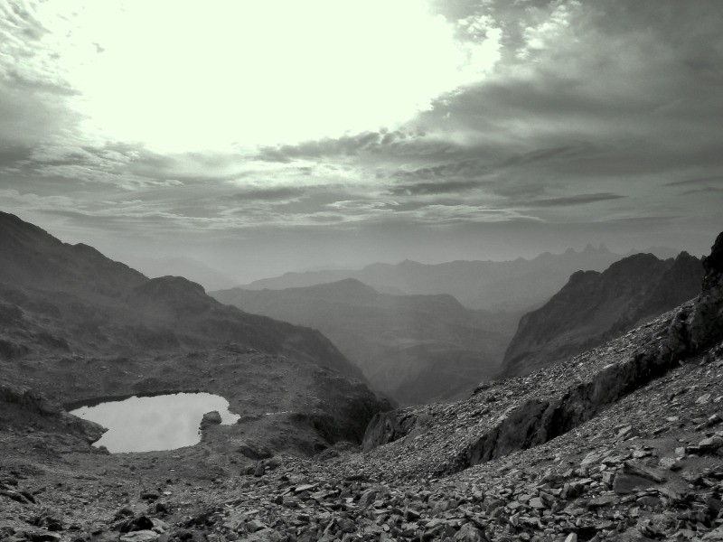 Col de la Combe Madame (qq kairns). Vers 2450, obliquer plein Ouest pour rejoindre le Lac non nommé sous le