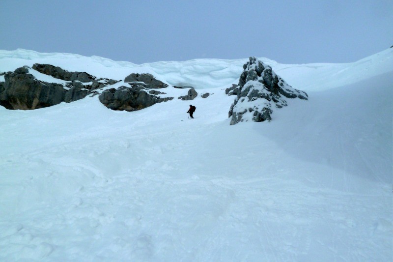 Le Cirque sans nom est protégé par 2 barres rocheuses, il est préférable (et plus esthétique) de monter côté gauche: au pied et à gauche de la première barre, après une étroiture qui passe à pieds, suivre un couloir qui monte droit jusqu'aux falaises. La suite est évidente avec des falaises présentes à main gauche jusqu'à la sortie du cirque . Celle ci s'effectue vers 1700 (pt marqué). De là 2 options, soit le GR par le bas, soit à vue par le haut en se méfiant des lapiaz . Au sommet de la