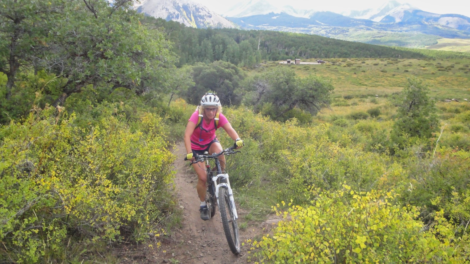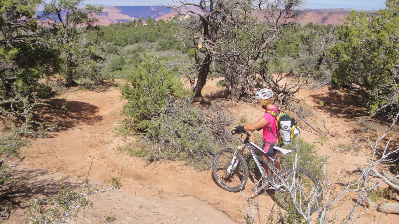 La navette de Moab Cyclery nous dépose au Geyzer Pass, direction le Burro Pass, la montée est bien raide, le souffle court, un peu de poussage/portage, nous voilà au sommet (3416 M) et la descente commence.