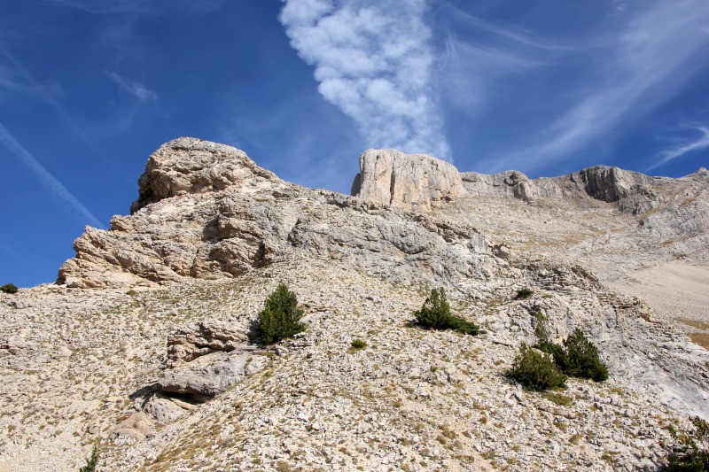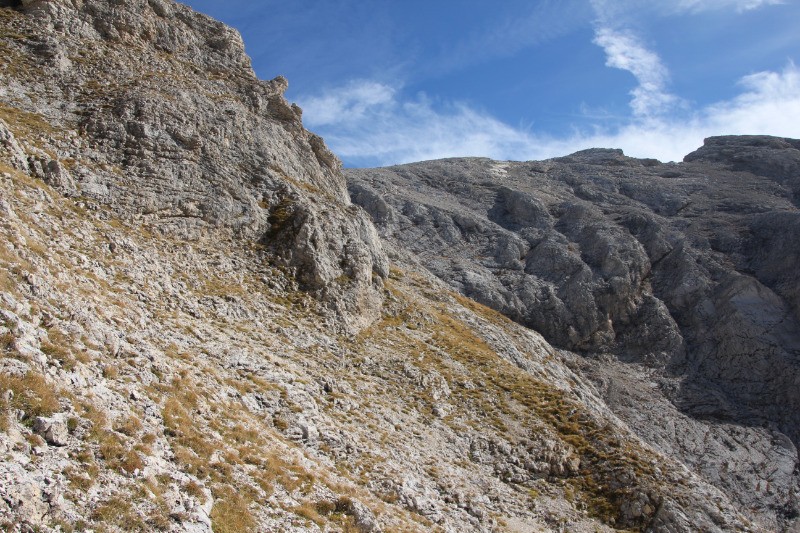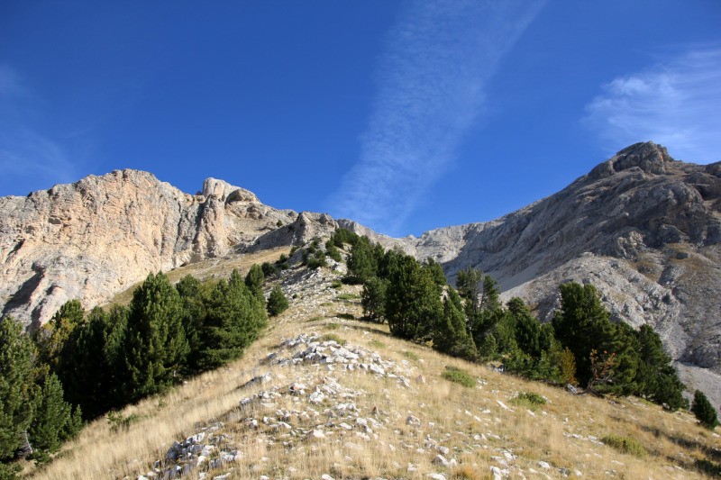 Crête de la Pare. Suivre cette crête jusqu?aux premières falaises qui?l faudra contourner par gauche. Franchir le deuxième ressaut également par la gauche avant d?arriver au