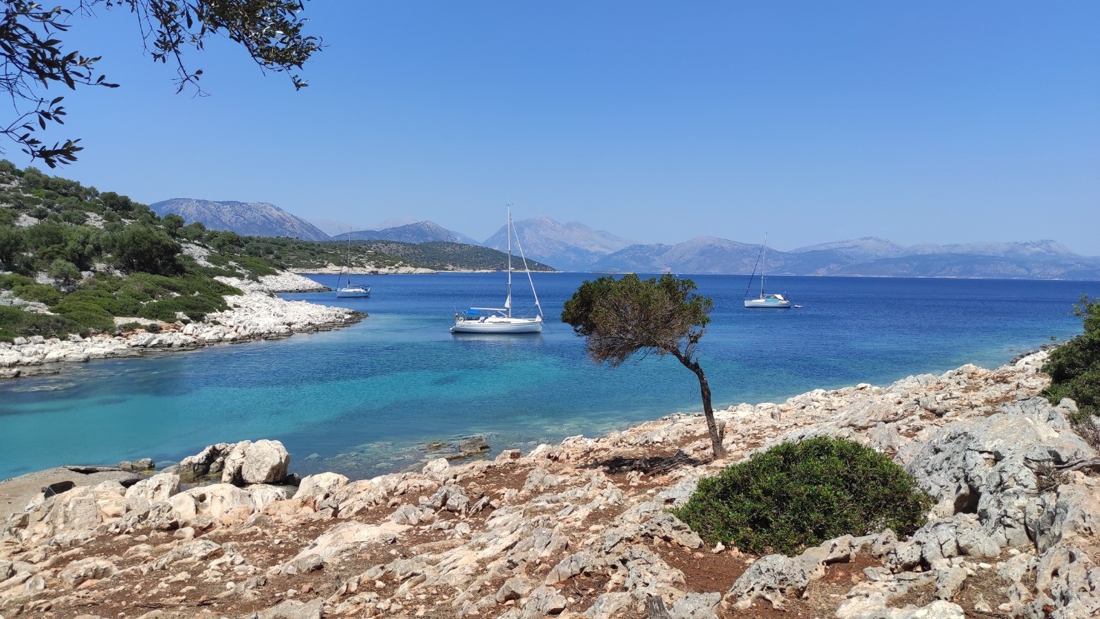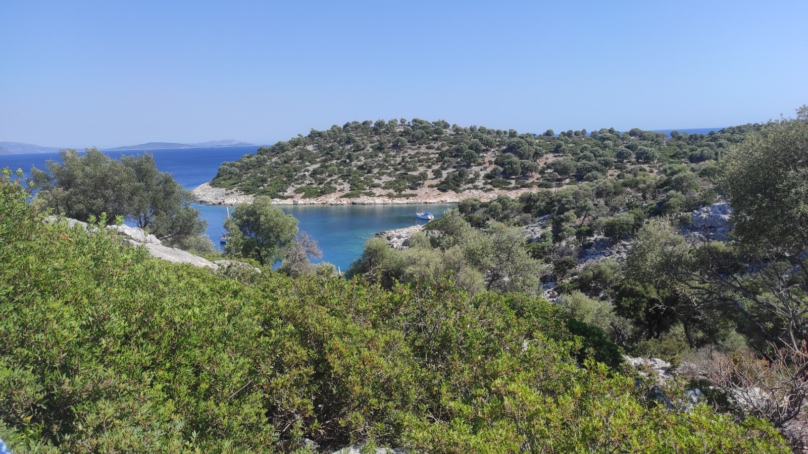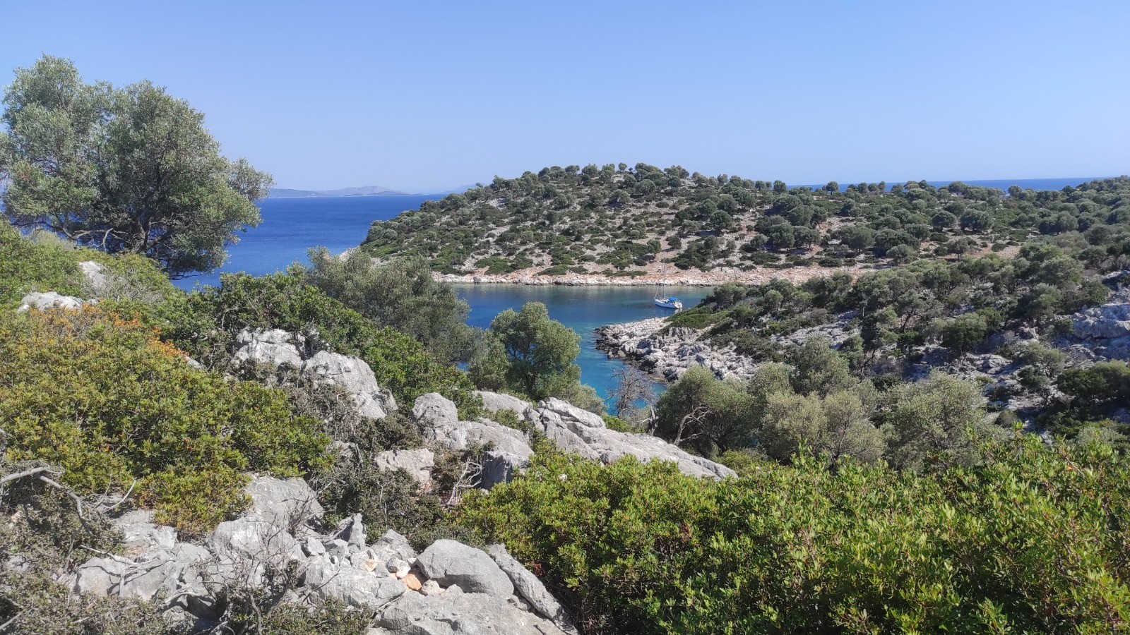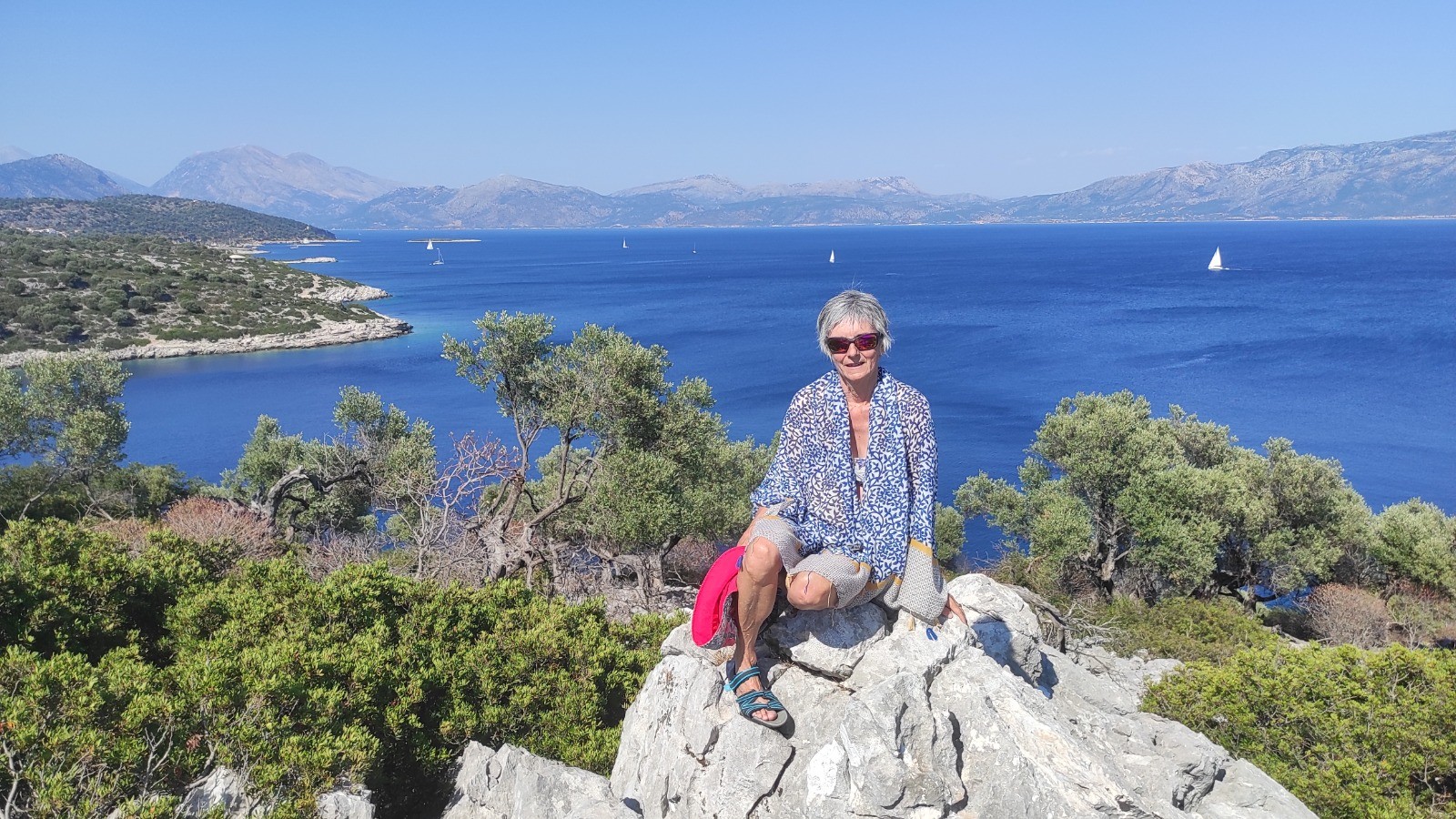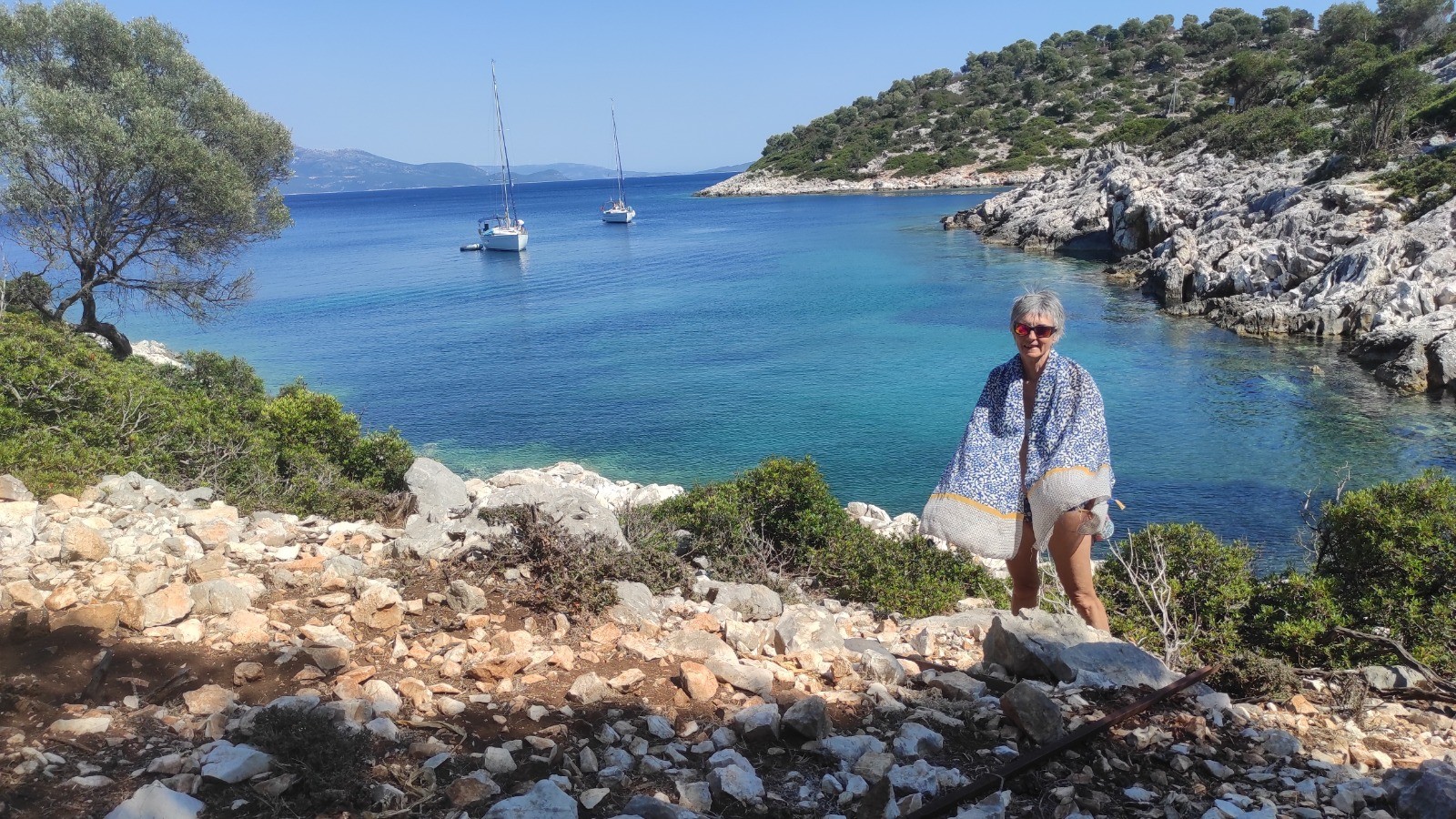 Après manger on va avec Sylvie de l'autre côté, sur un petit sommet d'où on a une belle vue sur notre mouillage.