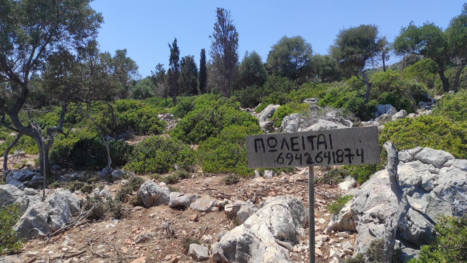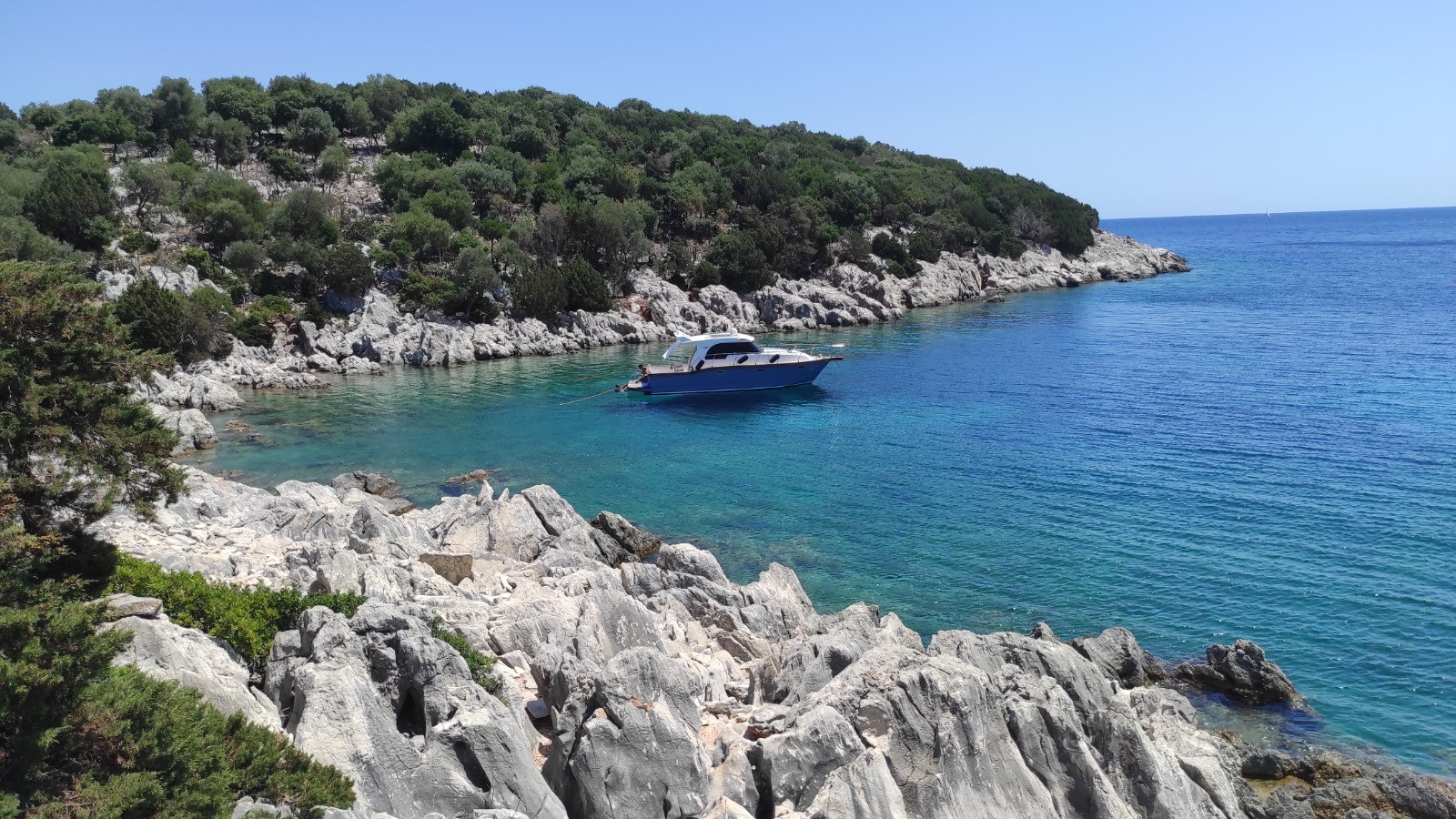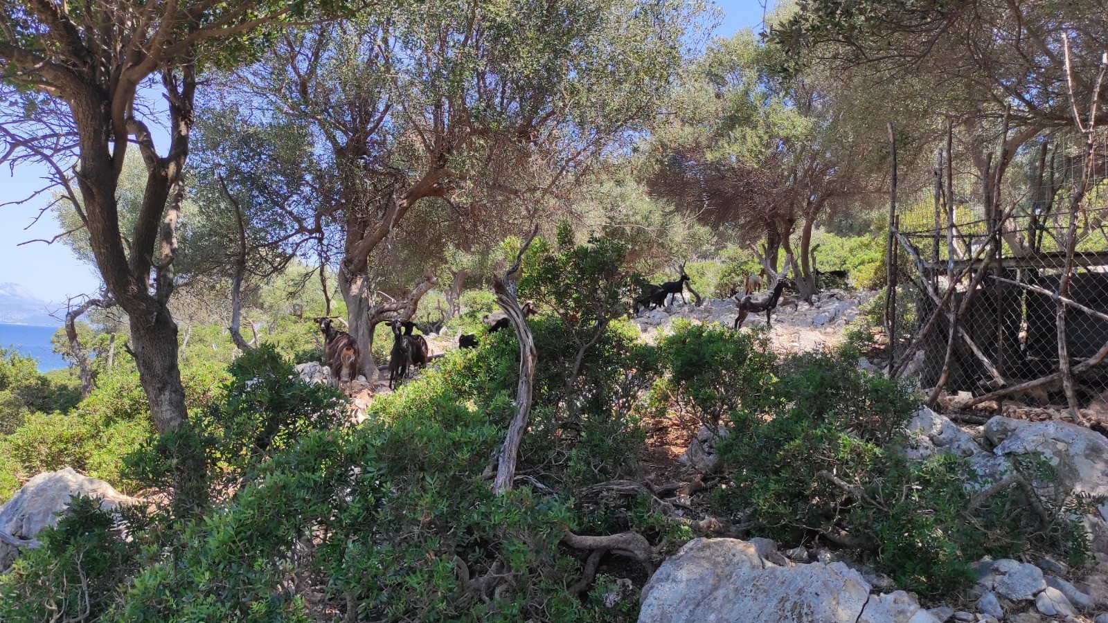 Après avoir mouillée, je vais en paddle au ponton délabré en béton avec les chèvres pour suivre le sentier visible sur la carte qui traverse l'île pour arriver sur une autre crique.