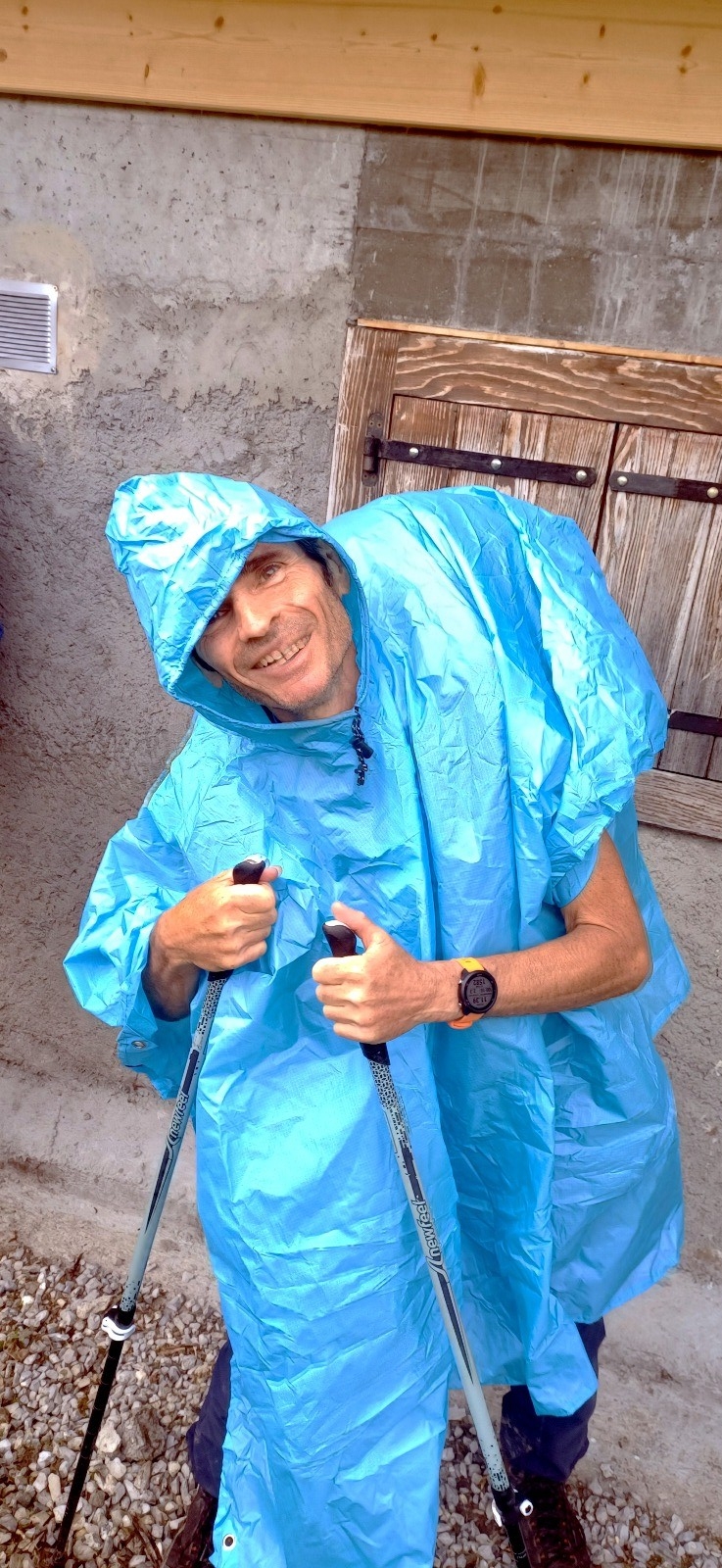 La pluie annoncée à 14H00 est arrivée à midi, et il nous a fallu trouver un abri pour le casse croute aux chalets de Lens. La fin de la journée se passe sous les capes pour certains et les vestes de pluie pour les autres; seul Jacky était affublé d'une" cape toile de tente" , certainement primée au concours Lepine, qui ma foi lui allait très bien.