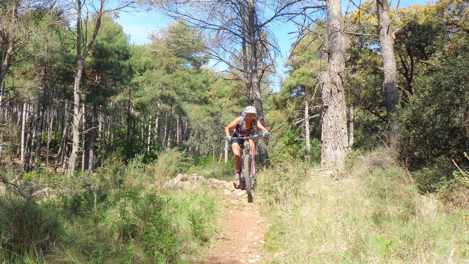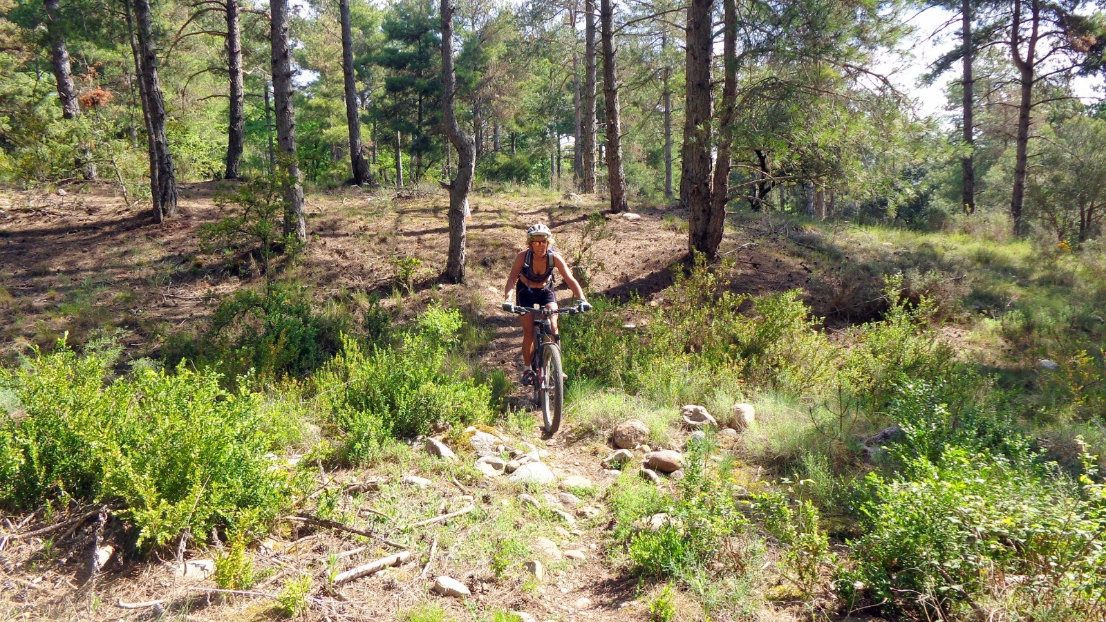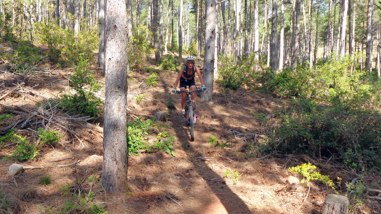 Un zeste de poussette pour atteindre le sommet, un bout de piste, la partie haute du sentier se présente, elle est peu roulée et encombrée de pommes de pins et branches mortes, il faut faire le ménage par endroits.