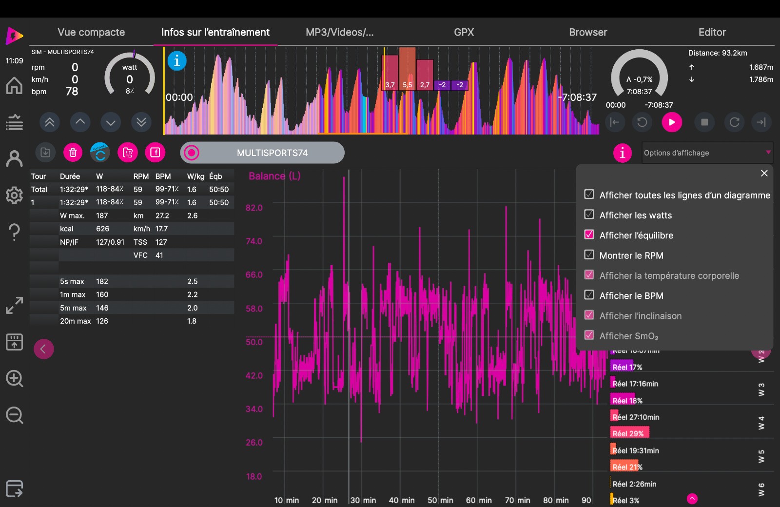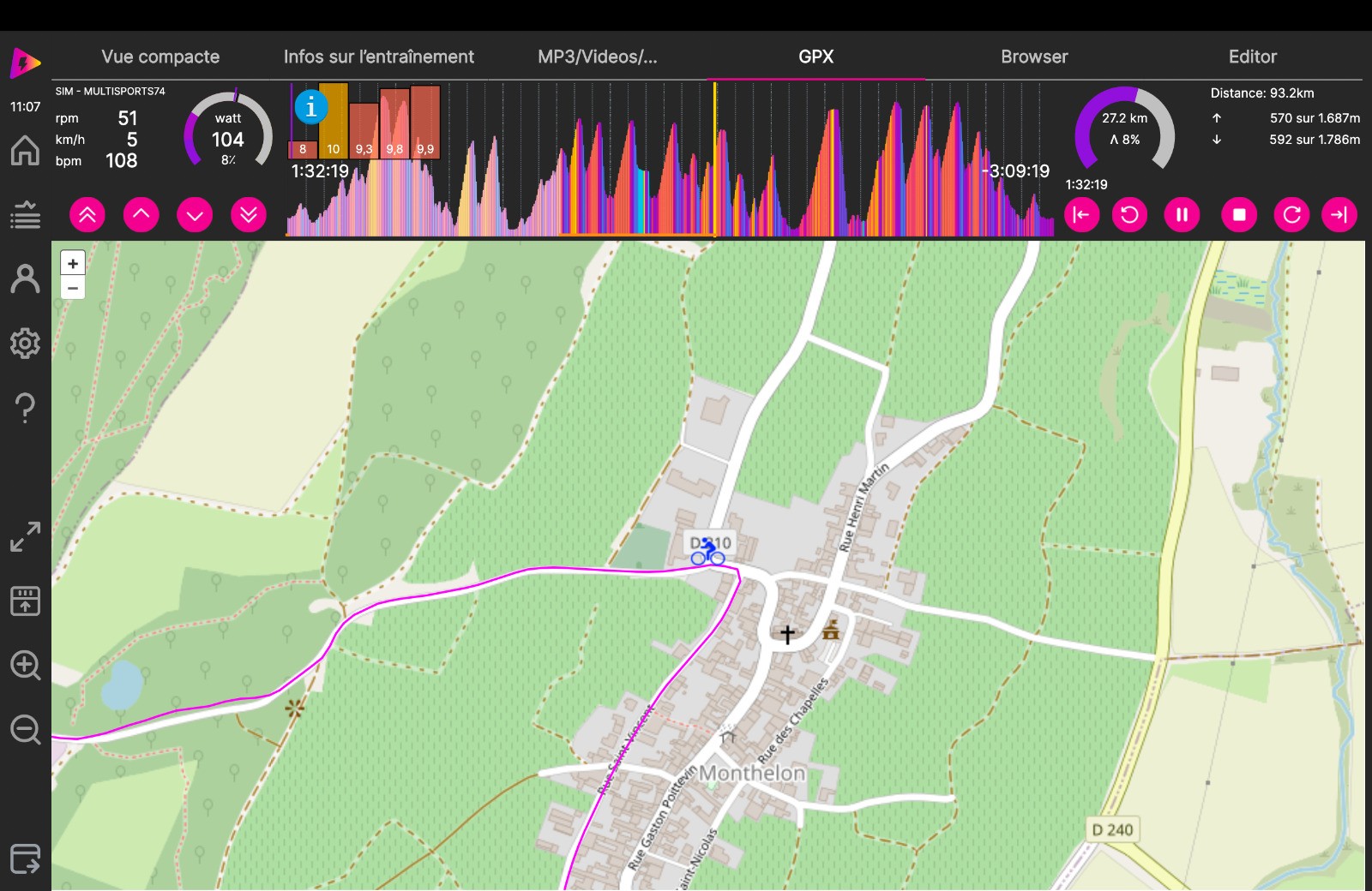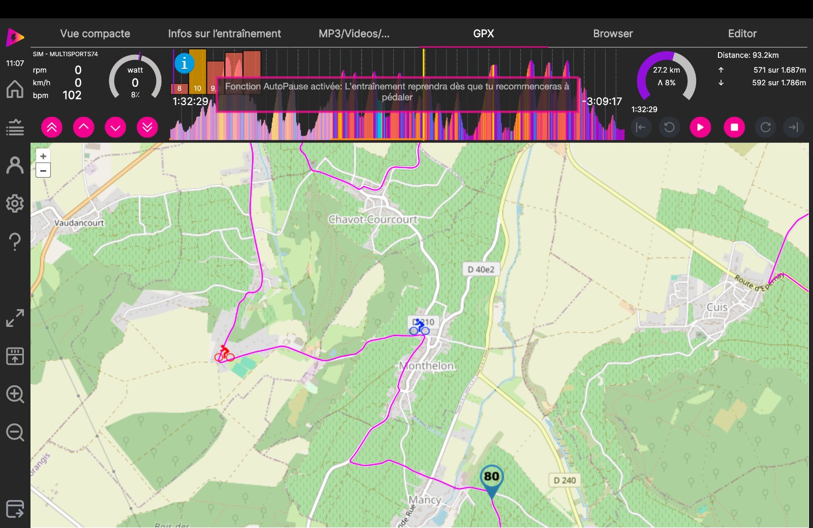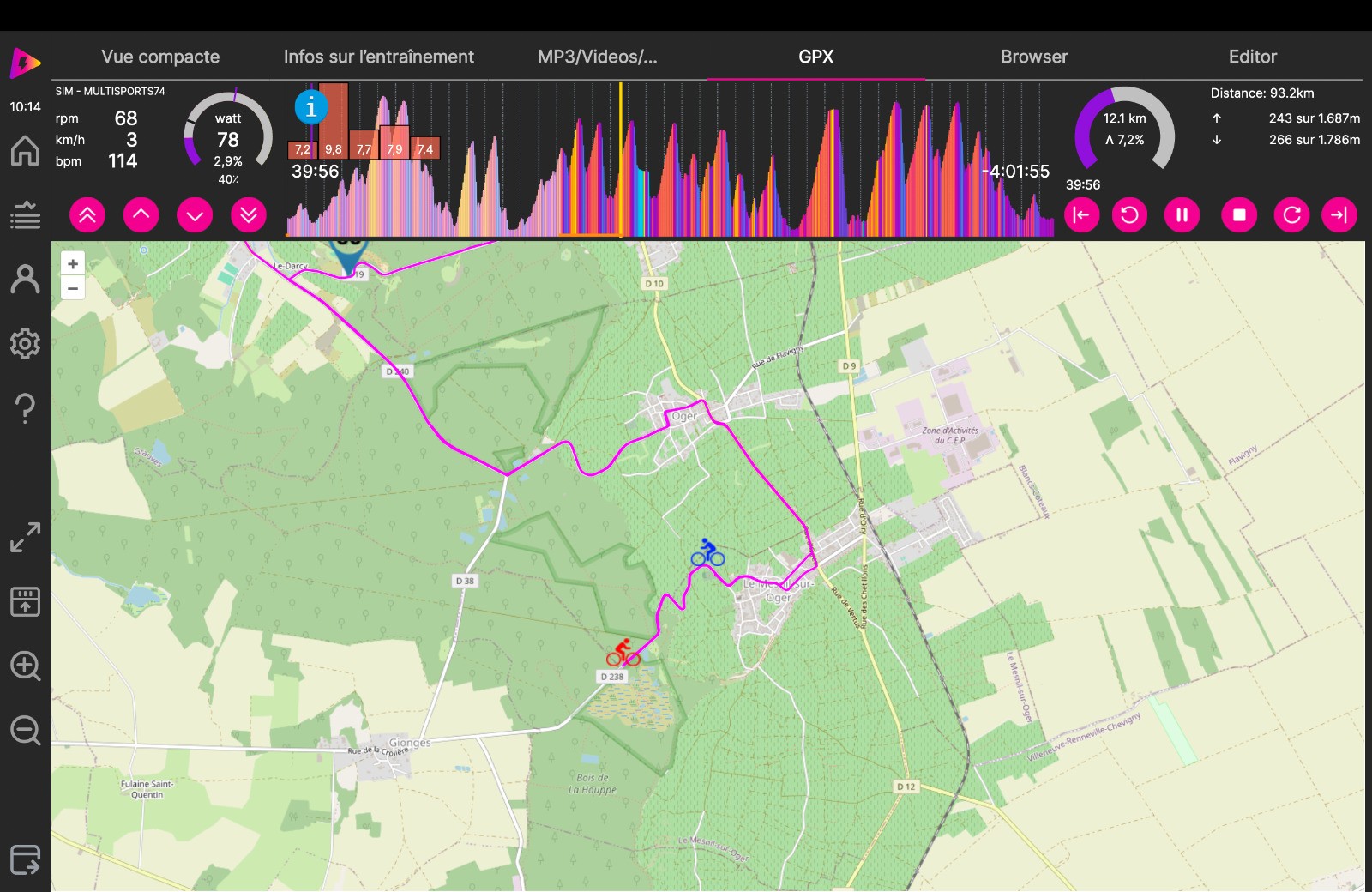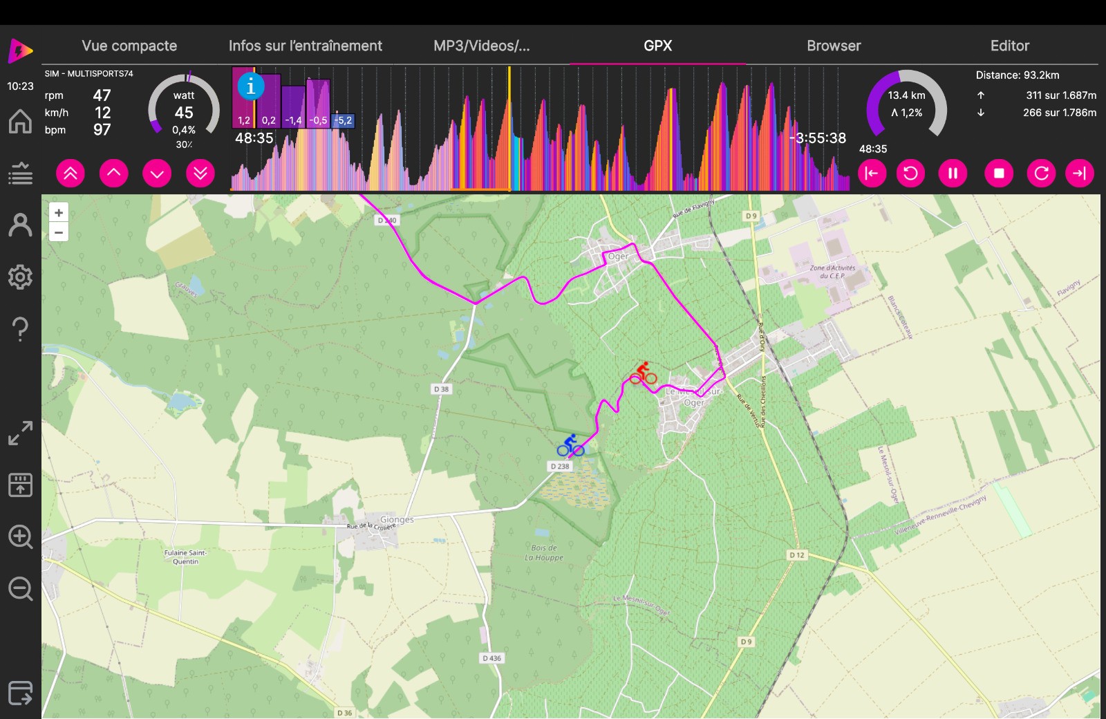 Séance d'HT : départ à partir de CRAMANT sur section d'un parcours réel dans la cote des BLANCS avec une boucle sur le MESNIL-sur-OGER et fin du parcours à MONTHELON. Les réglages n'ont pas été au top. La séance est bien inférieure à celle du réel puisque je perds 12'.