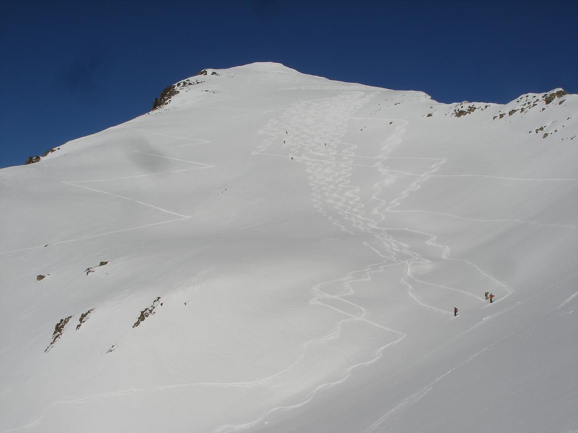 pente de rêve, sous le regard narquois de l'imposante pyramide du Petit Pinier, avec la petite dose d'adrénaline inhérente à l'idée de ce qui les attend plus bas.