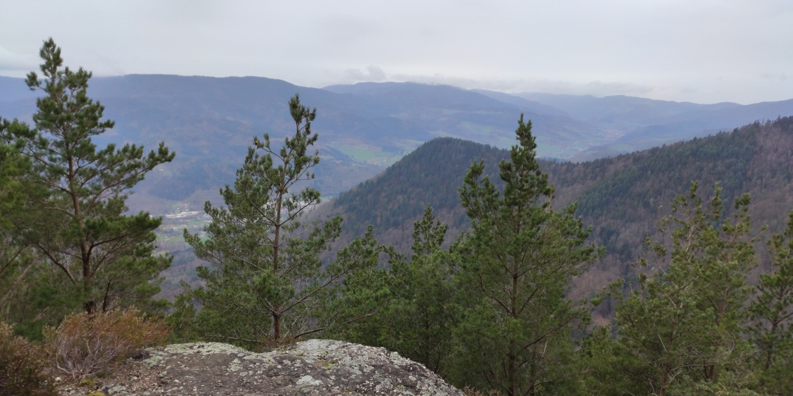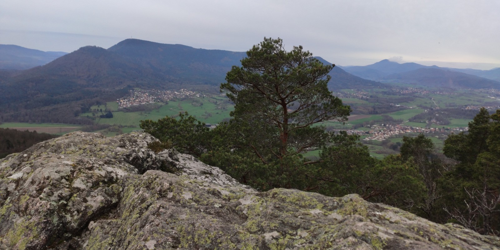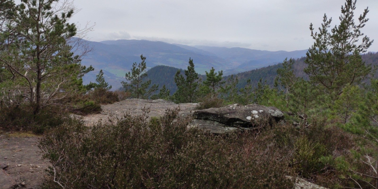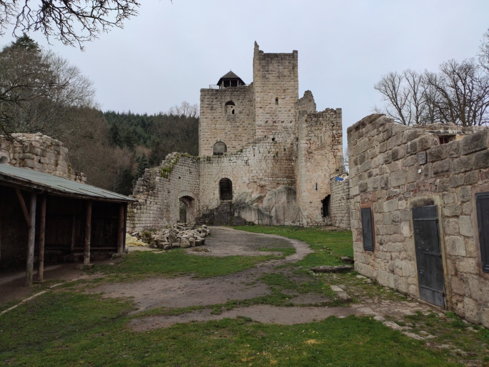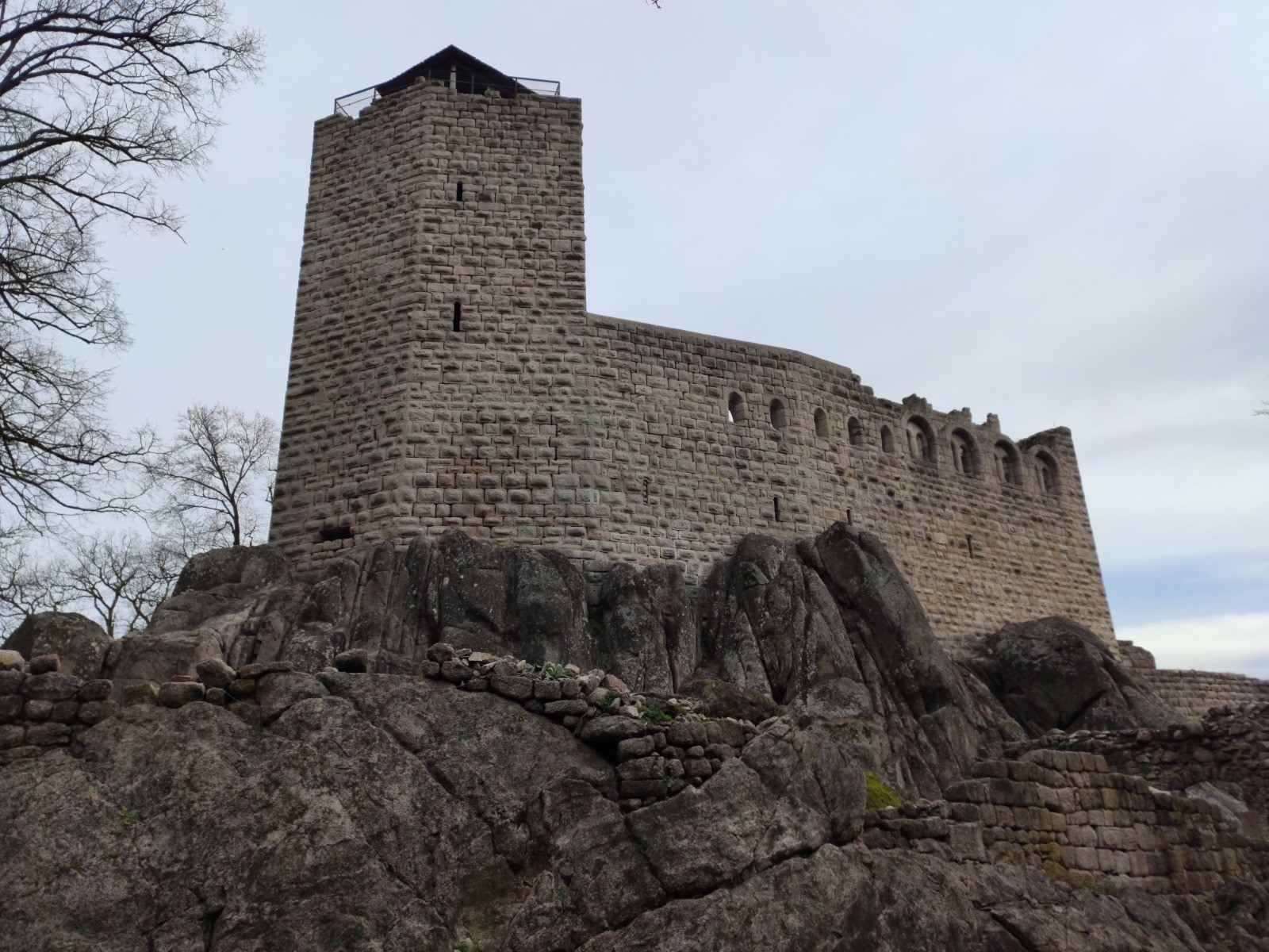 Chapelle Saint Sébastien (Dambach-la-Ville) - château du Bernstein - rocher Bellevue - rocher du Falkenstein - source de la Chapelle Sainte-Marie - Stangenplatz - [rocher point de vue au-dessus de La Vancelle à 16.75 km] - col du Frankenbourg - D697 - D424 - Route du Sel - château du Ramstein - château de l'Ortenbourg - Dieffenthal - sentien de Compostelle - Dambach-la-Ville - Chapelle Saint Sébastien