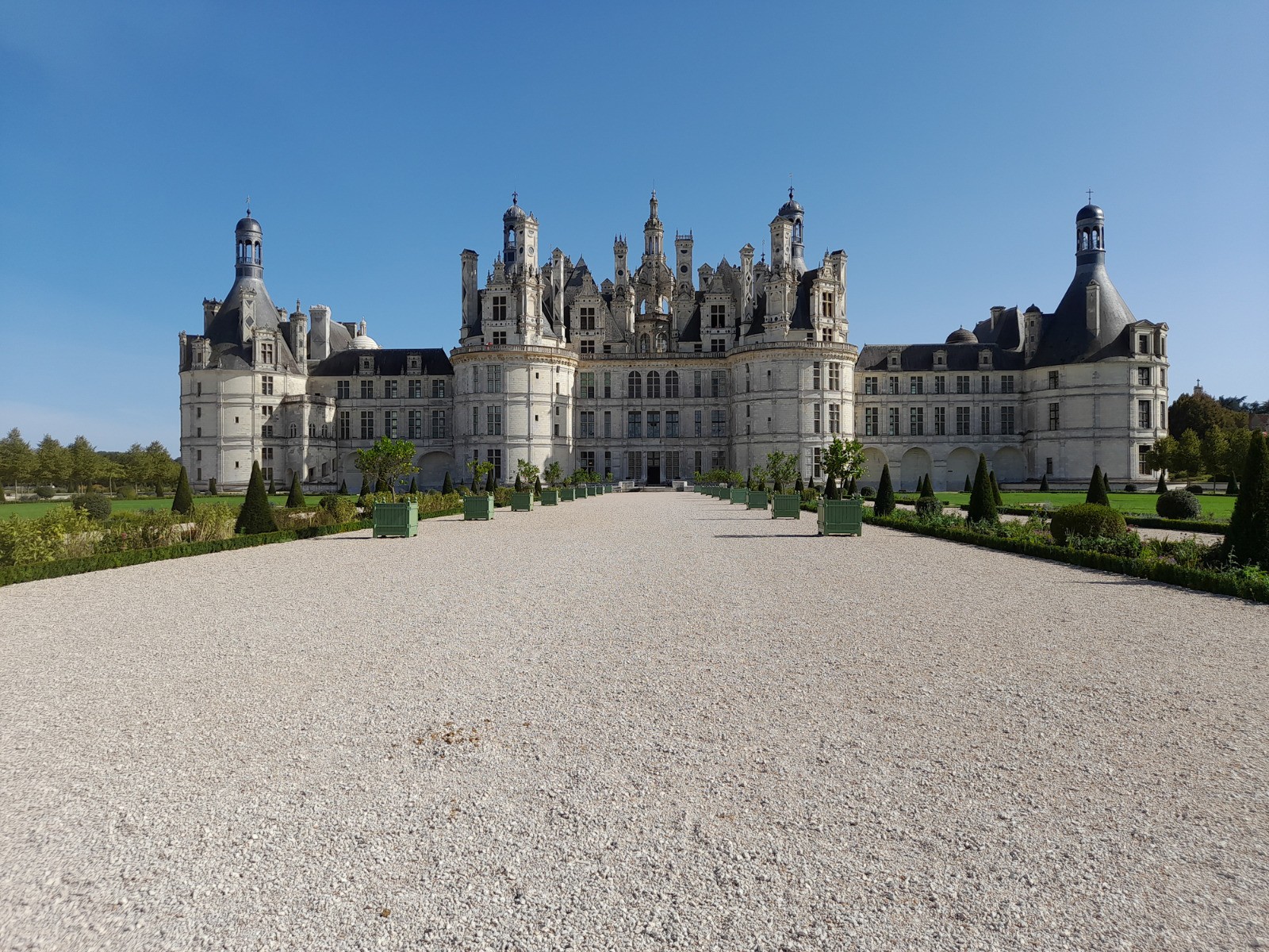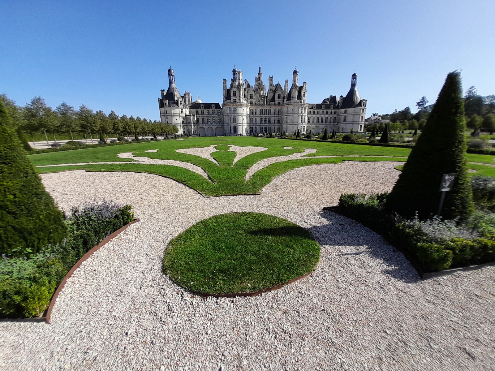 Bonjour, pour moi, le plus beau des châteaux de la Loire. Imposant de loin, juste magnifique de près. Une architecture à couper le souffle, de la dentelle de pierre, des escaliers à vis, à double révolution, des pièces à la démesure du site. Le parc , plus simple et à voir en prenant de la hauteur. 🐕 non admis.