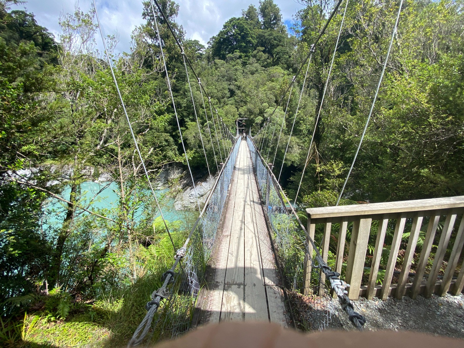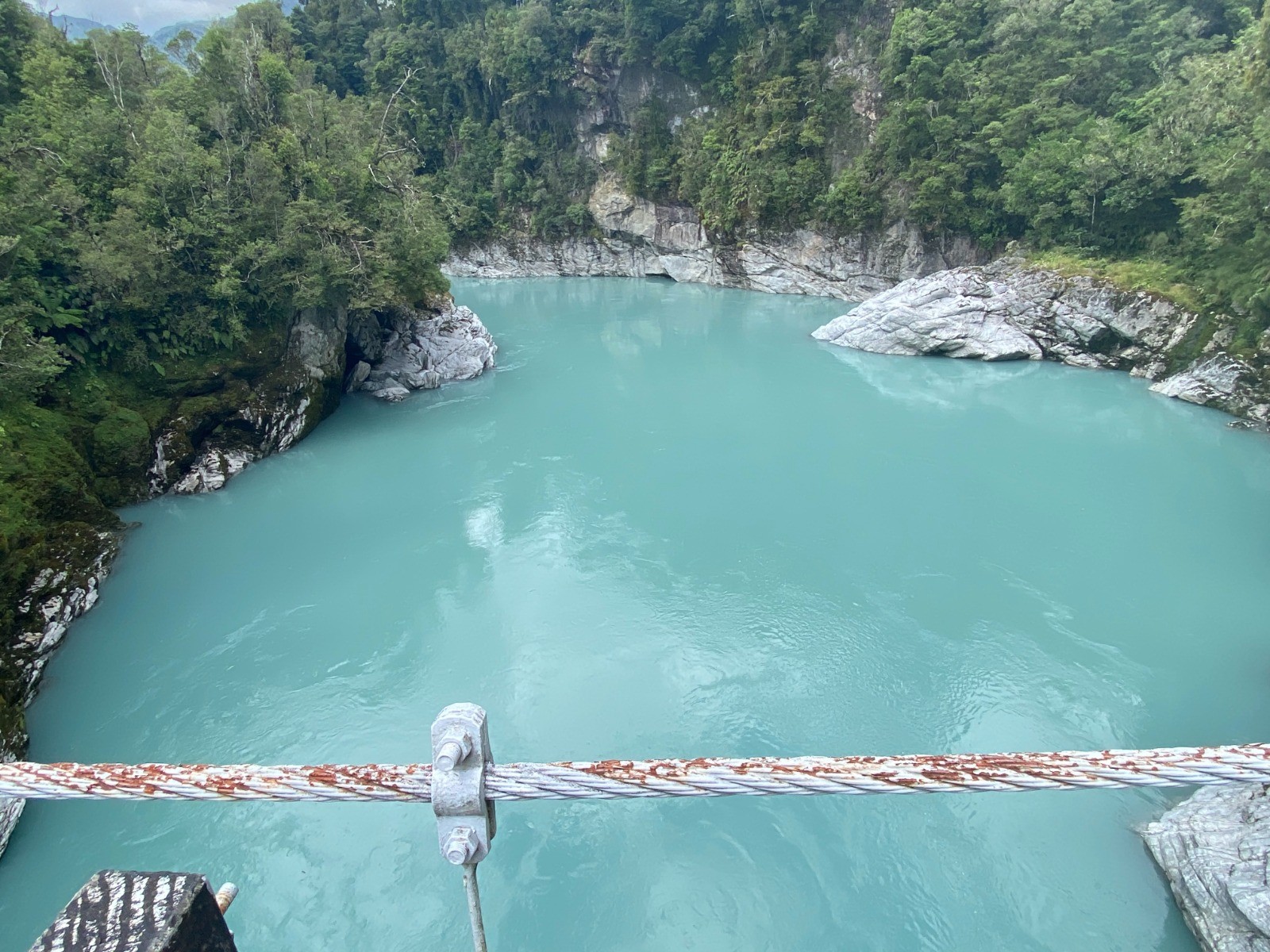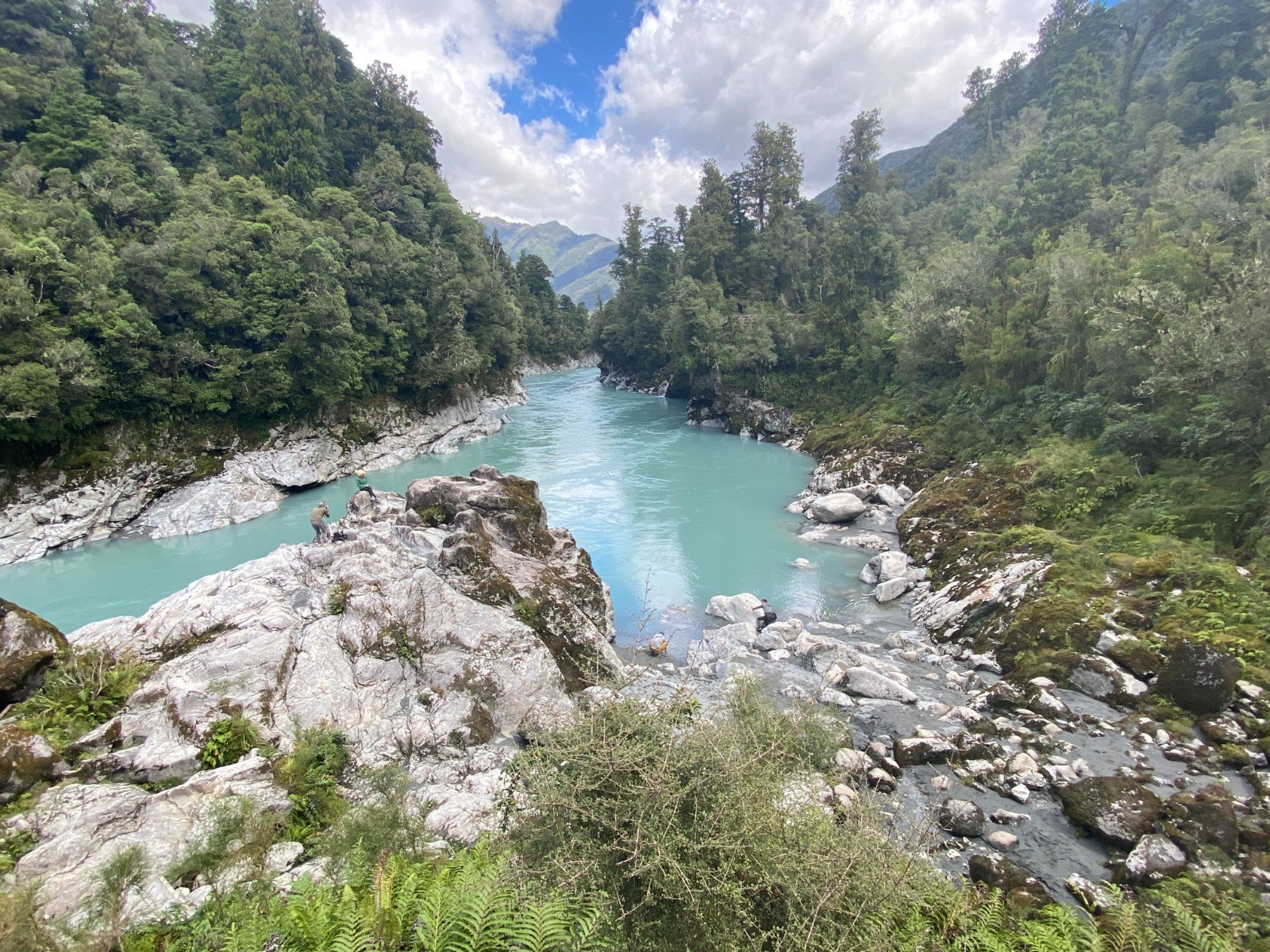 Hokitika Gorge est à quelques pas du parking à travers une forêt principalement de rimus et de podocarpes ( espèce d'arbres conifères ) jusqu'à une plate-forme d'observation.