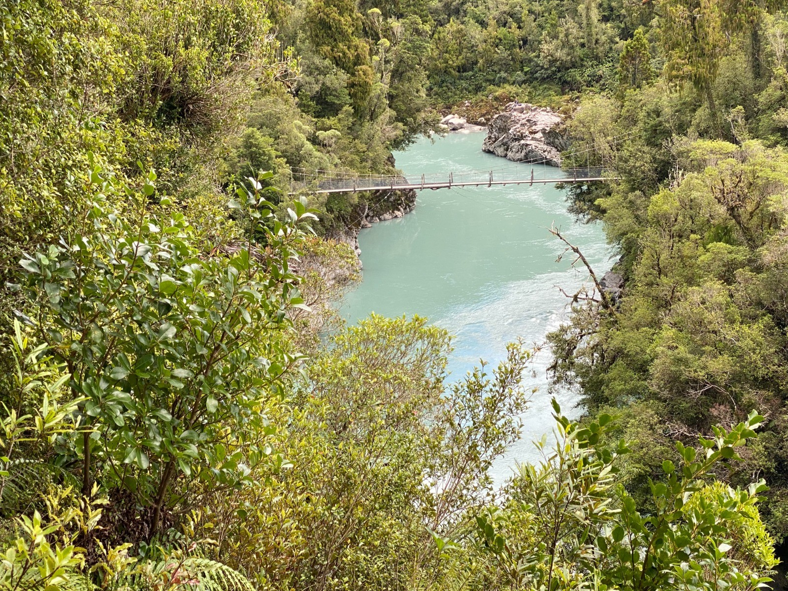 Un pont suspendu à traverser et nous voilà au-dessus d’une magnifique gorge d’un bleu très clair.