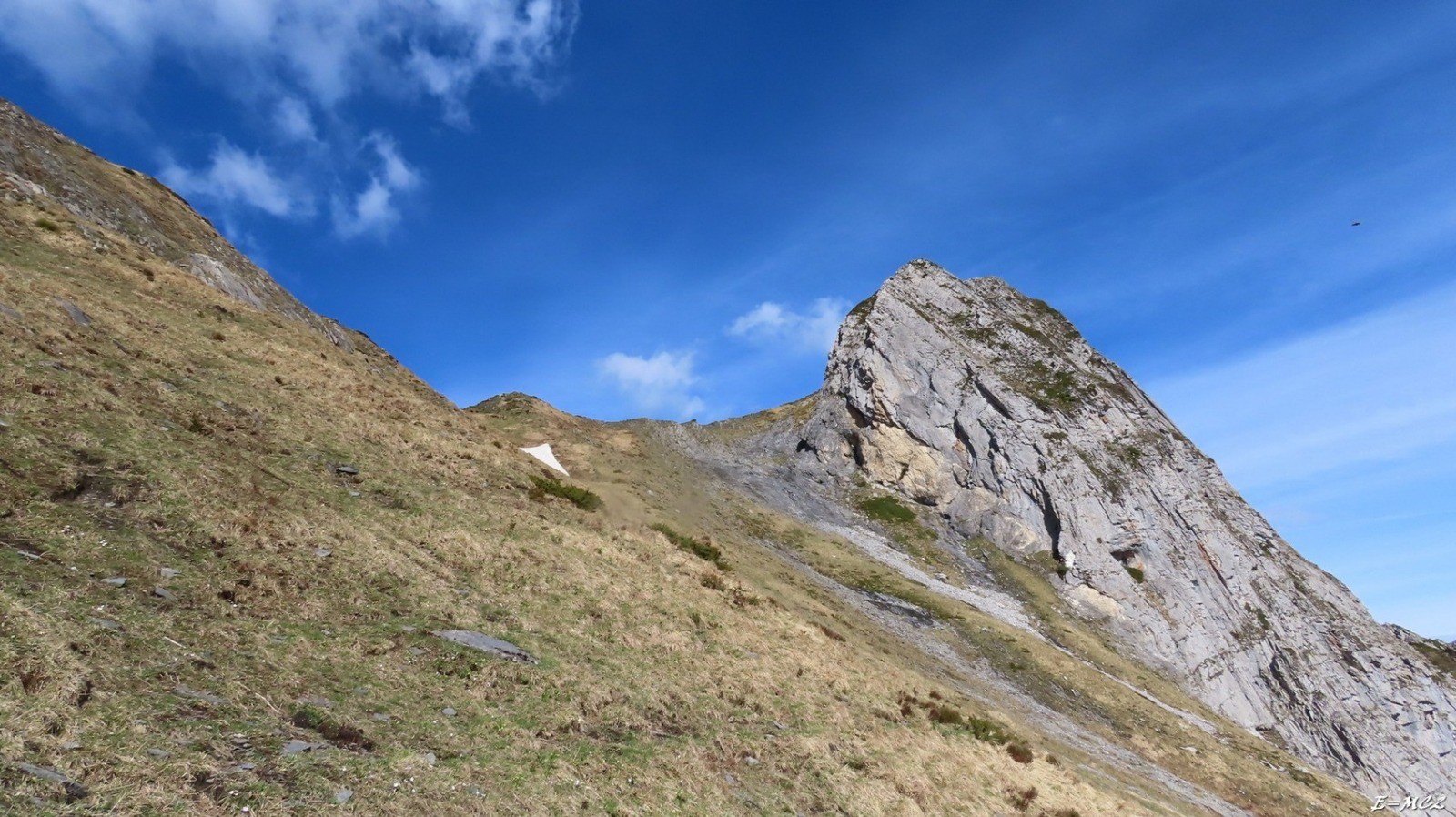 A la fin de la crête, rejoindre sur la gauche le sentier, balisé jaune sur petits piquets, le suivre vers la gauche jusqu'à retrouver le sentier de la montée vers 1200 m.