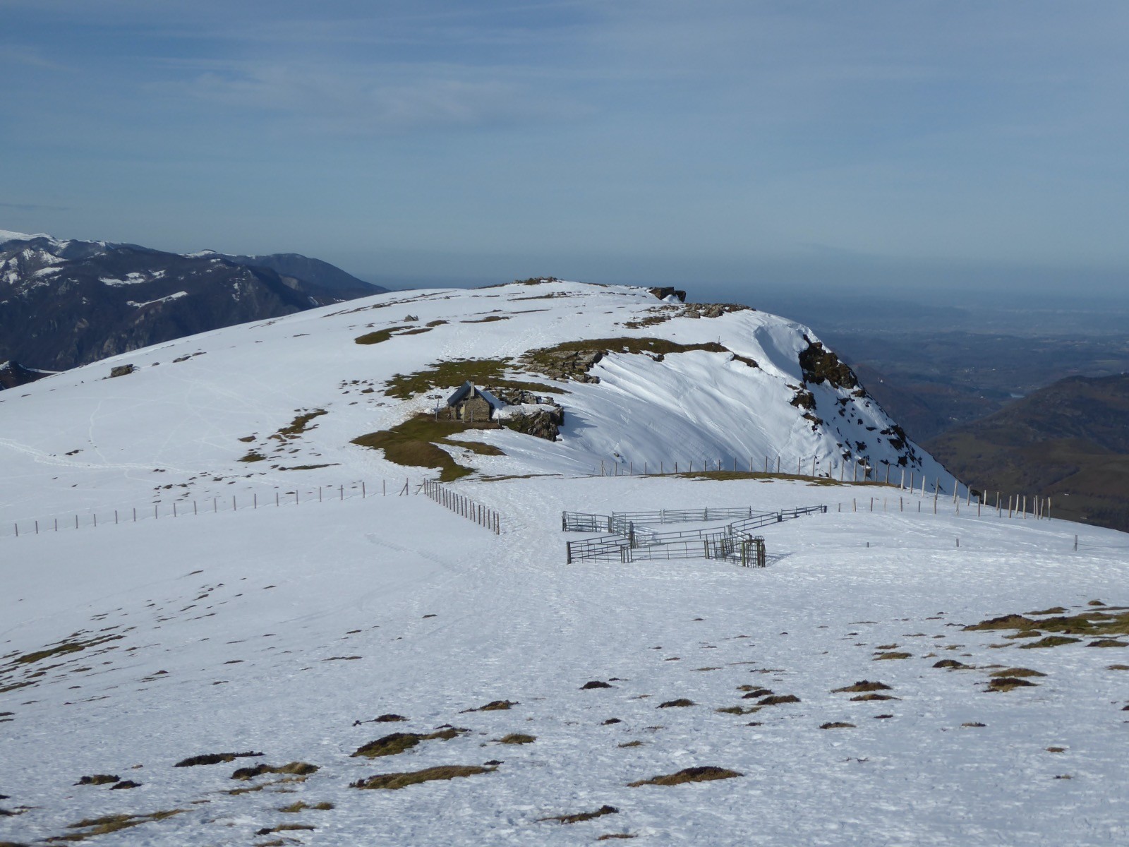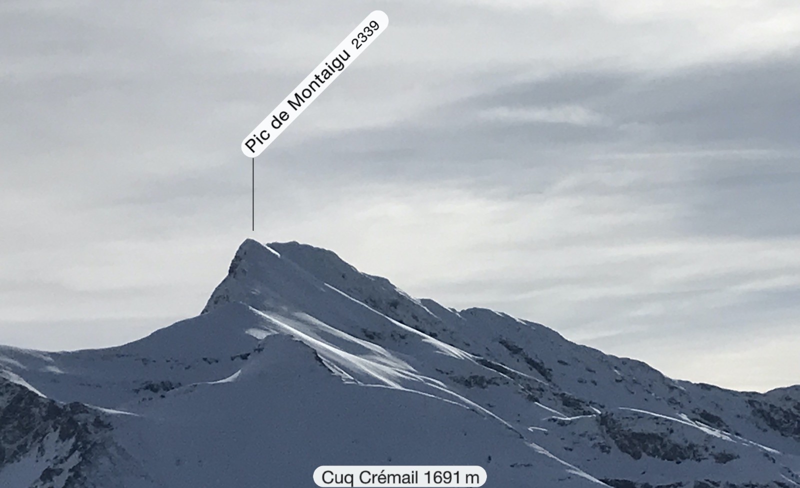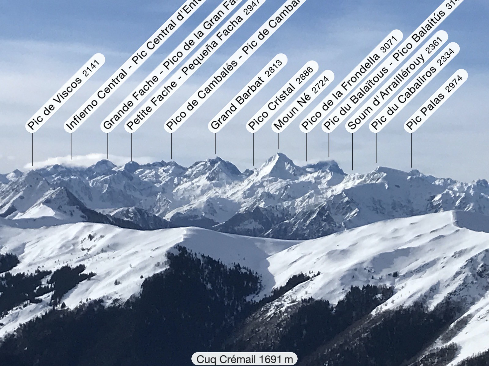 Météo très favorable pour monter au Cuq Crémail. Le spectacle sur les sommets environnants est superbe.Montaigu,Viscos,Soum Arrouy, Pic de Léviste, Soum de Léviste, Naouit , Vignemale,Ardiden, Soum de Siarrousse, Grande Fache, Grand Barbat, Monné, Balaïtous , Cabaliros. Les congères ont accumulé jusqu?à 1,50 de neige et pour certaines menacent de céder.