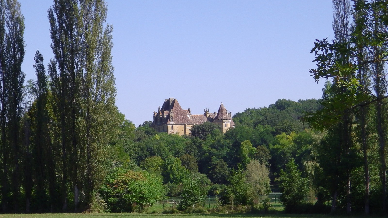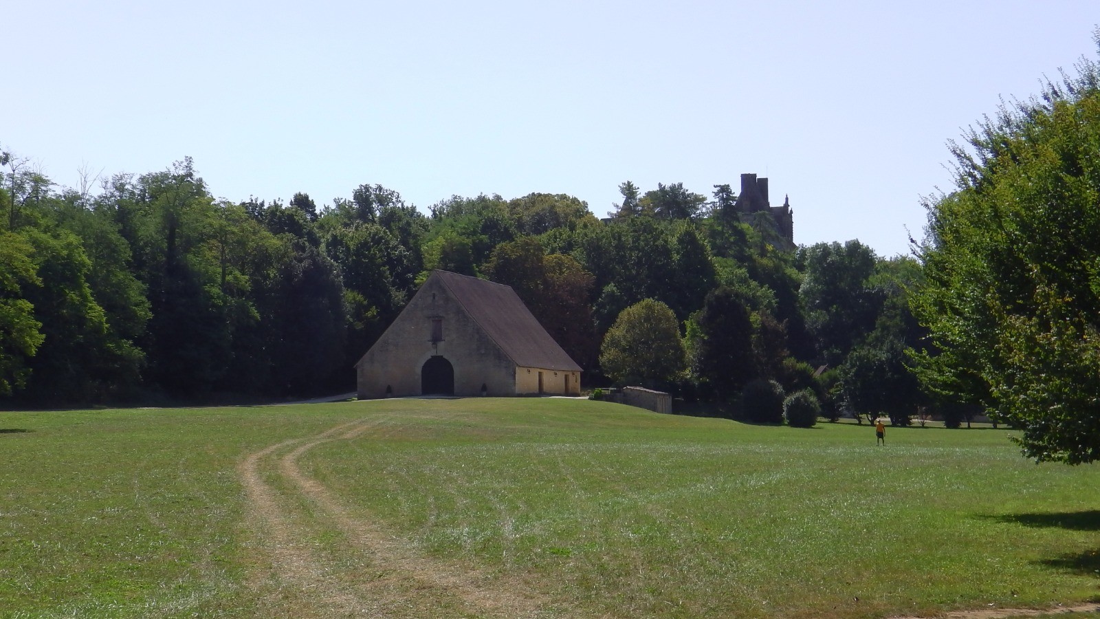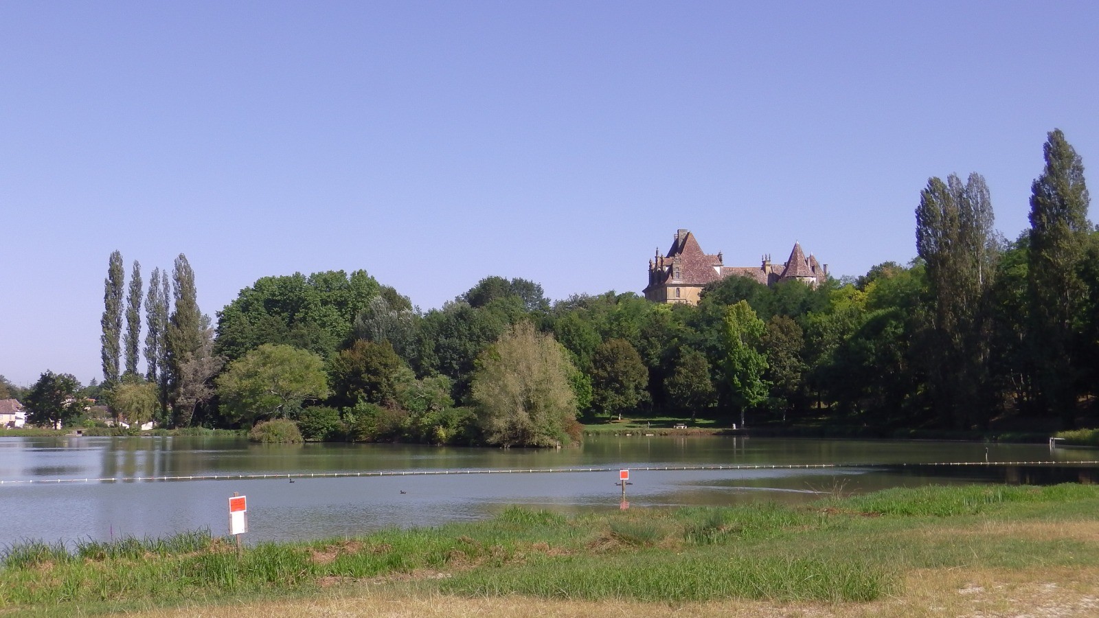 Sous Bournazel, on peut faire le tour du lac dominé par le magnifique château de Lanquais qu'on ne peut voir qu'au dessus des arbres. Pour cela, au niveau de la clôture qui entoure le lac, quitter le GR et le balisage jaune, descendre et passer le portail qui laisse passer les piétons. A l'autre extrémité, remonter par la droite et retrouver le balisage. Un beau chemin le long d'un petit ruisseau passe derrière le château et mène au tennis où une table bien ombragée nous a permis de pique-niquer confortablement.