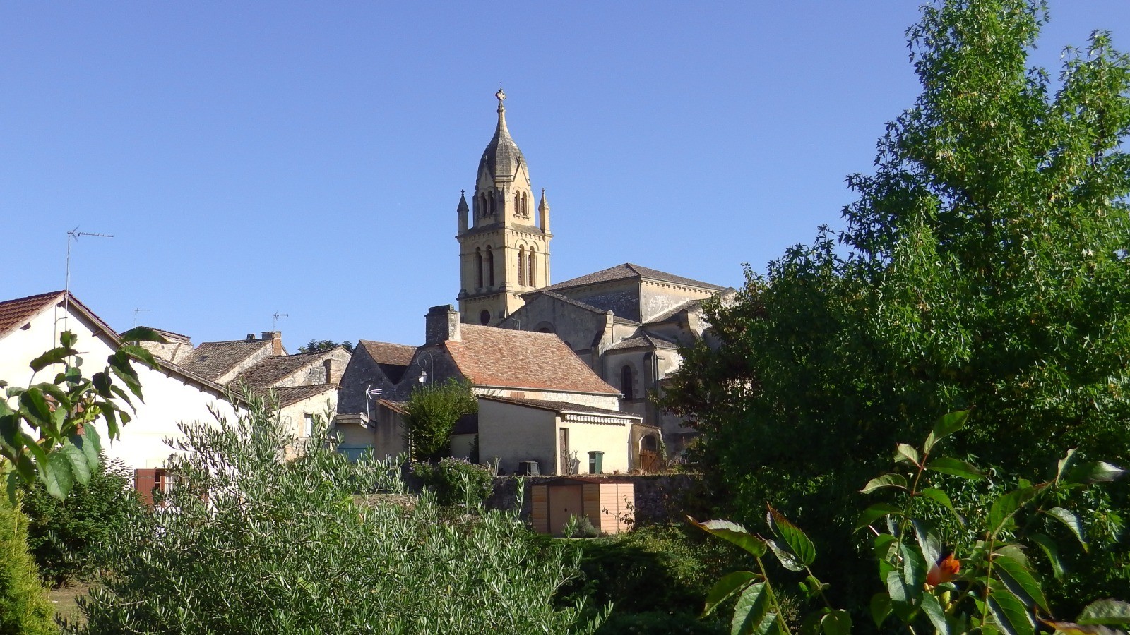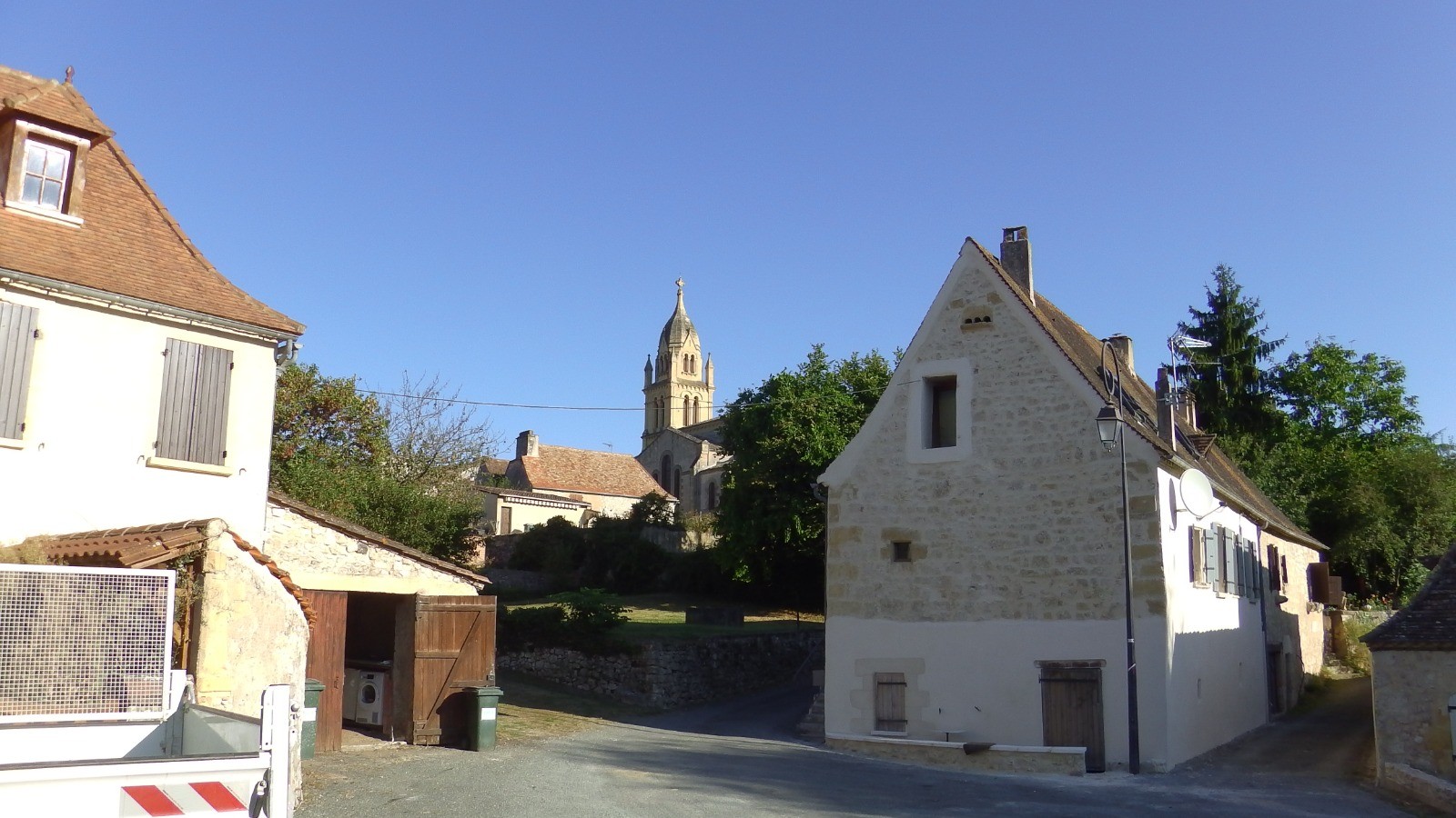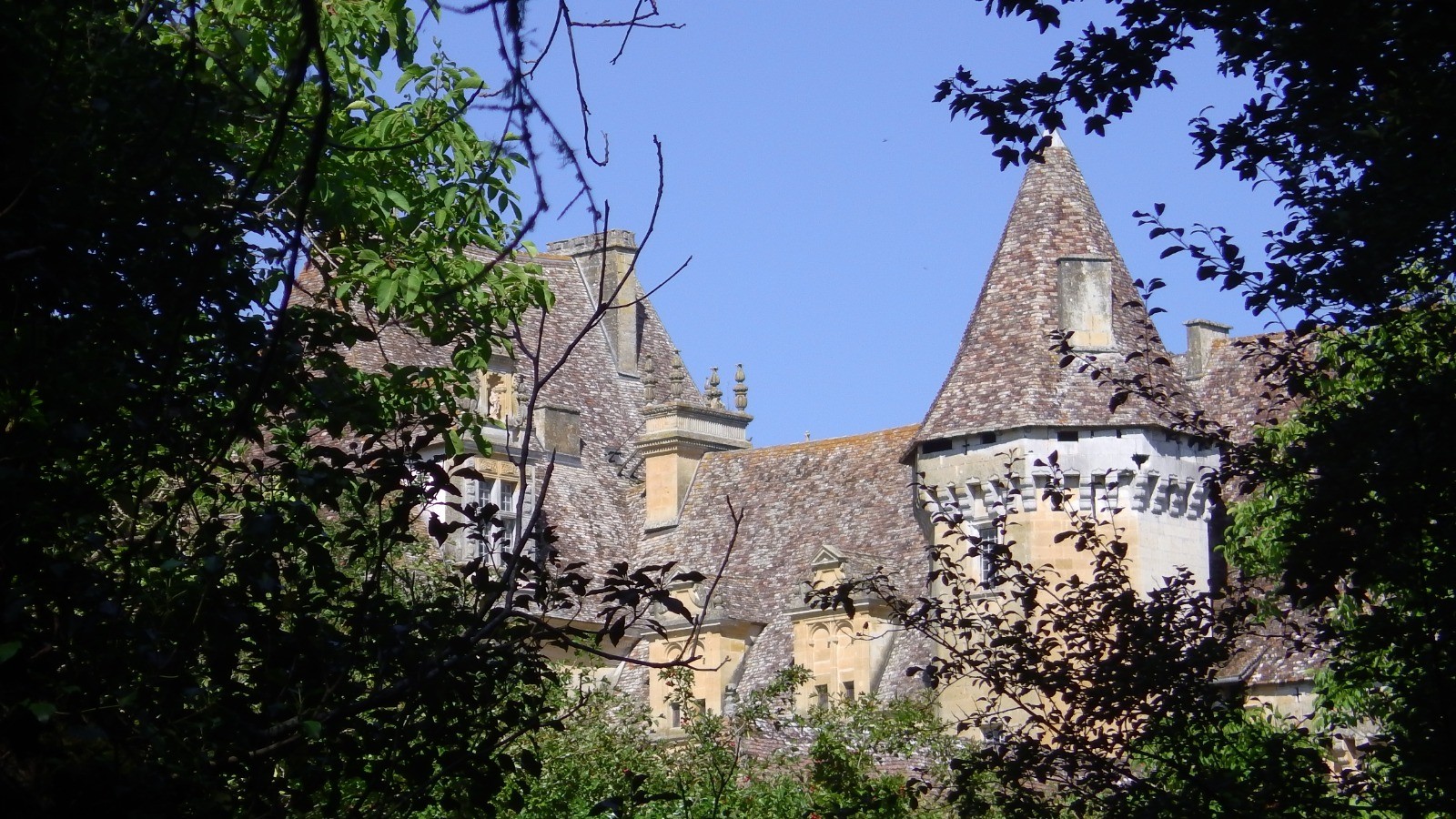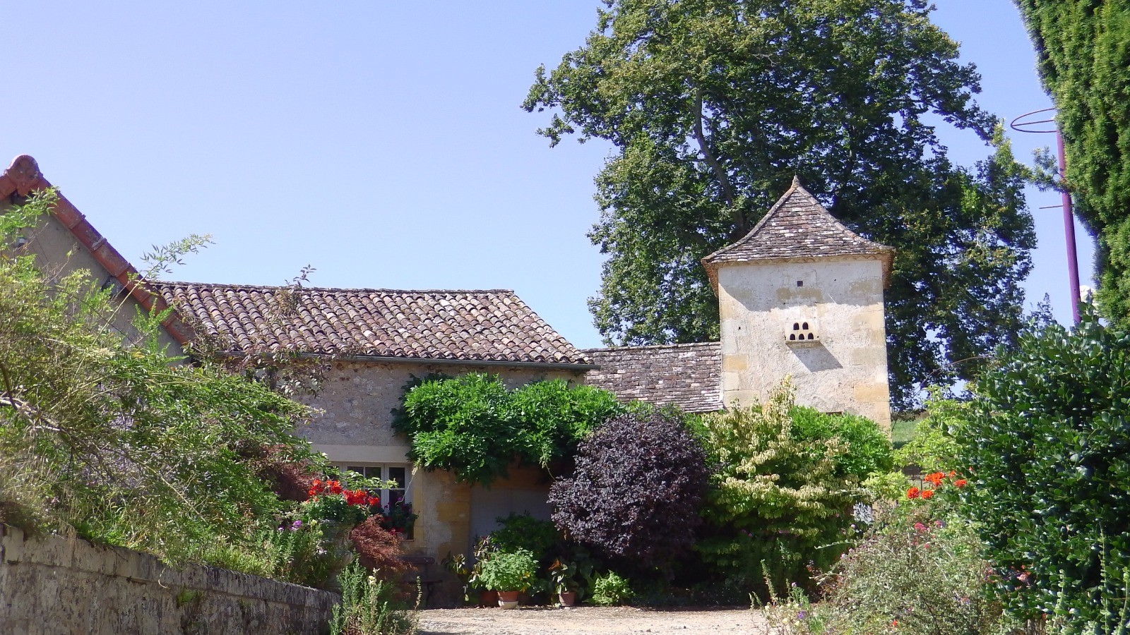 Sous Bournazel, on peut faire le tour du lac dominé par le magnifique château de Lanquais qu'on ne peut voir qu'au dessus des arbres. Pour cela, au niveau de la clôture qui entoure le lac, quitter le GR et le balisage jaune, descendre et passer le portail qui laisse passer les piétons. A l'autre extrémité, remonter par la droite et retrouver le balisage. Un beau chemin le long d'un petit ruisseau passe derrière le château et mène au tennis où une table bien ombragée nous a permis de pique-niquer confortablement.