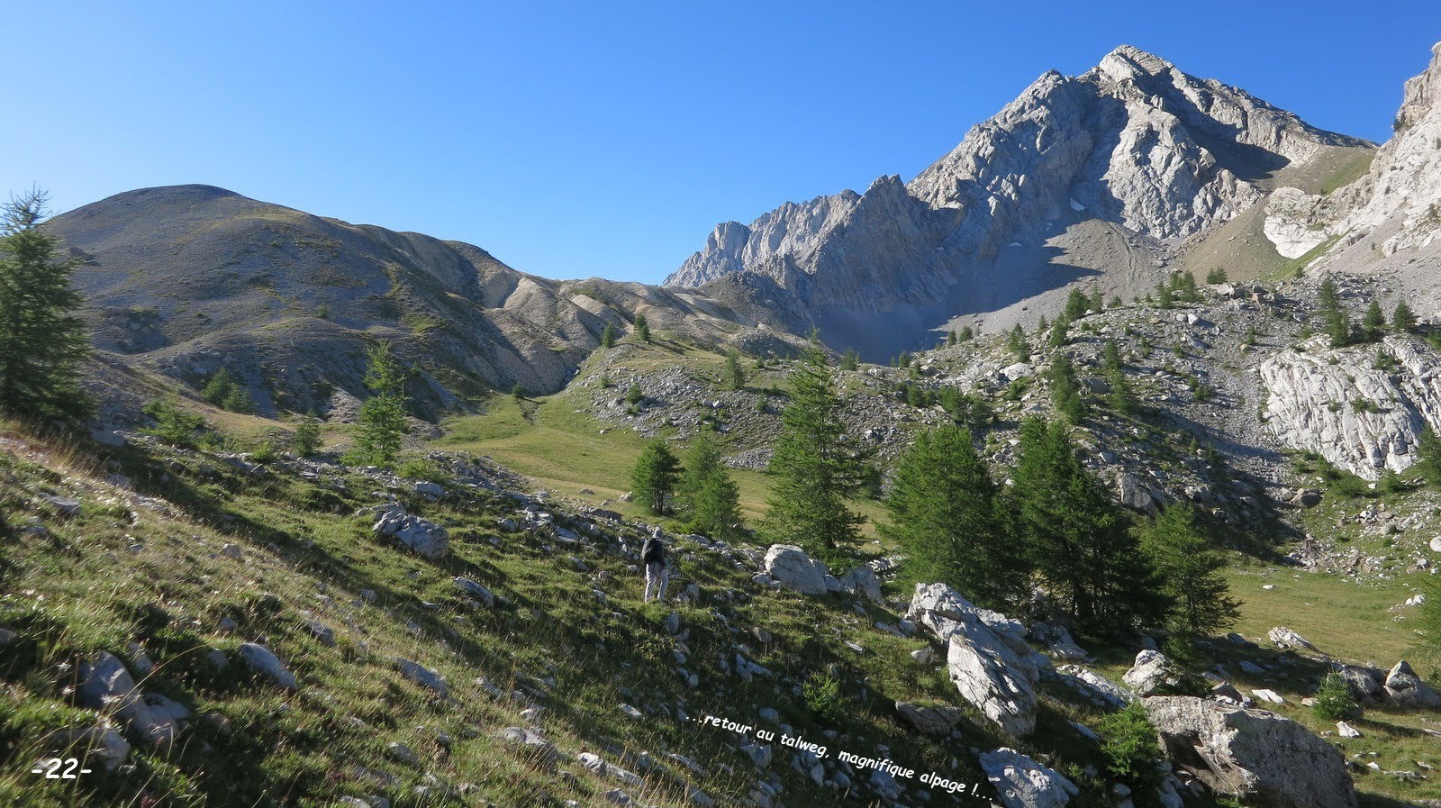 - de la micro-cabane de Berger scandaleusement mal entretenue, non répertoriée sur l'IGN à environ 2150 m, sous le Col de Terre Blanche à Château Renard le très ancien mélézin traversé est pour nous particulièrement remarquable.