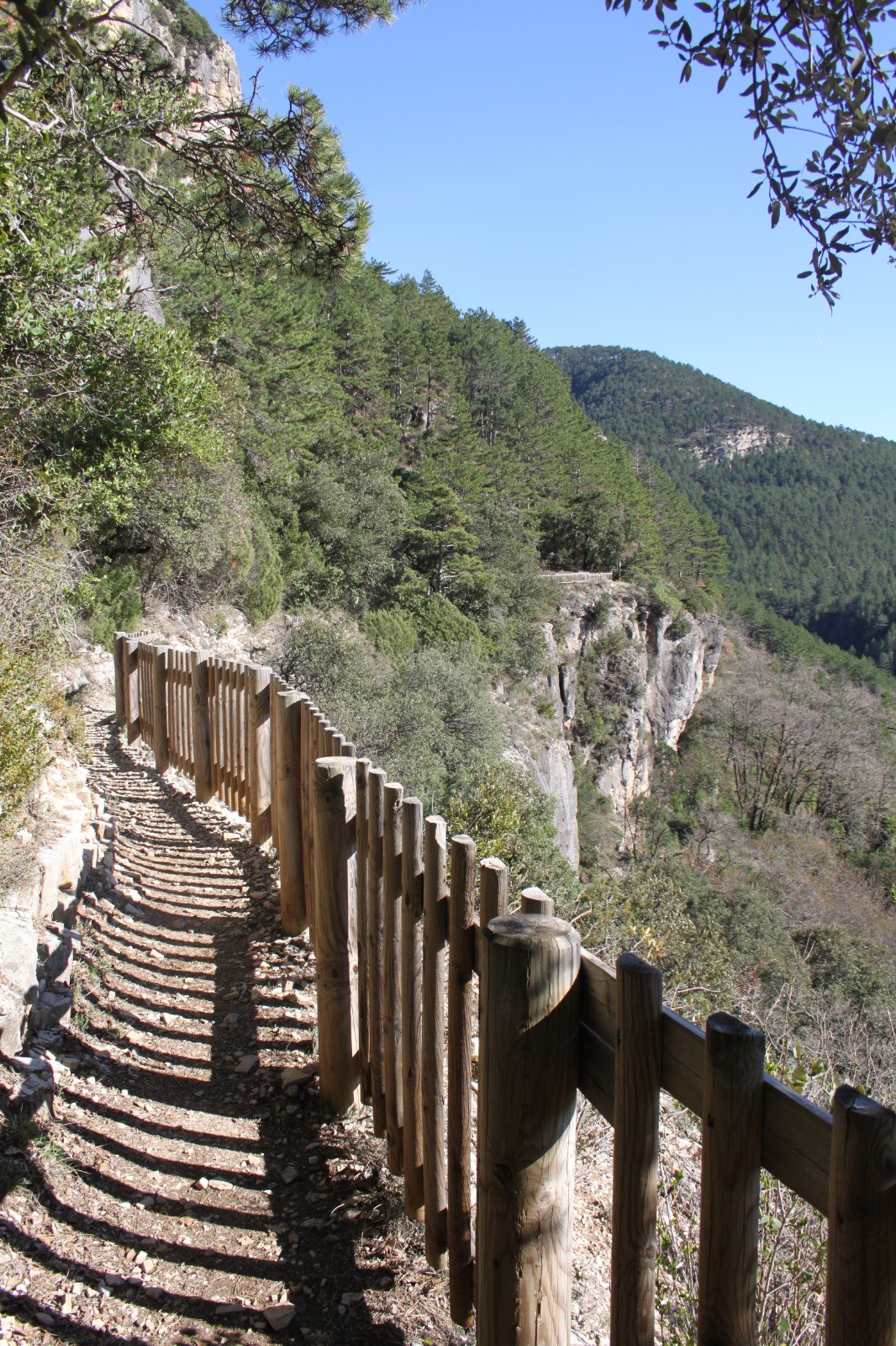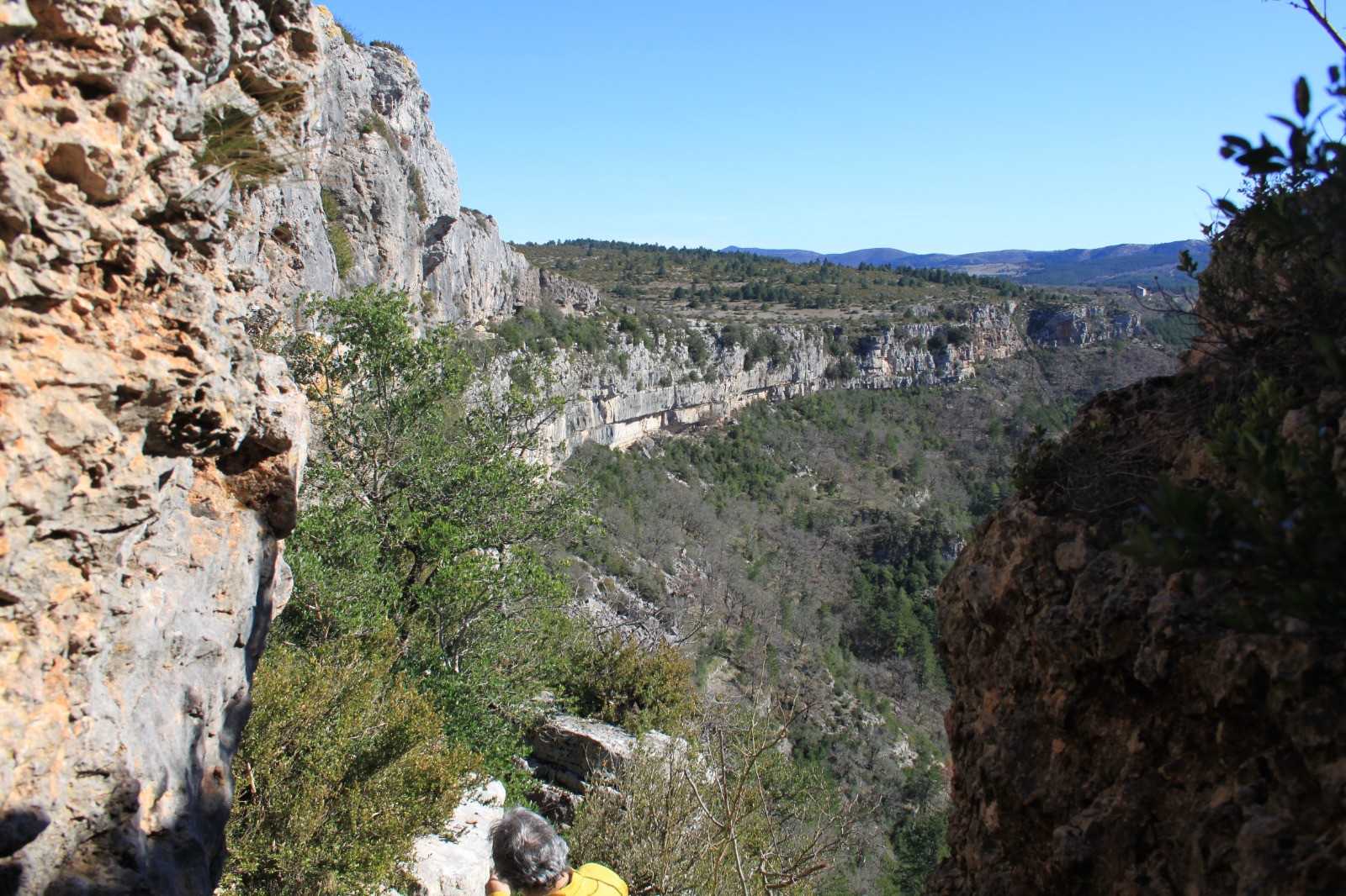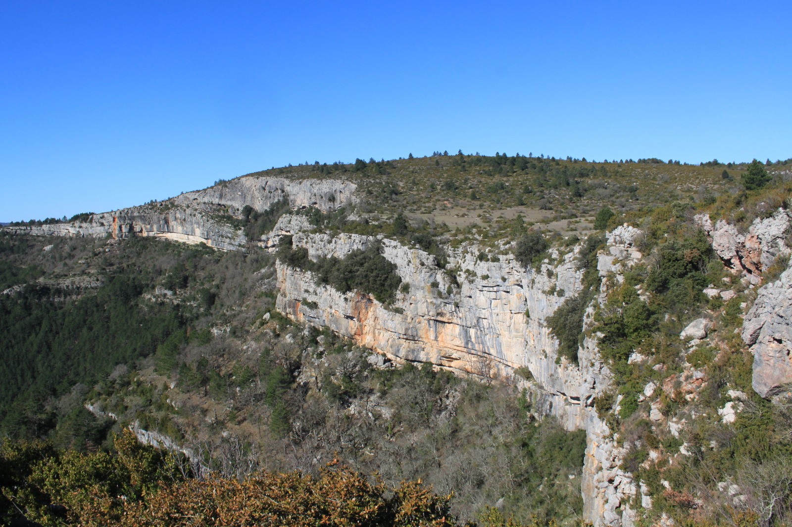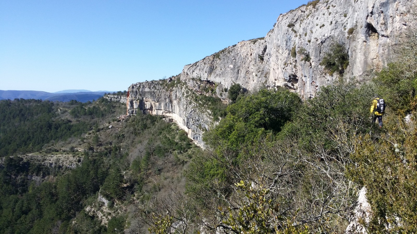 Résumé rando: Après un petit kilomètre d'échauffement sur route, une bonne petite montée d'un peu plus de 300m de dénivelé amène sur le plateau du Larzac dont on suit le rebord direction N jusqu'à la ferme de Laroque puis W sur le plateau. Continuer ensuite près du rebord du plateau pour trouver le début de la vire sous le bord supérieur de la falaise. A éviter après des pluies, rester vigilant , un ou deux passages où on s'aide des mains, mais beaucoup plus spectaculaire qu'en restant sur le plateau.