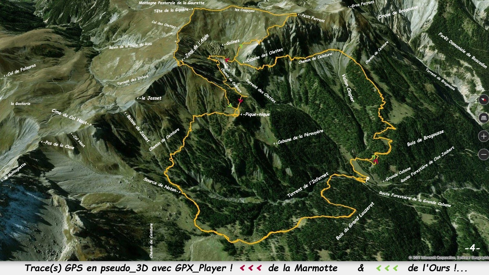 depuis le Pont de la Grande Cabane, 1611m, sur la Route Forestière homonyme depuis les Gendres, terminus de la D 90, route de la Montagne > sentier balisé du Col de la Rousse jusqu'au Chemin de Ceinture > la Cabane Pastorale des Olettes par ce spectaculaire chemin dans sa traversée des barres rocheuses de la crête Sud-Est du Petit Ferrant (ATTENTION ! en période d'estive le berger soi-disant maître des lieux, particulièrement caractériel, est tout autant agressif que son berger d'Anatolie, de toute évidence plus dressé pour attaquer les bipèdes que les loups, plus d'information en Nota Béné) > du départ du sentier du Col des Olettes, monter à vue dans l'alpage et, pour le spectacle, rejoindre la crête Sud-Est du Petit Ferrant, soit en contournant ses premiers ressauts par la gauche, soit, comme nous, en en faisant la visite complète moyennant deux petits passages rocheux faciles > au-dessus, l'alpage retrouvé, en remonter la large croupe > traverser la petite combe suspendue suivante horizontalement pour remonter la raide croupe suivante à proximité de la falaise et faire le tour de la mini-combe sommitale avant de rejoindre le cairn du sommet, 2440m, face au Gros Ferrant > suivre la large crête des Couguyes qu'il suffit d'enchaîner avec la traversée de la Tête de la Gipière, 2443m, au Col des Olettes (ou de Dormillouse !), 2372m; franchir la zone de dolines et monter au Joug de l'Aigle, 2494m, par sa crête Sud-Ouest qui s'effile de plus en plus tout en restant facile, mais en évitant tout dérapage intempestif sur ces terres jaunes puis noires dans la plus ou moins délicate traversée sous la barre rocheuse du bastion sommital qu'il faut contourner par la droite, rejoindre sa confortable vire herbeuse après le franchissement de son arête Sud-Est qu'il est déconseillé de suivre sans assurance jusqu'au Jasset > cette vire herbeuse conduit à la voie normale du sommet moyennant une escalade facile de moins de 10m avant de rejoindre un large couloir herbeux qui conduit directement au cairn sommital (beau 360°, beaucoup plus aérien que les deux précédents !) > de retour au pied du rocher, continuer la vire jusqu'à la crête Nord qu'il suffit de descendre par son fil jusqu'au Chemin de Ceinture, techniquement très facile, elle est malgré tout assez impressionnante au début à cause de son austère rive gauche particulièrement raide et noire ! ensuite la sente est de plus en plus confortable et très agréable l'alpage retrouvé > de la croupe suivre encore un peu le Chemin de Ceinture, puis jouer avec les sentes à vaches de manière à passer sous et au plus près de l'aiguille rocheuse, cotée 2132m, avant de rejoindre la Source de Naton > retour parking par le sentier et les draines du Bois du Grand Lauzerot.