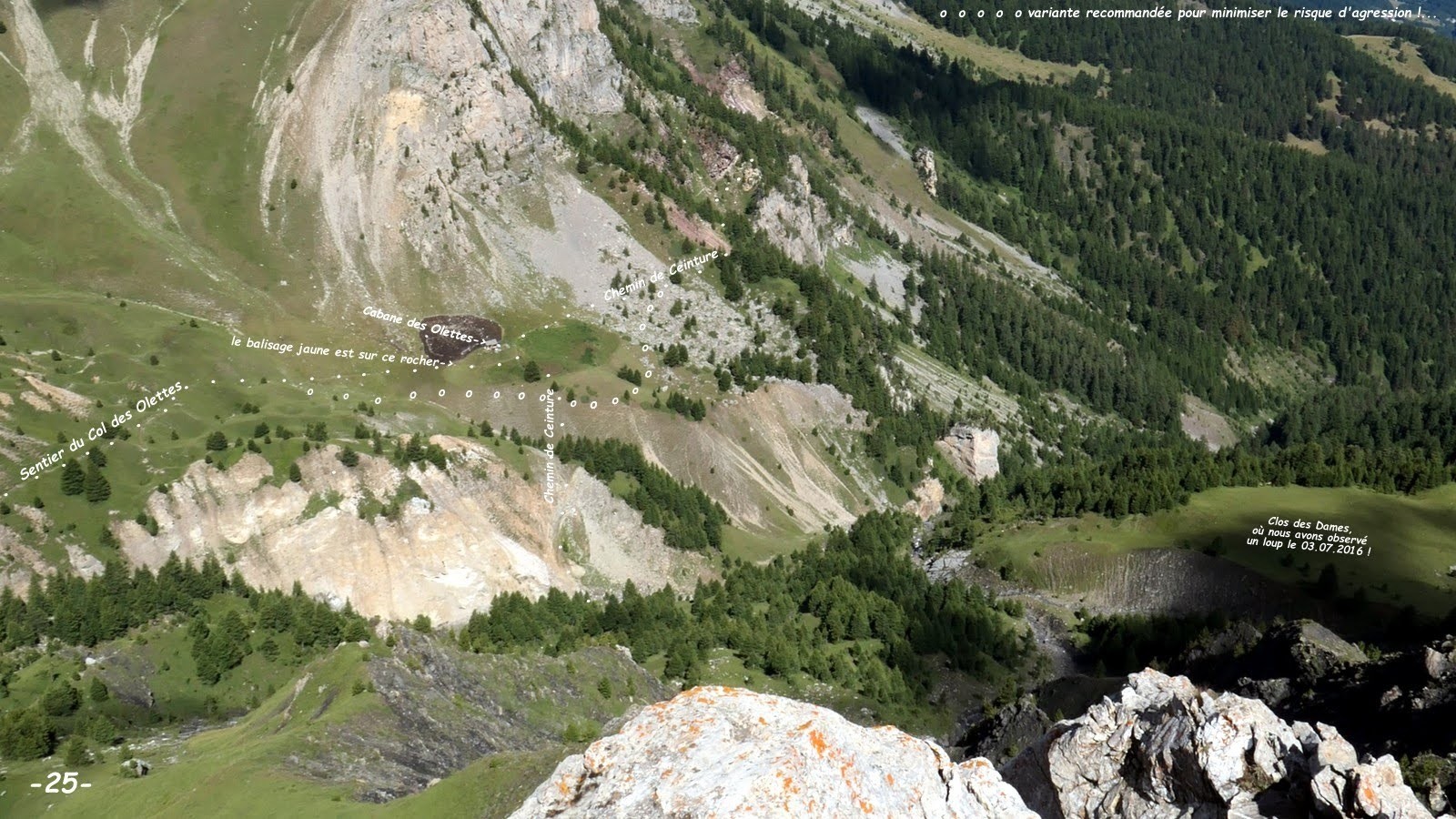 Description factuelle de l'évènement : en arrivant à la Cabane des Olettes, nous trouvons le Chemin de Ceinture canalisé entre deux filets à moutons, celui de droite monte à travers un pierrier jusqu'à la falaise, celui de gauche semble descendre jusqu'au talus avant le ravin du Torrent des Olettes, en conséquence de quoi nous pensons de toute bonne foi que cet état de fait a été spécifiquement créé par le berger pour que les usagers soient contraints de bien rester sur le chemin pour traverser cette zone sensible de parcage. Arrivés en vue de la Cabane deux inoffensifs patous déboulent sur nous, nous sentent et puis s'écartent, nous laissant le libre passage. Nous continuions notre progression quand un berger d'Anatolie des plus agressifs se précipite sur l'Ours qui avait pourtant pris la précaution de quitter ses lunettes de soleil, sachant très bien qu'il faut toujours que la bête puisse voir nos yeux et l'expression de notre regard, s'est immobilisé son bâton contre le corps, le temps que le molosse vienne le sentir. Mais que nenni, ce dernier l'a mordu à la cuisse droite et bousculé dans le filet du bas dans lequel il s'est entravé vu le poids de la bête, s'est trouvé propulsé dans la pente en effectuant un impressionnant roulé-boulé arrière, fort heureusement sans gravité grâce à son sac à dos, l'absence de rocher et sa faculté à se mettre en boule. Littéralement effrayée, je me suis effectivement emportée en criant aux deux jeunes assistante et assistant du berger de bien vouloir arrêter leur chien qui, l'Ours dans le décor, s'était précipité sur moi, protégée par mes deux bâtons devant moi. C'est alors qu'a déboulé à son tour le soi-disant maître berger, son SM à la main et dans un état de furie inimaginable :
