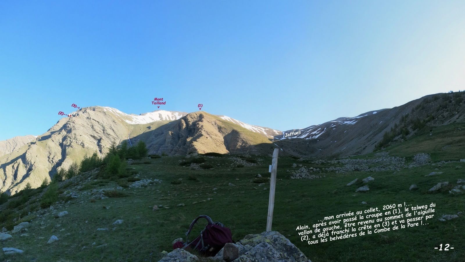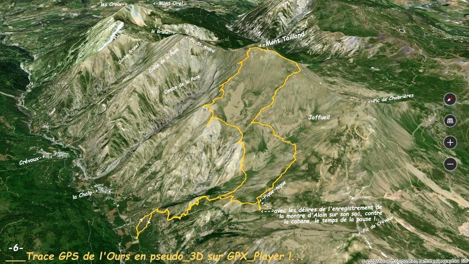 depuis le 2ième parking, 1670 m, de la Chalp de Crévoux > le sentier du Col de Jaffueil ou de Crévoux jusqu'au collet, 2060 m, d'accès direct au vallon de Jaffueil > en rejoindre le talweg par une vague sente à moutons qui traverse le pierrier > la poursuivre sur toute la croupe au-dessous de la cote 2365 m > de là, traverser au mieux (forte pente) pour rejoindre la croupe opposée du vallon suspendu du versant Sud du Mont Tailland, cote 2578 m, en passant au plus près de sa rupture de pente, 2400 m, > pour le spectacle, remonter la forte pente pour accéder au plus court à la dite croupe sans oublier au passage l'aller-retour au sommet, 2420 m, de l'aiguille qui domine le parking du départ (forte sensation !) > remonter en arc de cercle gauche pour enfin rejoindre la nervure de la rive gauche de la Combe de la Pare, 2540 m (suite du festival de fortes sensations !) qu'il est conseillé de poursuivre en explorant tous ses différents belvédères jusqu'au bouquet final de l'arrivée en crête à l'Ouest du sommet, 2938 m > descente par sa longue crête Est jusqu'à la verticale de la croupe en rive droite du vallon de Jaffueil > la descendre jusqu'à 2480 m, d'où il est plus facile de traverser en passant par son talweg, coté 2377 m, pour remonter jusqu'à 2400 m de manière à rejoindre au plus facile la longue croupe de sa rive gauche > qu'il suffit de descendre jusqu'à la Cabane de Jaffueil (cette trace évite au maximum toutes les installations de la liaison Vars-Risoul par le Pic de Chabrières) > retour parking par le sentier de la Cabane.