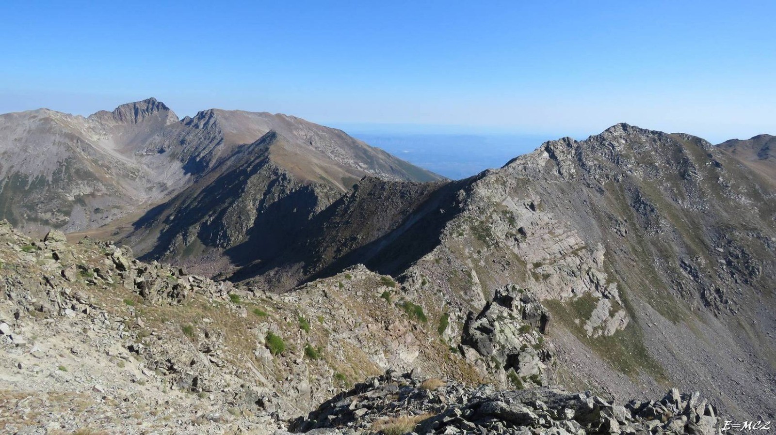 Suivre la crête pour aller au Pic des Sept Hommes via le Pic de Bassibès. Descendre au Coll dels Bocacers par le cheminement cairné et balisé, jaune. Passer un petit mamelon donnant accès au Pla Guillem. Avant d'atteindre celui-ci obliquer progressivement à droite pour rejoindre la piste descendant au Col de Mariailles. A la Collade de la Roquette couper les lacets de la piste en descendant par le GR du Tour du Canigou, balisé rouge blanc, puis suivre la piste jusqu'au Col de Mariailles.
