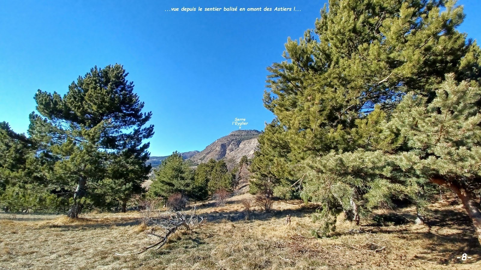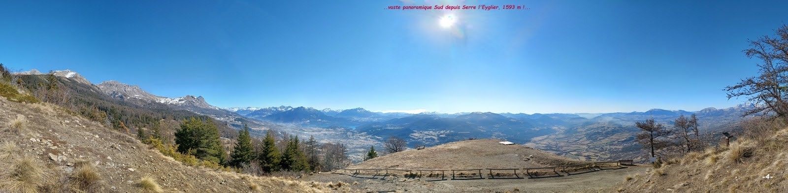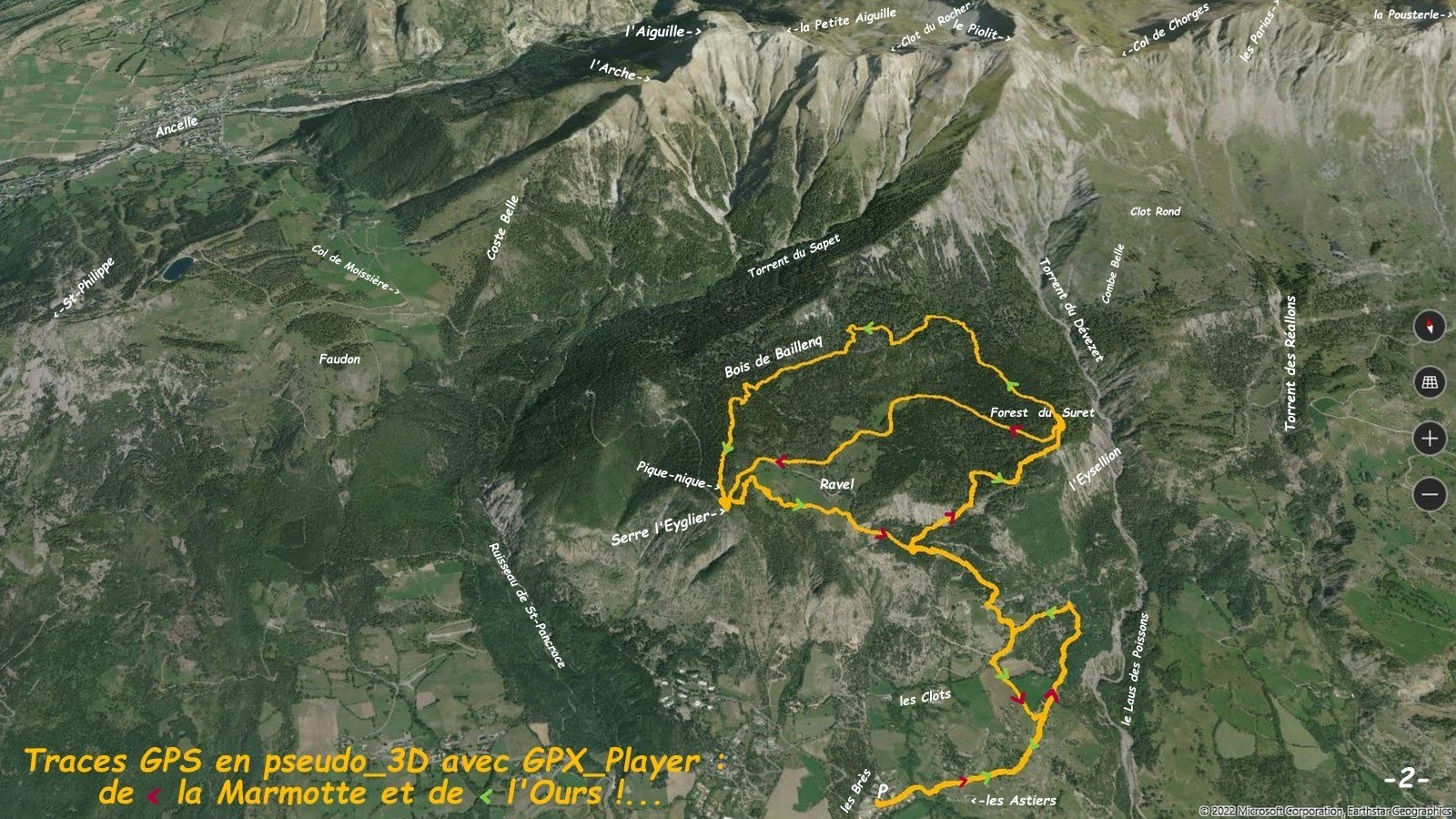 depuis le petit parking des hauts des Brès à gauche avant la rue des Astiers > partir par cette rue jusqu'au départ du sentier balisé signalé par un panneau > le suivre direction Serre l'Eyglier par la boucle du Forest du Suret jusqu'à son épingle à pratiquement 180° pour rejoindre Serre l'Eyglier par la route forestière support du GR 50 - GRP Tour du Lac de Serre-Ponçon > de là nous a pris l'envie de tenter de grimper jusqu'à la longue crête Sud-Ouest du Piolit pour ensuite la redescendre jusqu'à Serre l'Eyglier, lieu de rendez-vous avec la Marmotte et de pique-nique > sauf qu'à 12h, à force de ne pas vouloir monter tout droit, nous en étions encore à pinailler 100m de dénivelé sous la crête et décidions d'en rester là pour aujourd'hui et de couper au mieux au plus court en utilisant le plus possible les multiples draines du Bois de Baillenq > pour arriver pile poil à la table de pique-nique en même temps que la Marmotte > retour par une variante peu recommandable à son début (peut mieux faire que notre trace !) pour rallier les points de vues de Serre l'Eyglier et de la cote 1502m en aval de Ravel au plus direct en passant par le bas de ce bel alpage > de retour sur le sentier balisé le suivre jusqu'à sa franche bifurcation vers l'Est, d'où nous avons préféré le rejoindre plus bas via le sentier de droite jusqu'à sa jonction avec la route forestière puis une piste agricole quasi rectiligne jusqu'au bout du champ dont il suffit de descendre le talus et suivre à gauche le sentier qui ramène sur le balisé du départ, le suivre en sens inverse et retour parking.