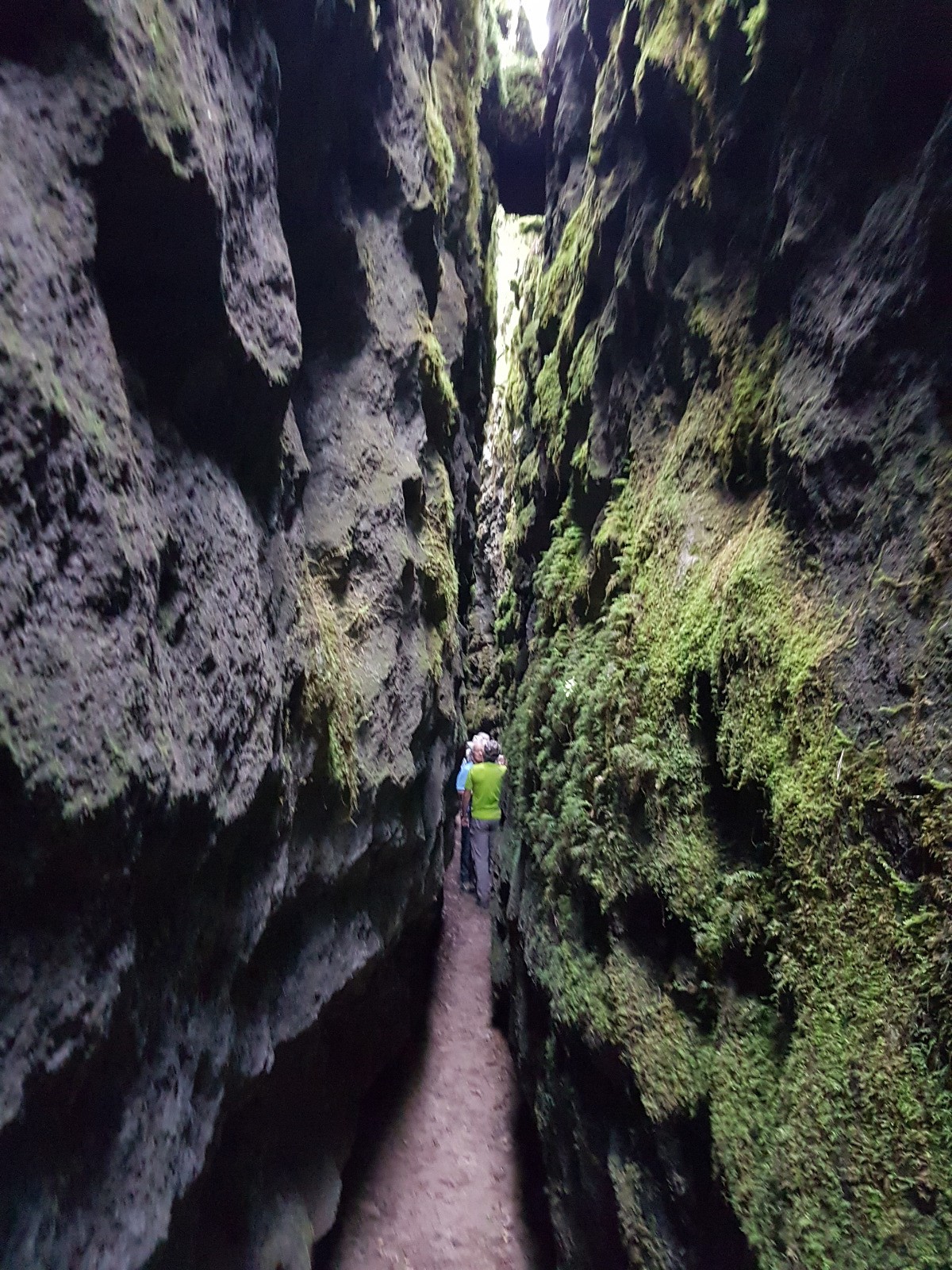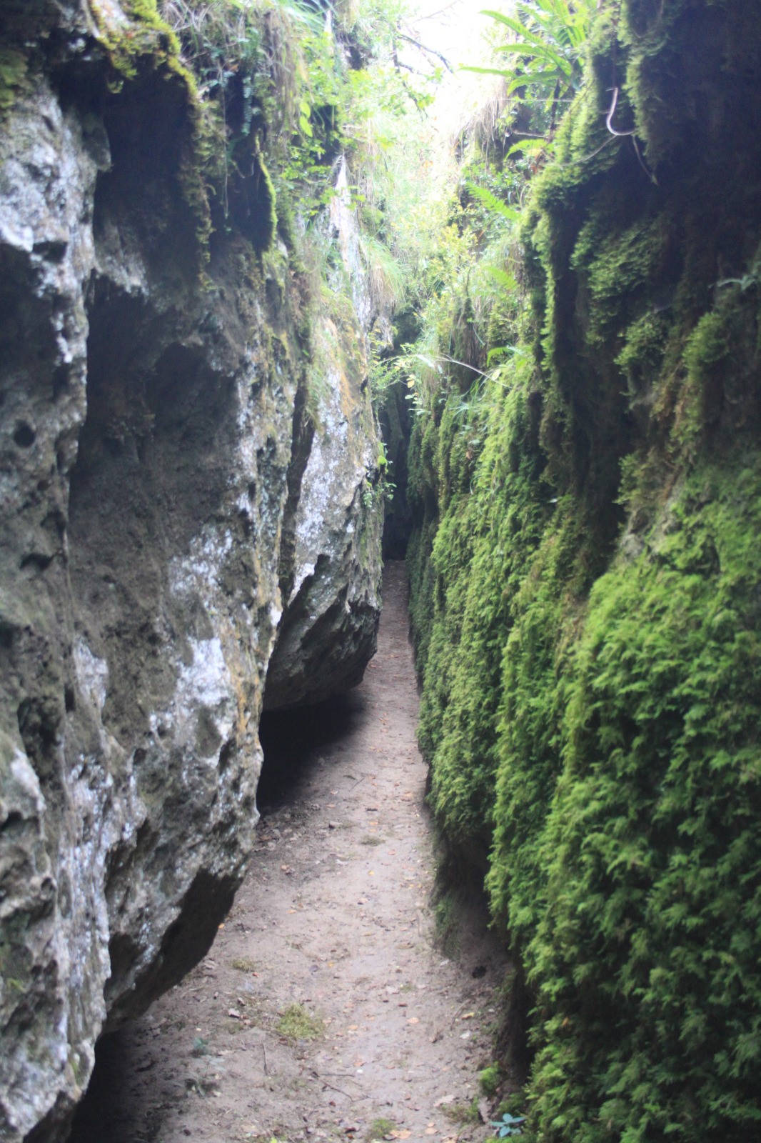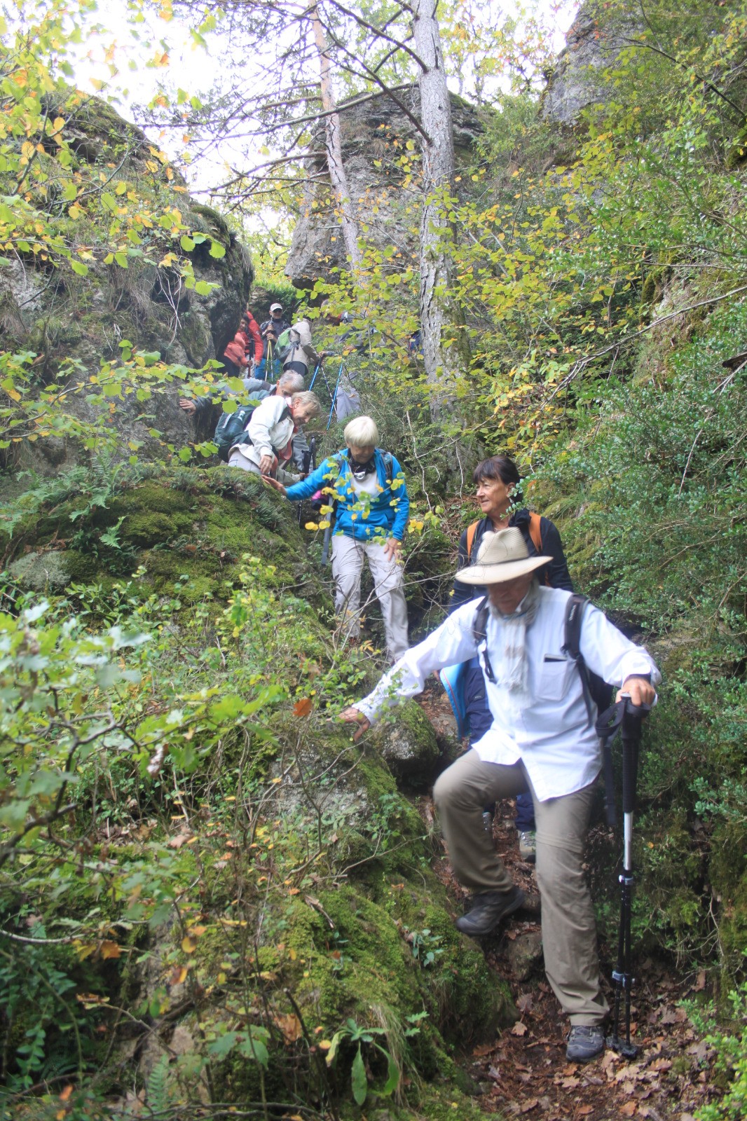 Prendre à droite. On suit direction nord une sente, quelques marques en bleu, qui se faufile dans un sous bois. On longe la faille où se situe la canaule sur la gauche du sentier. On arrive un peu plus loin dans à un replat avec un cairn. A gauche, en s'avançant, on a un point de vue sur la canaule que l'on surplombe. On continue encore la sente vers le Nord, en suivant les points bleus, et on va pouvoir descendre vers l'entrée nord de la canaule. Cette canaule, la plus à l'Ouest, est la plus longue et la plus profonde du site. En se rapprochant de l'extrémité sud, elle se rétrécit, il faut tomber le sac à dos et se mettre de profil. Au bout, déjà dans l'obscurité, on a un trou qui donne sur une galerie et une faille parallèlle à la canaule, toujours direction sud , mais les lampes sont nécessaires et ce n'est plus de la rando mais de la spéléo.