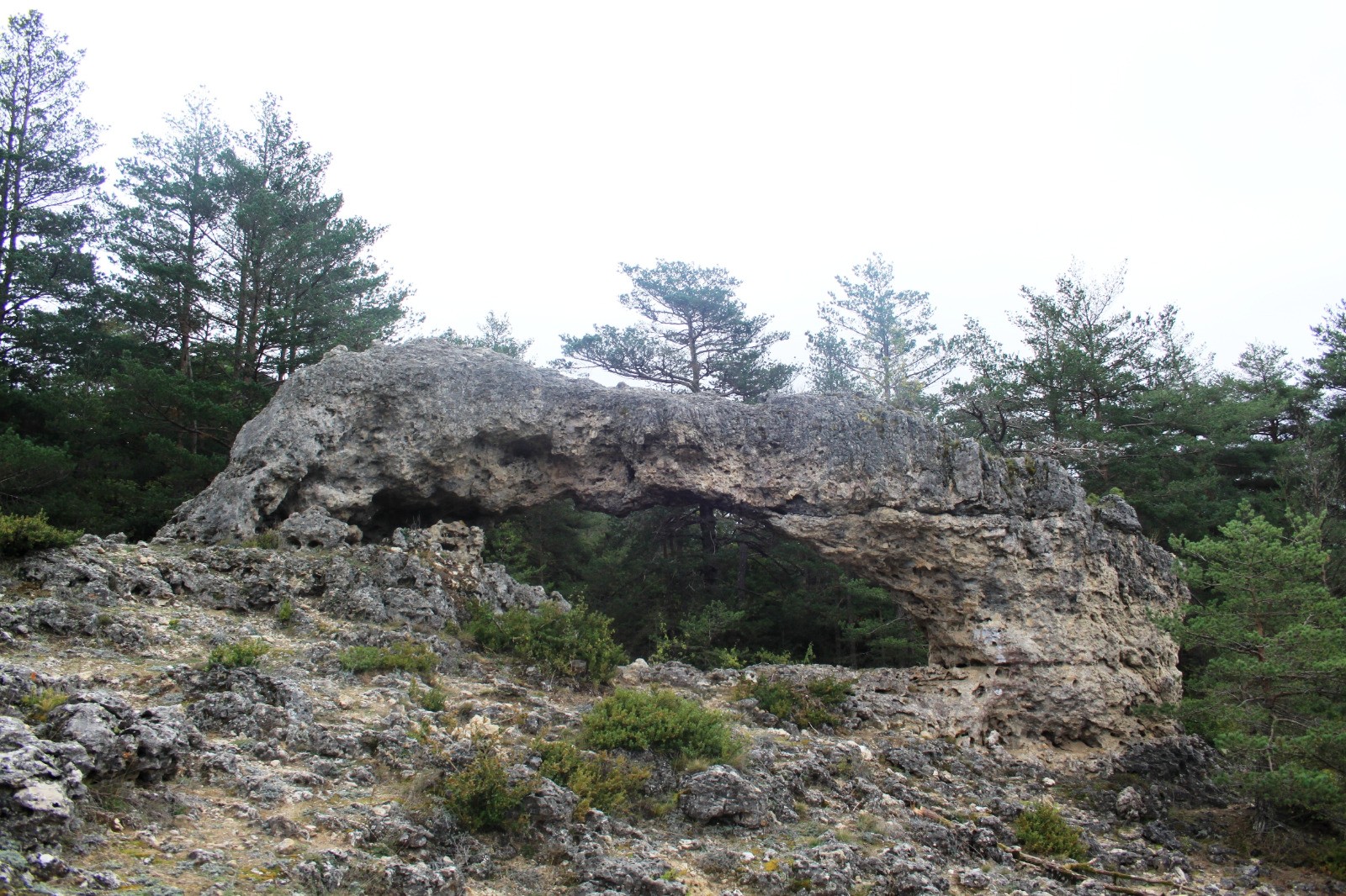 A l'autre extrémité du bassin démarre un sentier balisé en jaune qui monte fortement. Quelques passages dans les rochers nécessitent de mettre les mains mais il n'y a absolument aucune difficulté. Toutefois, la montée est ardue mais elle ne dure qu'un bon quart d'heure. En haut, on se retrouve sur le causse, le sentier devient presque plat, zigzague dans une pinède aux sous bois fournis puis débouche sur un grand chemin. Panneau « Forêt Domaniale du Causse du Larzac ». Aller à gauche. Une dizaine de minutes de marche reposante à plat sur un tapis d'aiguilles de pin délassent les jambes après la petite grimpette. On arrive à un panneau sur la droite indiquant l'abri des Canalettes. On peut faire un petit aller-retour d'à peine cinq minutes pour aller voir un abri préhistorique sous roche. Explications sur un panneau. De retour au chemin, on marche une minute et on débouche dans une pinède avec en sous bois des jeunes plants protégés par des grillages. Bien faire attention et repérer le départ d'un sentier sur la droite (a cet endroit, nous sommes proches de la maison forestière visible après une légère courbe à gauche de la piste). Le départ du sentier est peu marqué dans la plantation (il se situe 20m avant le départ d'une plus grande piste à droite). Le sentier est ensuite bien mieux marqué, toujours bien revêtu et agréable à marcher. On progresse une grosse dizaine de minutes globalement en direction W et globalement en montée. Après une courte descente sur une cinquantaine de mètres, on débouche à un point de vue sur une zone de chaos dolomitique.