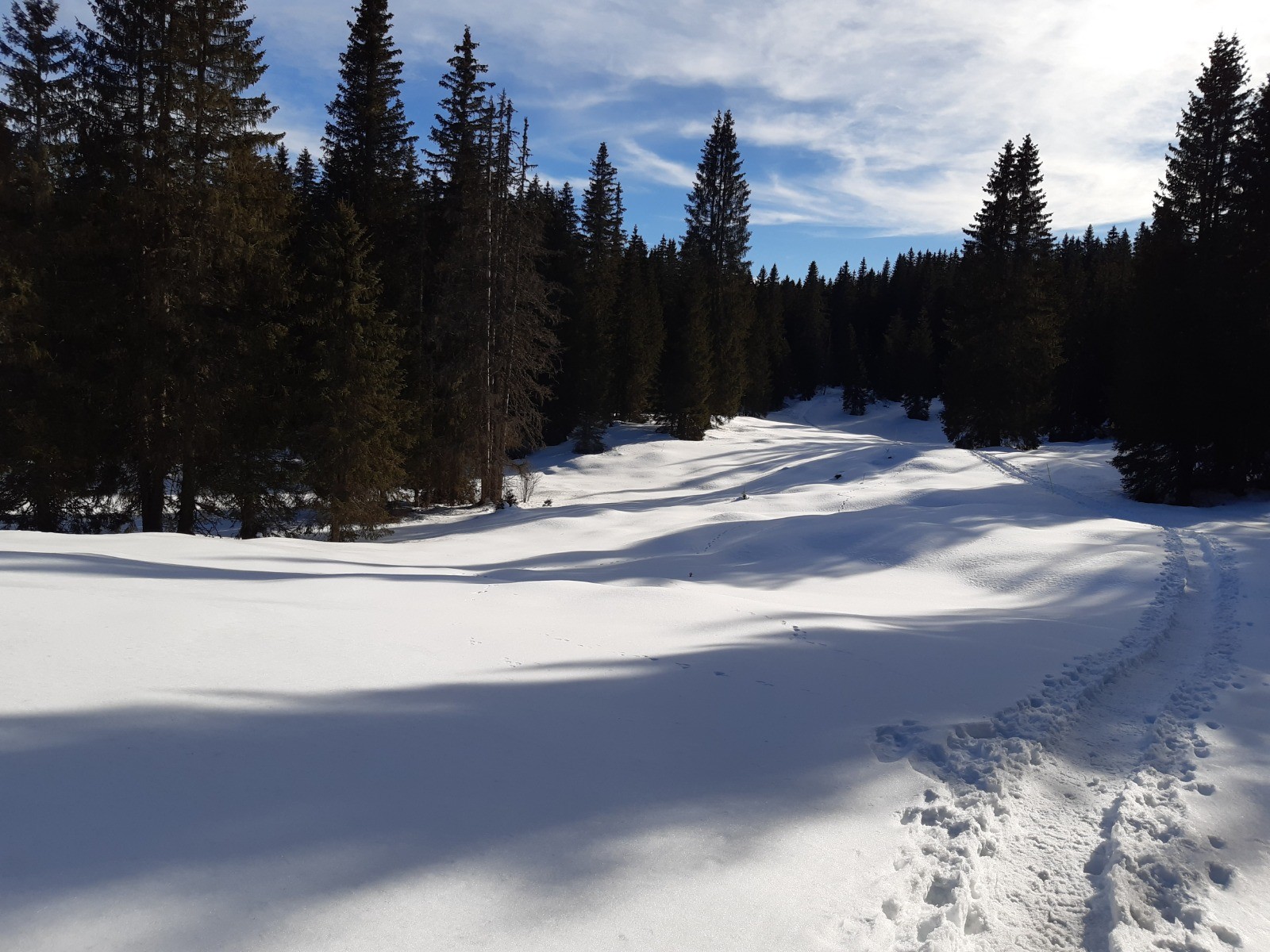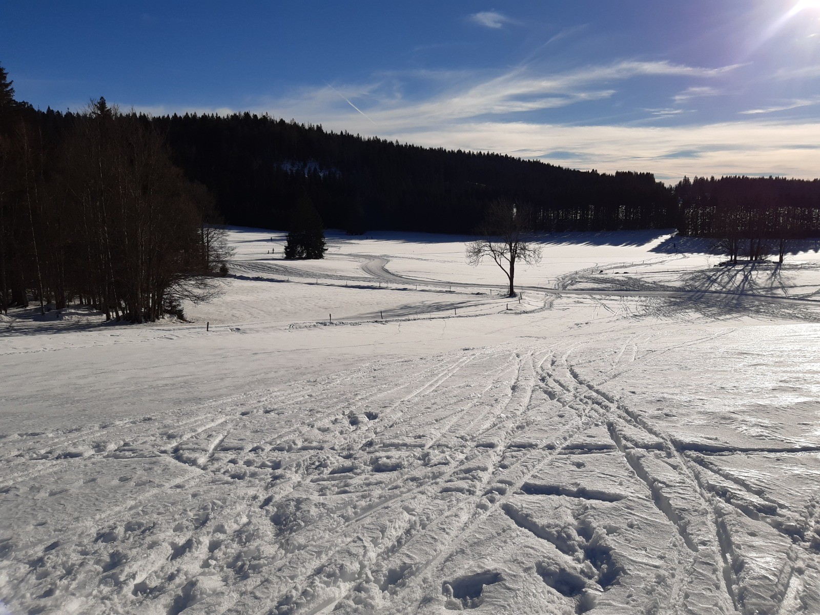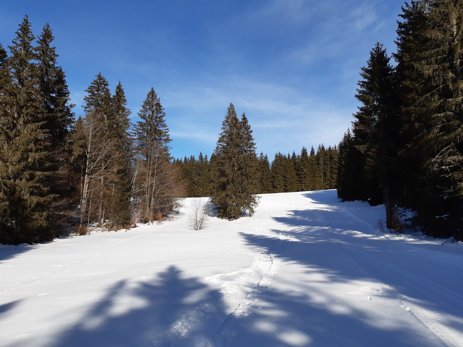 Nous sommes partis du P2, au Haut de la Combe, entre les Gentianes et le Glacier. Prendre la liaison entre la piste des Blanches et celle du Chalet Rouge. Après un peu plus de 2 km, on rejoint le point de vente des forfaits du Glacier. Emprunter la piste "les Bornes" qui monte dans la forêt en direction des Prés Hauts. Rester sur cette piste très bien balisée. Environ 1 km après avoir traversé la route, on arrive au croisement des pistes "Les Bornes" et "Le Chalet Rouge" : ne pas prendre la direction du P3 qui ramène au Glacier, mais continuer en tenant la droite sur la piste du "Chalet Rouge ". On rejoint 1,5 km plus loin la liaison 7 qui nous ramène au point de départ.