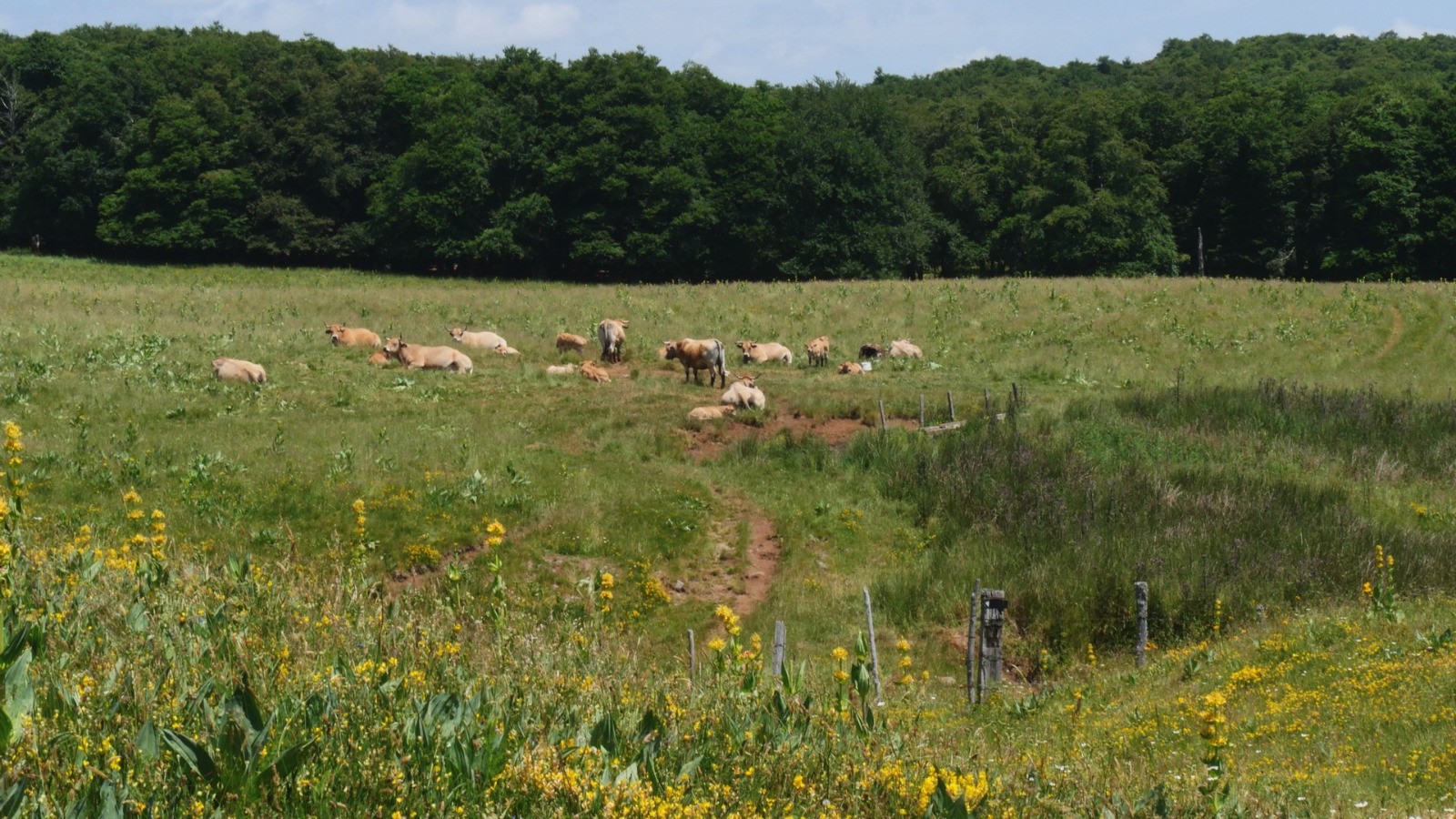 Troisième journée dans l'Aubrac, entre St Chely d'Aubrac et Laguiole, encore des paysages différents, toujours les vaches sur le parcours, prendre ses précautions car un seul point d'eau potable sur le parcours, très gênant en période chaude, le parcours faisant 25 km.