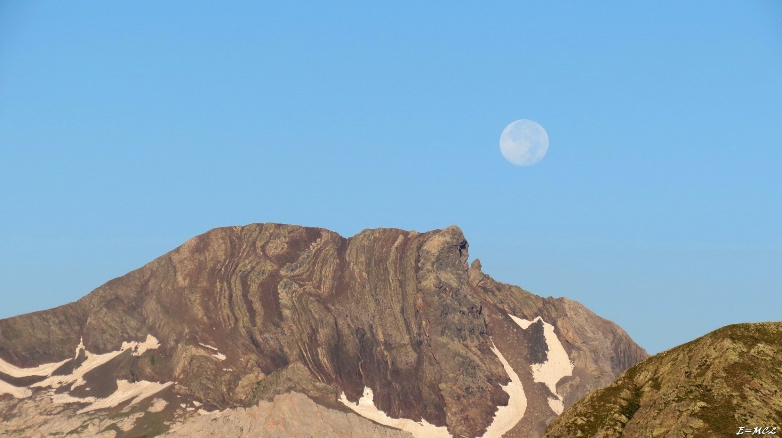 Du bivouac à l'Ibon de Salcorz revenir au Port de Héchampy et continuer le parcours sur la crête frontière. La croix frontière 324 se trouve normalement à l'est du col, mais on ne l'a pas trouvée. La montée au Pic de Marty Caberrou ne présente pas de difficulté particulière. Par contre au-delà du pic, l'approche vers la Punta Marcatiecho, 2654 m non mentionné sur la carte IGN, devient problématique. On a évité le fil de l'arête en descendant un peu versant français. Devant le ressaut final de la Punta Marcatiecho à la roche peu engageante on a préféré descendre pour le contourner par le nord et reprendre la crête dès que possible et monter au sommet par le versant est. Descendre en suivant le fil de la crête au col 2489, traverser la Punta de Roldan, 2545 non mentionné sur la carte IGN, précédent l'arrivée sur le Port du Moudang où on y trouve la croix frontière 325.