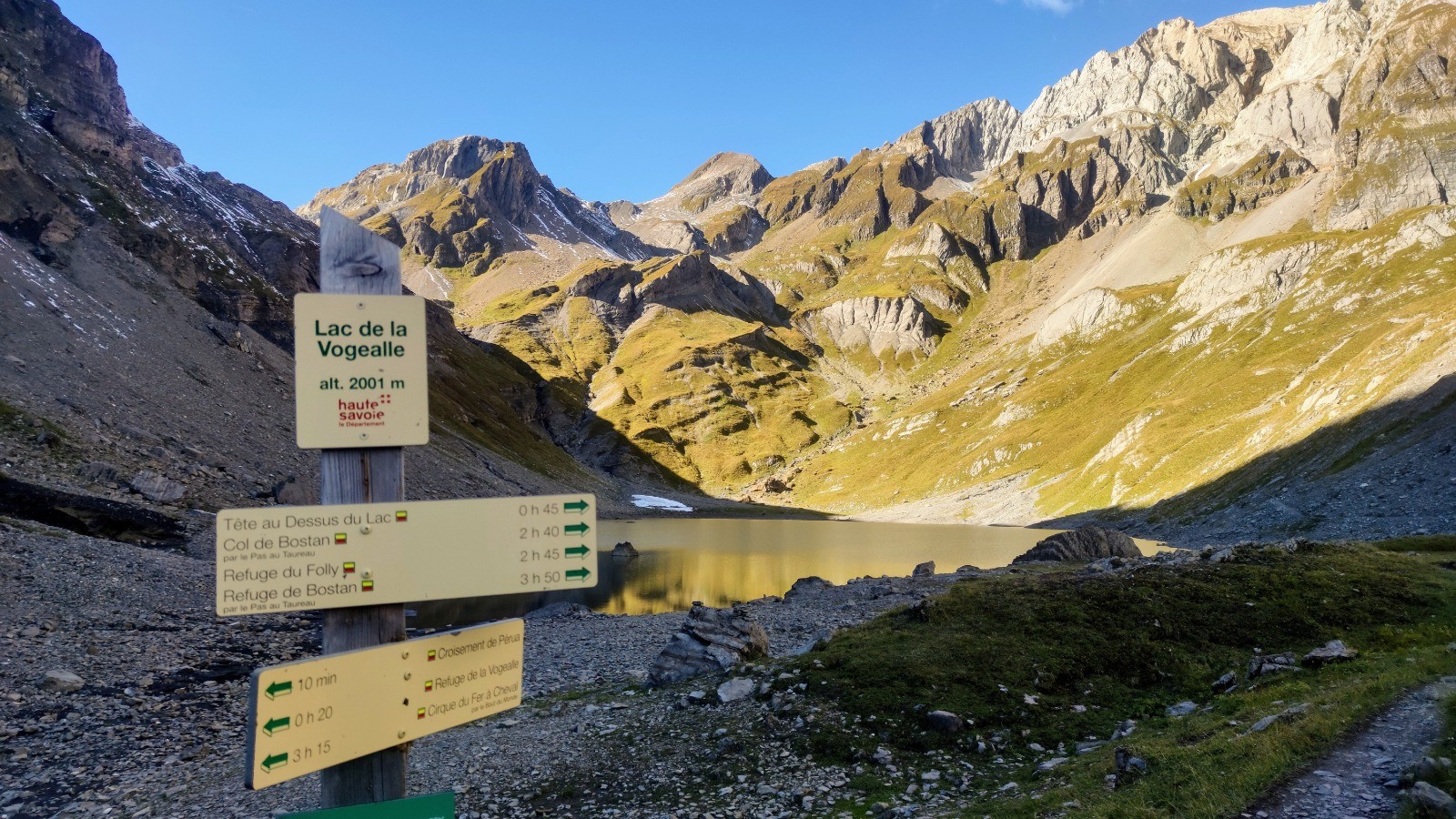 Montée : Par le Pas du Boret puis le Chalet du Boret (1380m) la Pierre du Dard (1635m), le Refuge de la Vogealle (1905m) et enfin le lac de la Vogealle (2001m).
