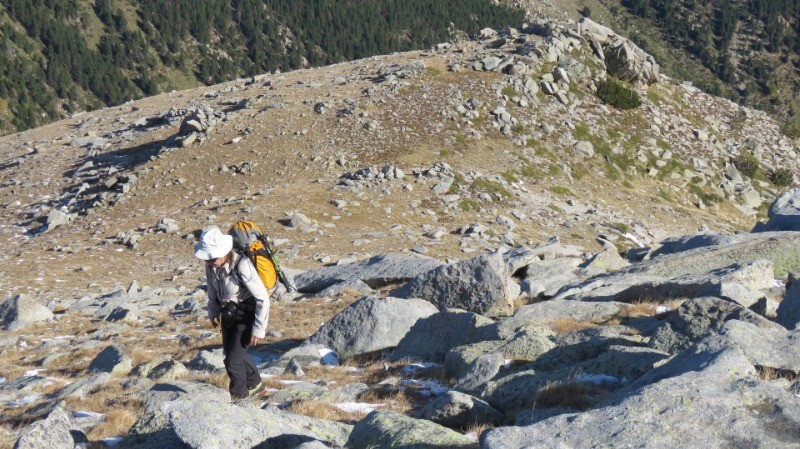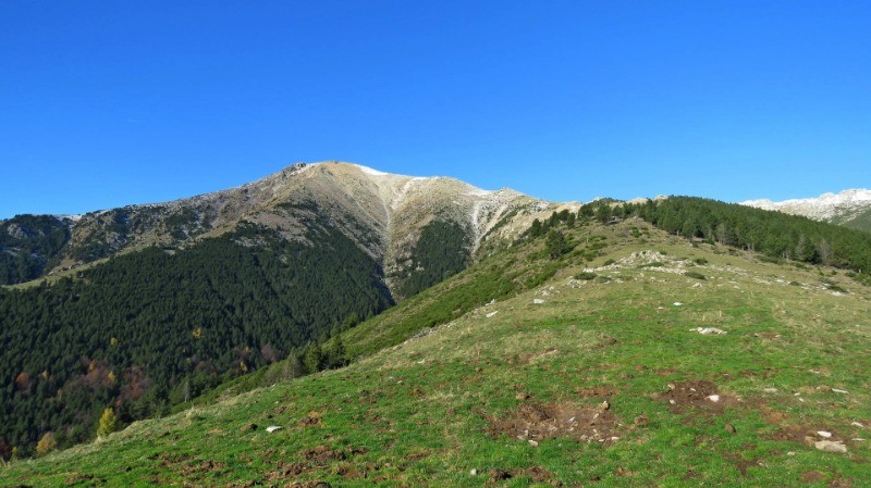 Du sommet descendre vers l'ouest en direction du Coll del Pal en restant sur la ligne frontière. Peu avant le col, un gros cairn est censé marquer le passage du méridien de Paris. En réalité le méridien passe quelques mètres plus loin, repéré par une petite borne noire.