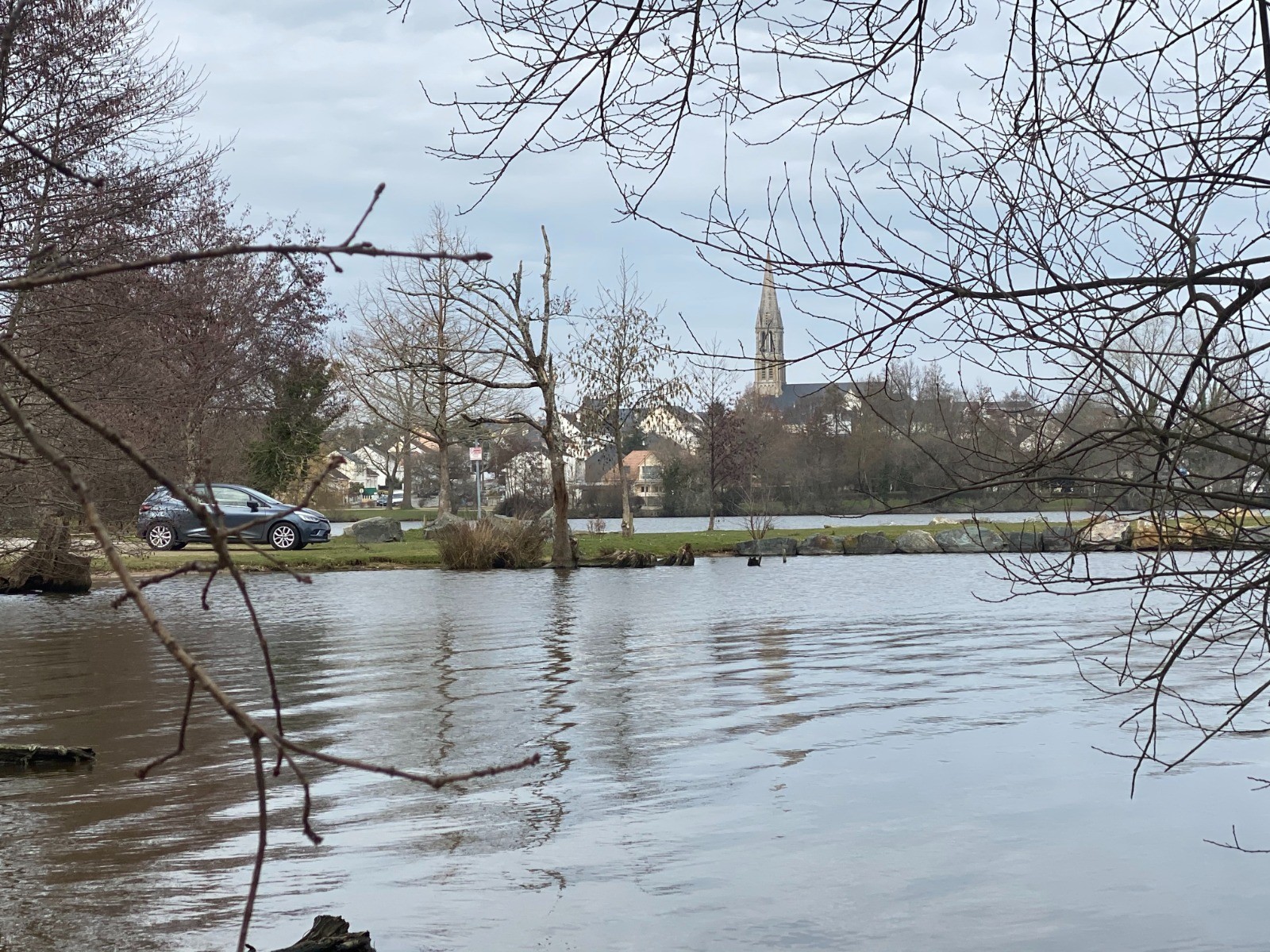Du parking, juste en face, l'imposante église de l'Immaculée se reflète dans l'eau.
