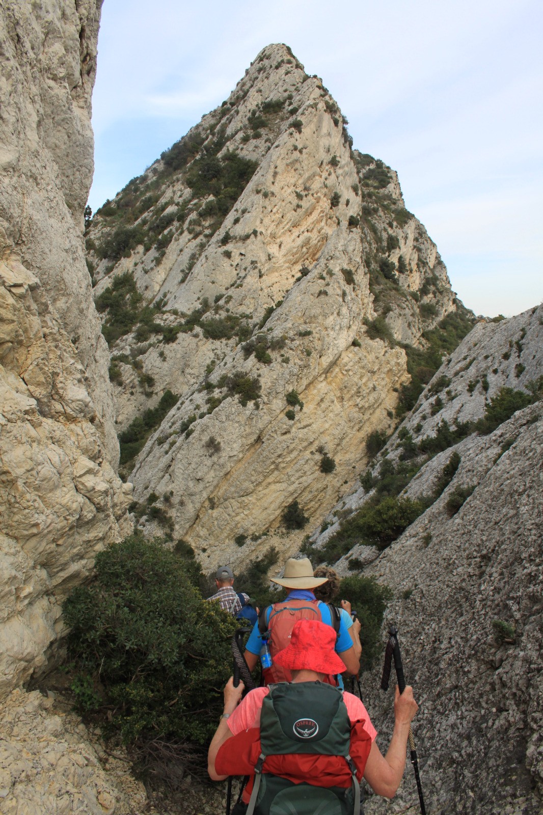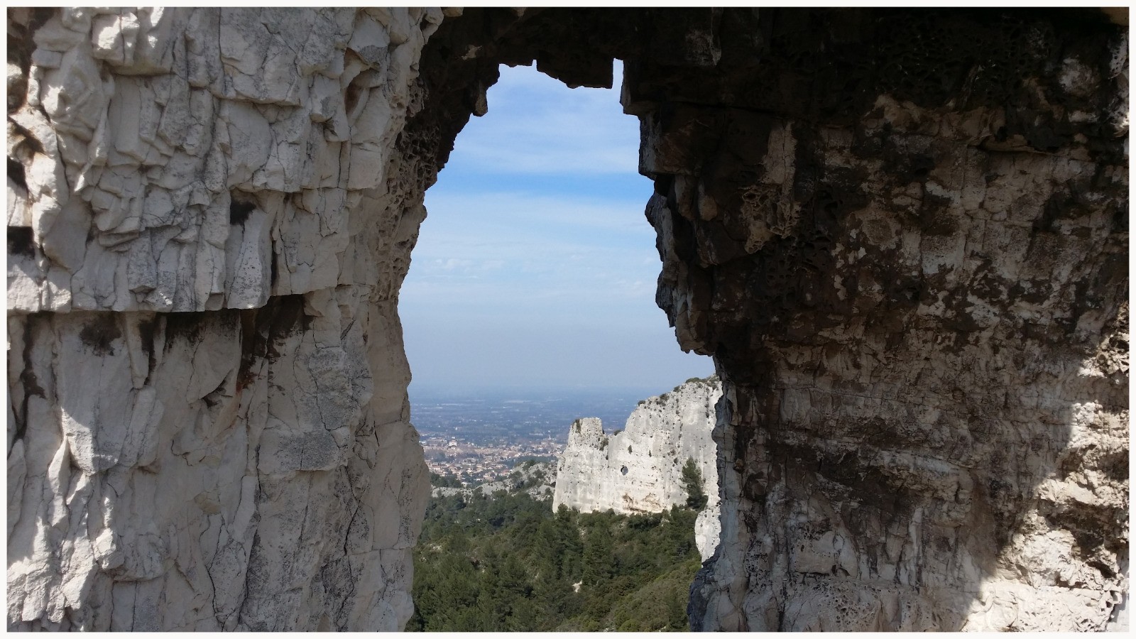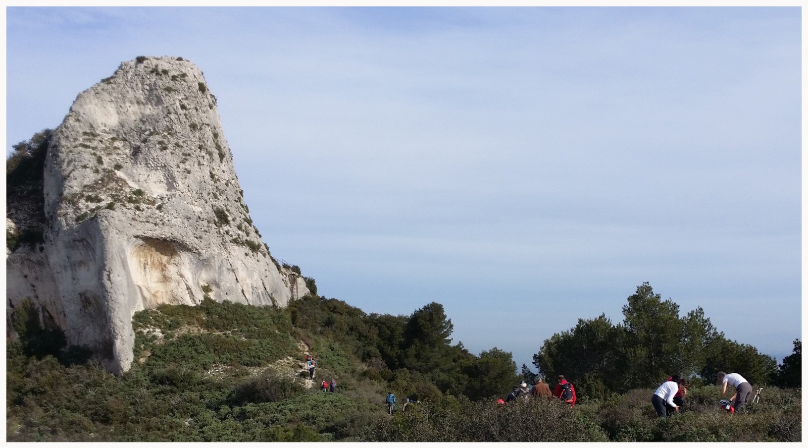 On longe ensuite les fouilles du Glanum sur notre droite pour remonter le vallon de St Clerg. Vers la cote 190m, on laisse la piste pour prendre à gauche le sentier en direction du rocher des Deux Trous. Montée bien raide sur environ 100m de dénivelé. Après un bon pique nique sur la plate forme à coté des deux trous, on continue toujours vers le Nord par une piste descendante pour rejoindre à la cote 302m la route goudronnée que l'on prend vers le plateau de la Caume et son énorme tour bien visible. A partir de là, nous suivons le GR6, en passant par le pas de l'Aigle.Le sentier suit plus ou moins le fil de la crête, direction Est , alternant descente jusqu'à la cote 353 où il descend plein sud sur une quarantaine de mètres, puis reprend un cheminement un peu accidenté vers l'est, versant sud au pied des falaises . On atteint le col de Vallongue, d'ou l'on plonge plein Nord par un passage étroit dans la diaclase, puis un tunnel végétal ,et une descente assez raide jusqu'à une piste. Pas d'avion et planeurs sur la piste aujourd'hui, ce qui nous a permis de couper à travers le pré, sinon il faut contourner l'extrémité sud de l'aérodrome en suivant le GR6.et arriver aux voitures déposées le matin,