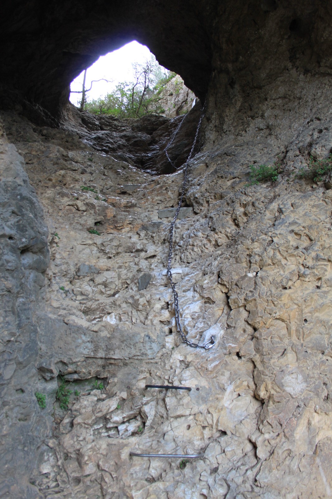Au bout du lac, sur la droite, le GR grimpe à travers les rochers puis traverse une grotte, Court passage à escalader équipé de chaines et barreaux métalliques scellés dans la roche. Après le passage au travers de la grotte, le sentier redescend à travers bois pour rejoindre la D5 avant l'entrée de Saint Rémy. Continuer jusqu'au niveau du parking des Antiques du Glanum, traverser la route, puis un peu plus loin, prendre à droite direction EHPAD , puis ensuite tourner encore à droite direction Nord.