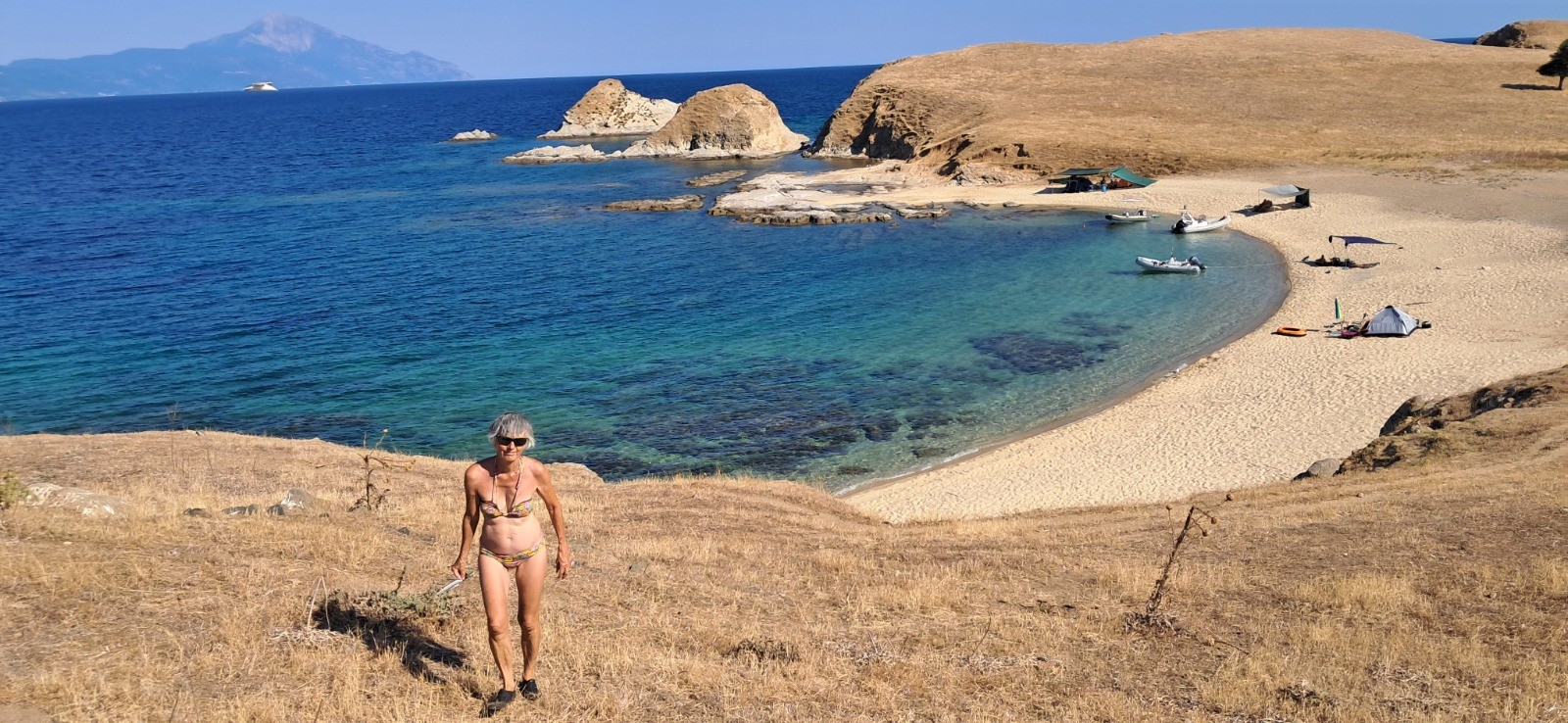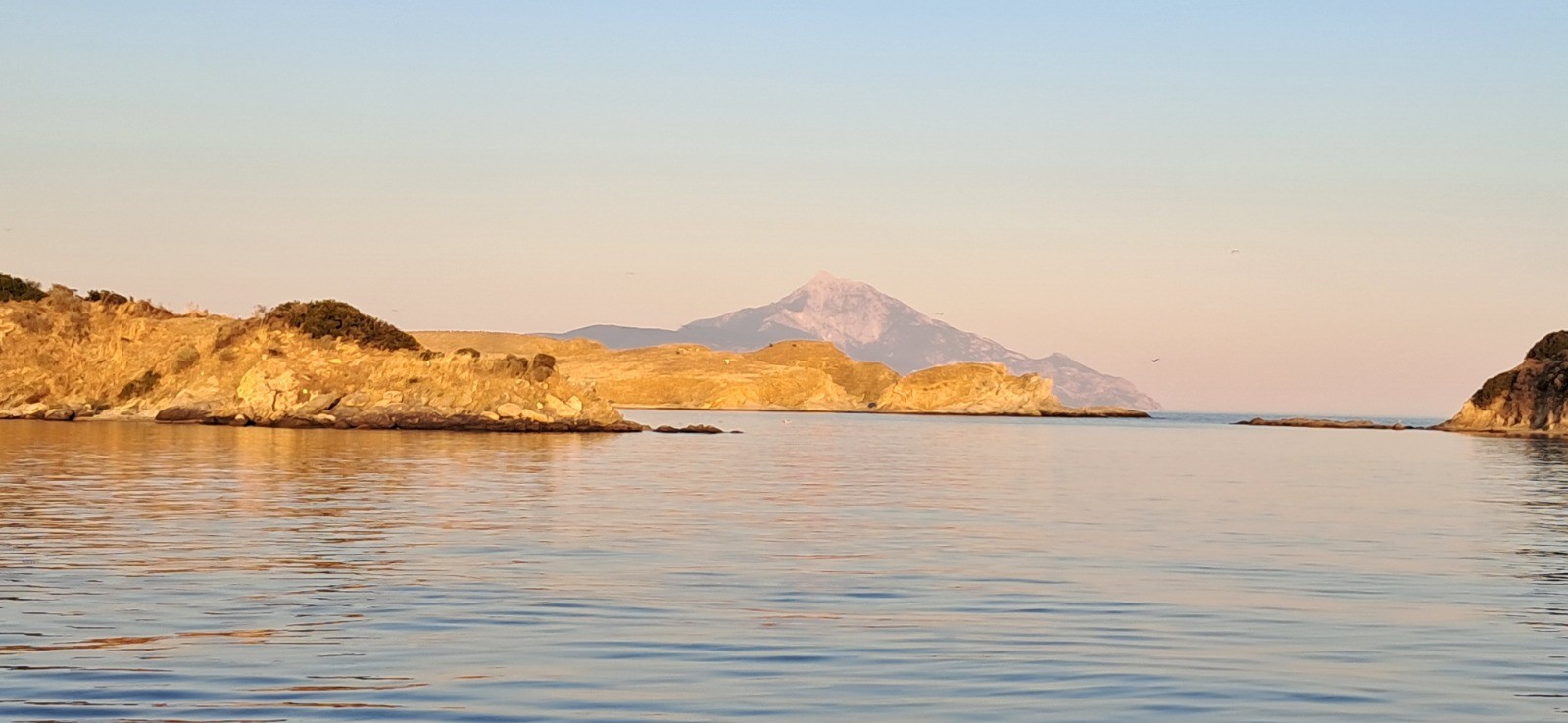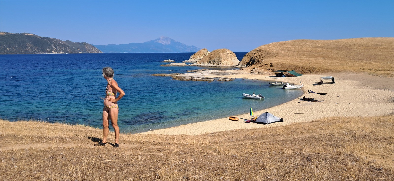 Sans attendre que Maryvonne se lève nous remonton l'ancre. Petit vent de face, nous allon tranquille. Bernard n'a plus confiance au rapala. Ils n'ont rien pris jusqu'à présent. Néanmoins il le met. En train de prendre Sylvie en photo devant le mont athos, Maryvonne surgit du carré en criant : "ça mort !!"