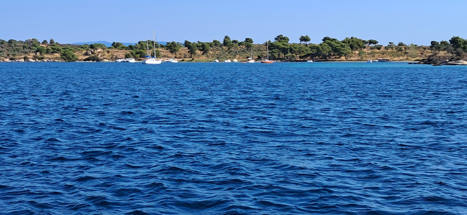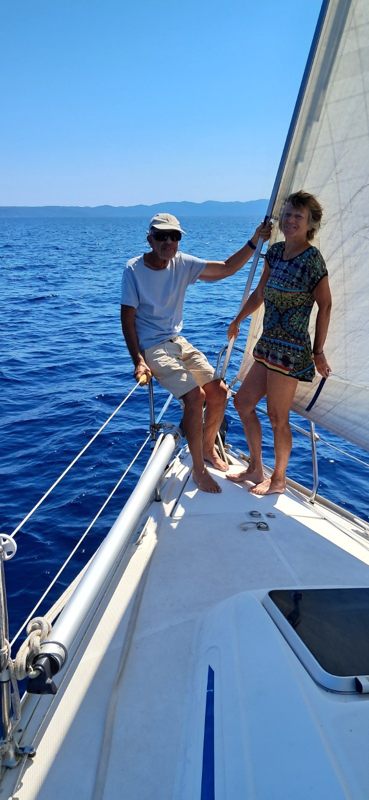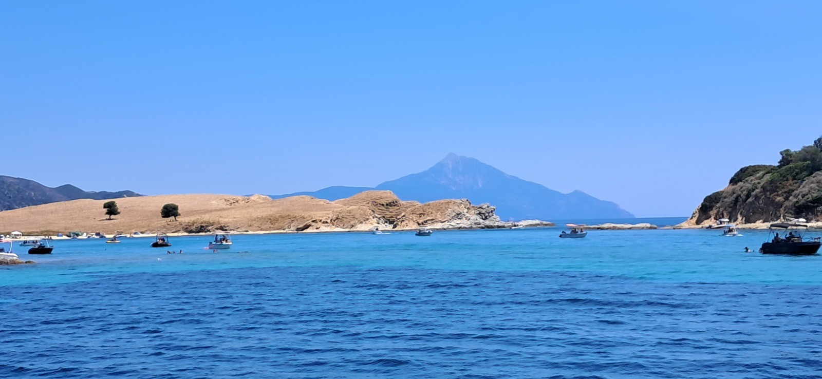 Sans attendre que Maryvonne se lève nous remonton l'ancre. Petit vent de face, nous allon tranquille. Bernard n'a plus confiance au rapala. Ils n'ont rien pris jusqu'à présent. Néanmoins il le met. En train de prendre Sylvie en photo devant le mont athos, Maryvonne surgit du carré en criant : "ça mort !!"