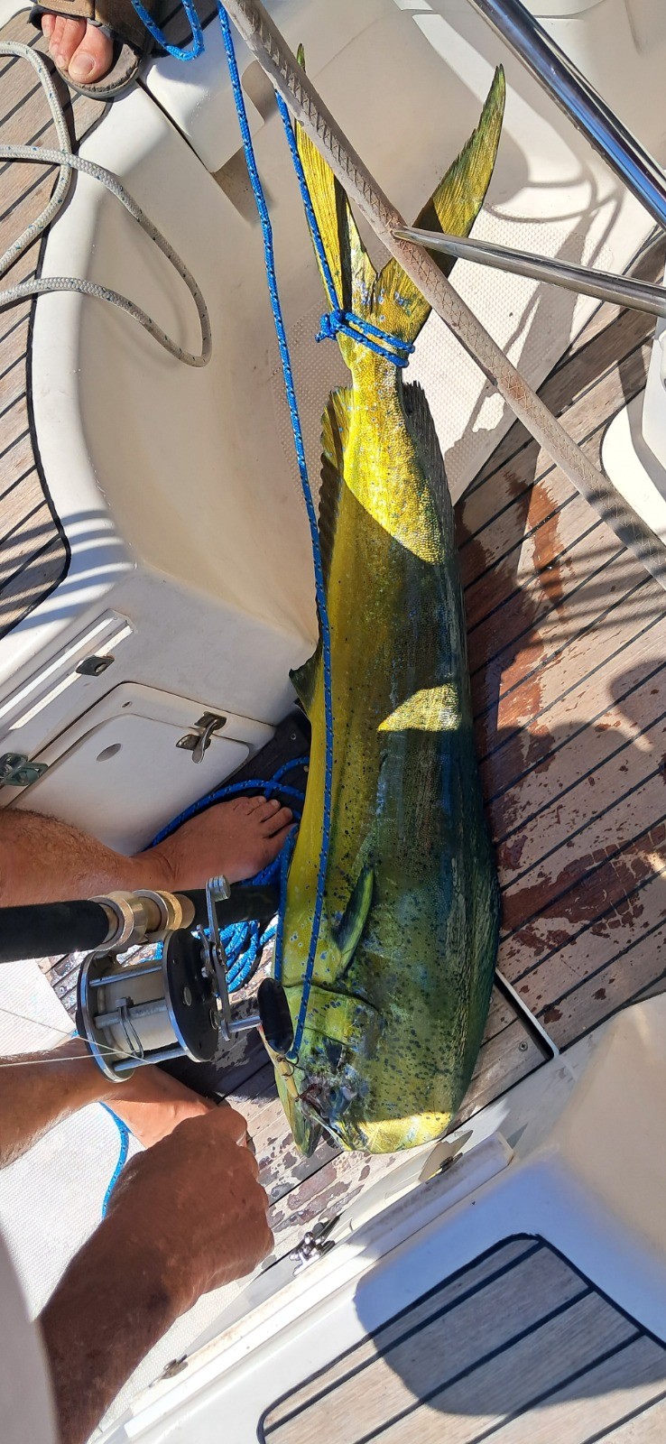 On se mer à la cape et voilà un combat perdu d'avance entre une belle dorade coryphéne (ou mahi-mahi) et Bernard qui nous fera le coup du lasso.