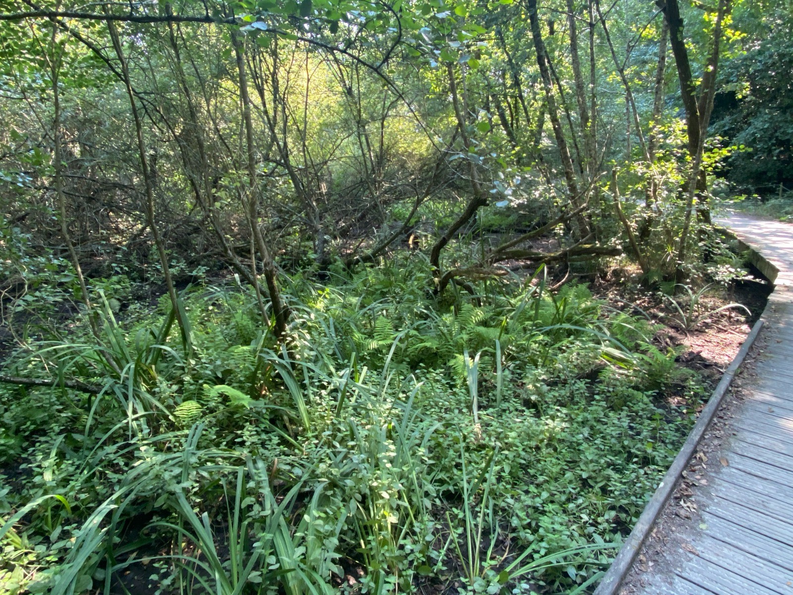 Et en effet kilomètre 5 nous entrons dans une zone légèrement boisée avant de retrouver l'Erdre au kilomètre 7. Le boisement de la Desnerie est composé majoritairement de chênes sessiles et de chênes pédonculés, mais aussi de hêtres, de charmes et de châtaigniers. Sur les rives de l’Erdre et le long du ruisseau qui traverse le bois, là où les sols sont plus humides, on trouve aussi des saules, des aulnes et des frênes.