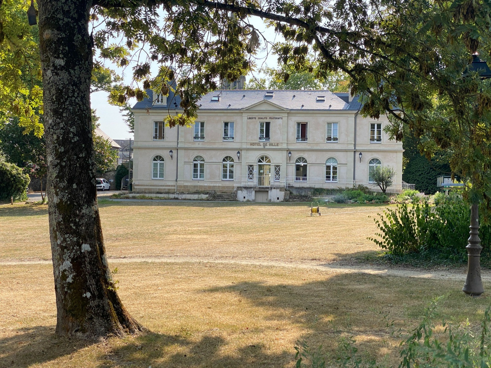 Sa façade se devine à travers les arbres, offrant un cadre pittoresque et apaisant.