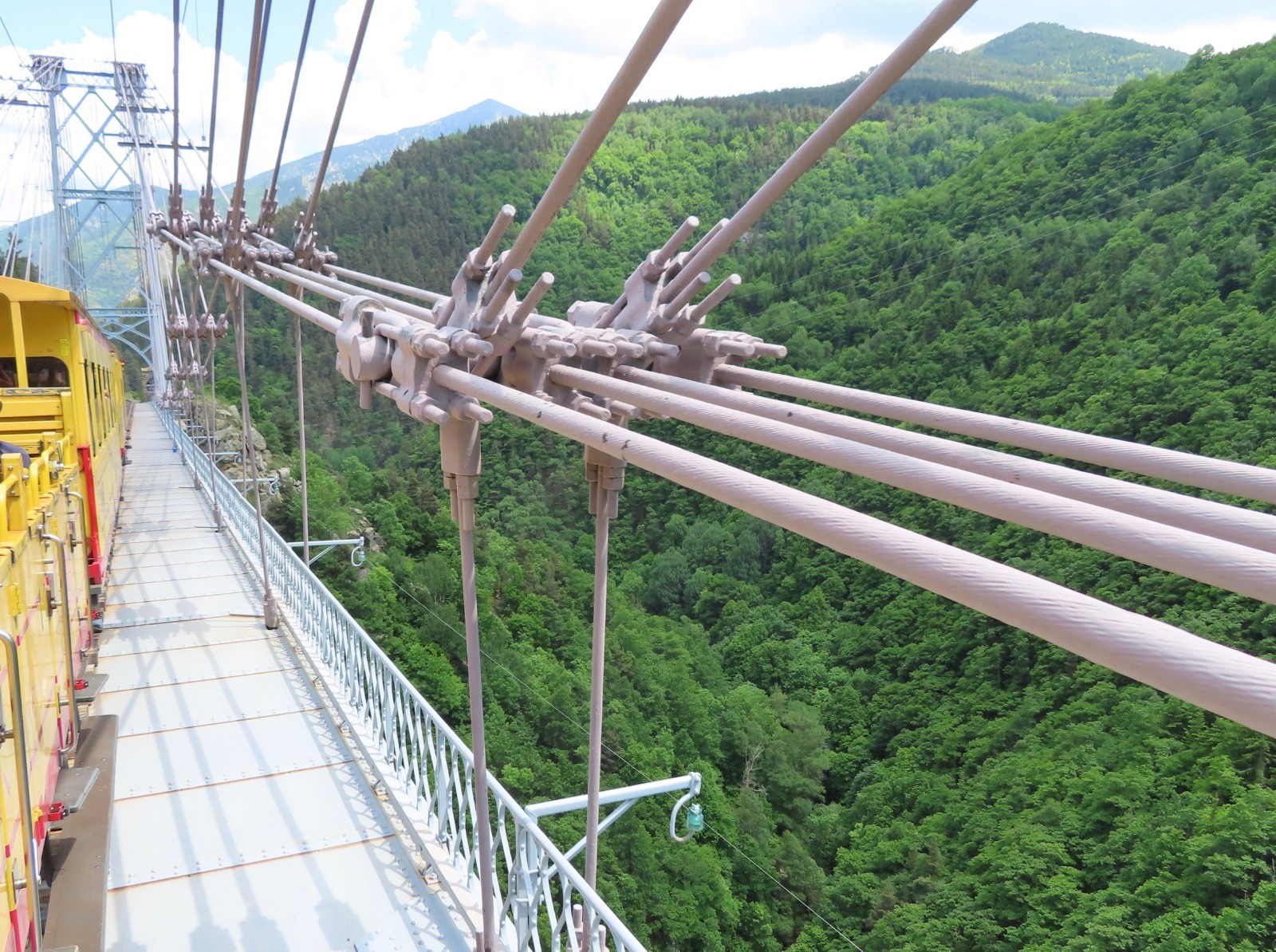 Sur le parcours du train jaune, on dénombre 650 ouvrages d'art, dont 19 tunnels et deux ponts tout à fait remarquables : le pont Séjourné et le pont Gisclard, premier pont suspendu au monde. D'une conception impressionnante pour l'époque, il est l'emblème de la ligne. Il a une longueur totale de 234 mètres et une hauteur de 80 mètres, sa construction a duré deux ans, de 1906 à 1908.